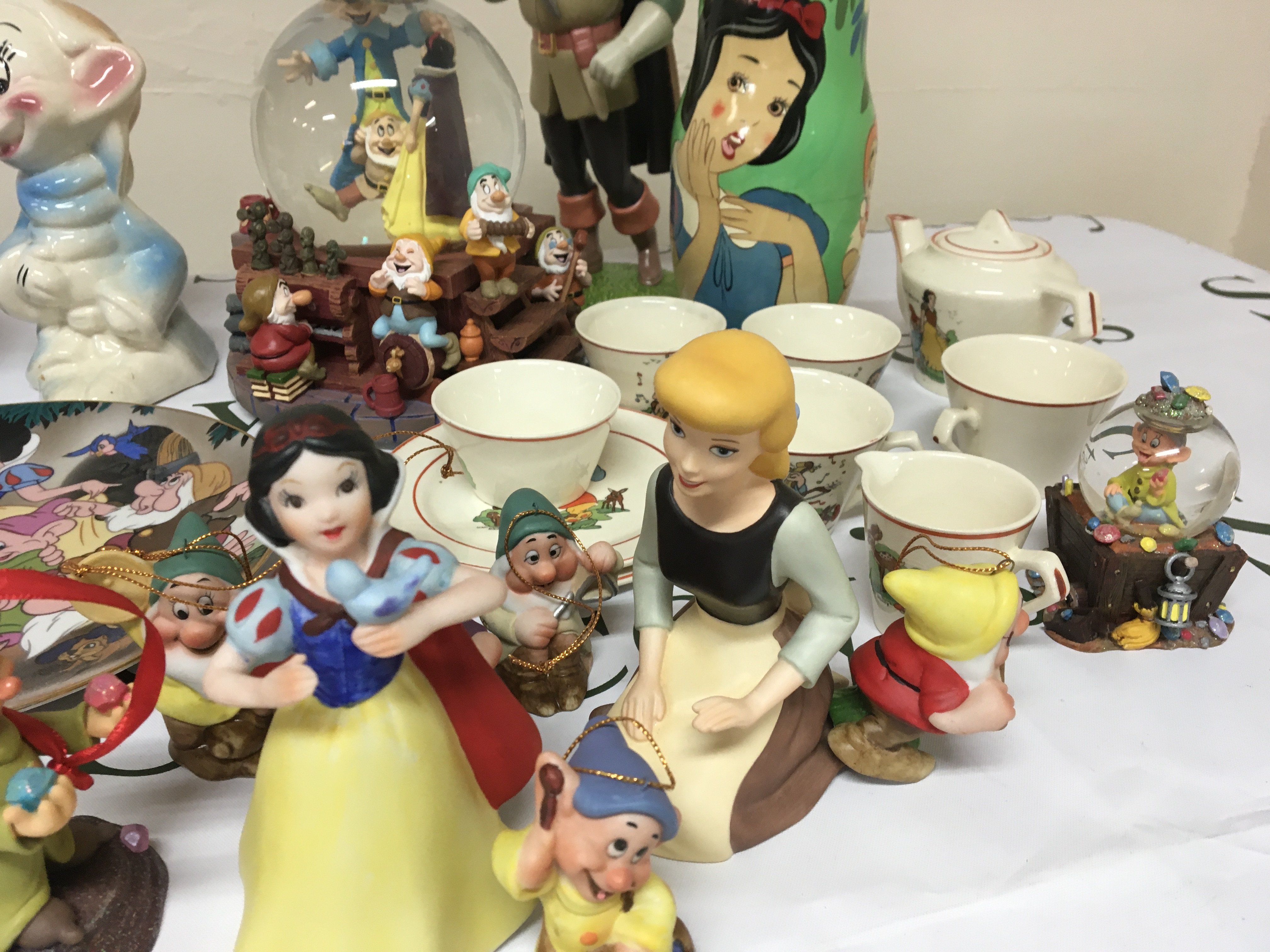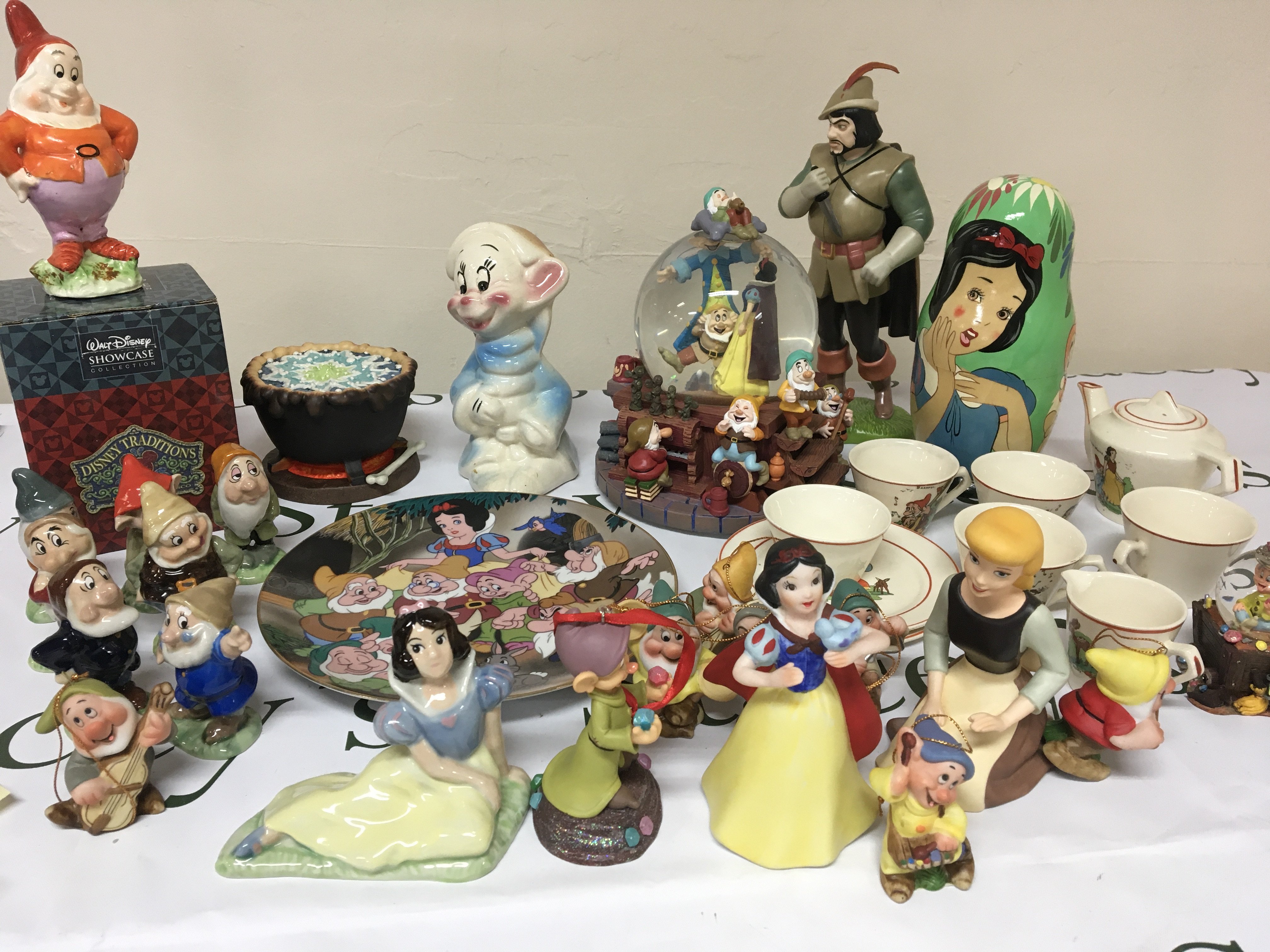 A collection of Disney Snow White and the seven dwarfs figures Wade and Disney Classic and a vintage child's tea set and other conforming items.