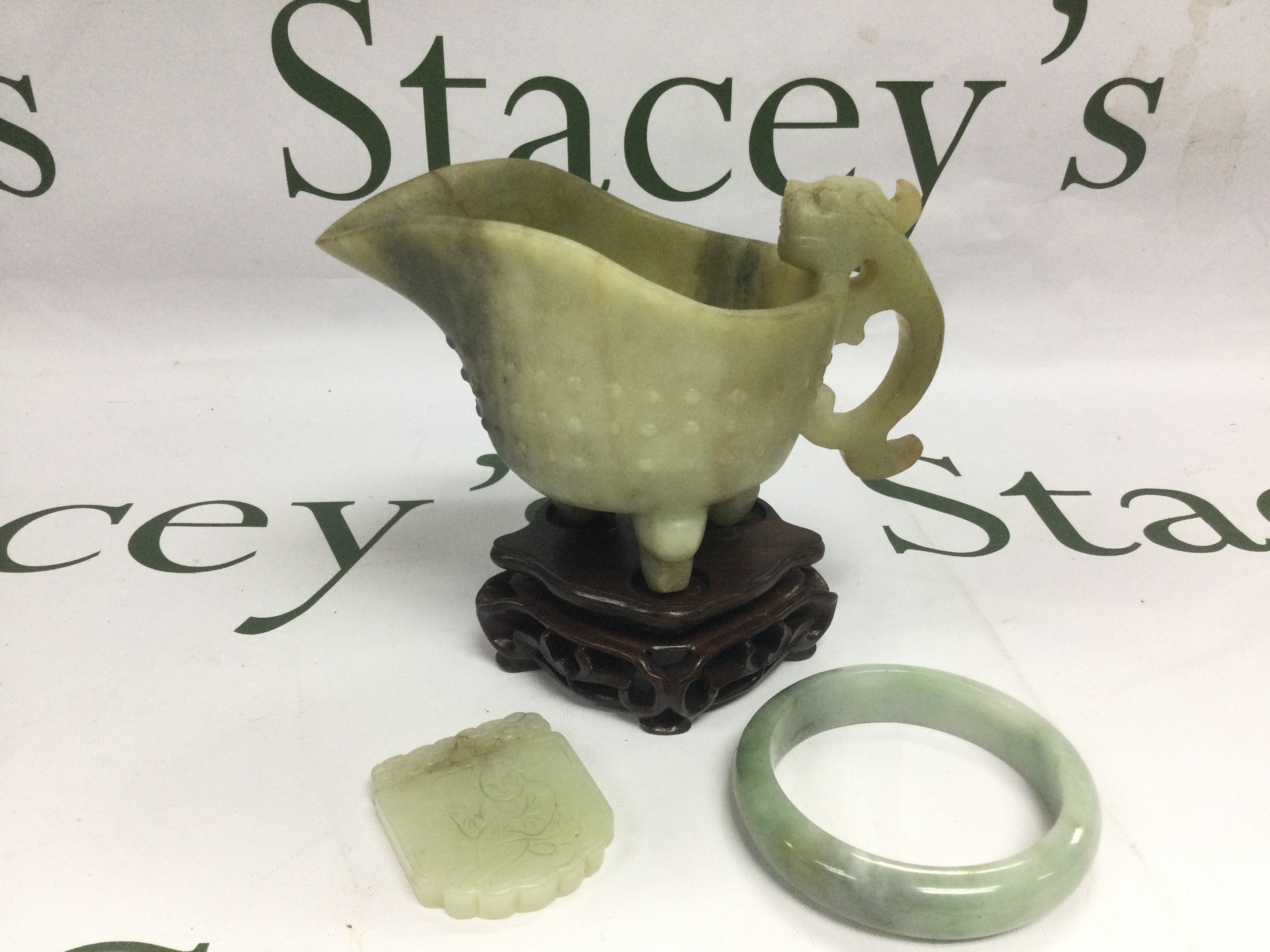WITHDRAWN - Three jade items comprising a carved jug, raised on a hardwood stand, a bangle etc. Shipping category D.