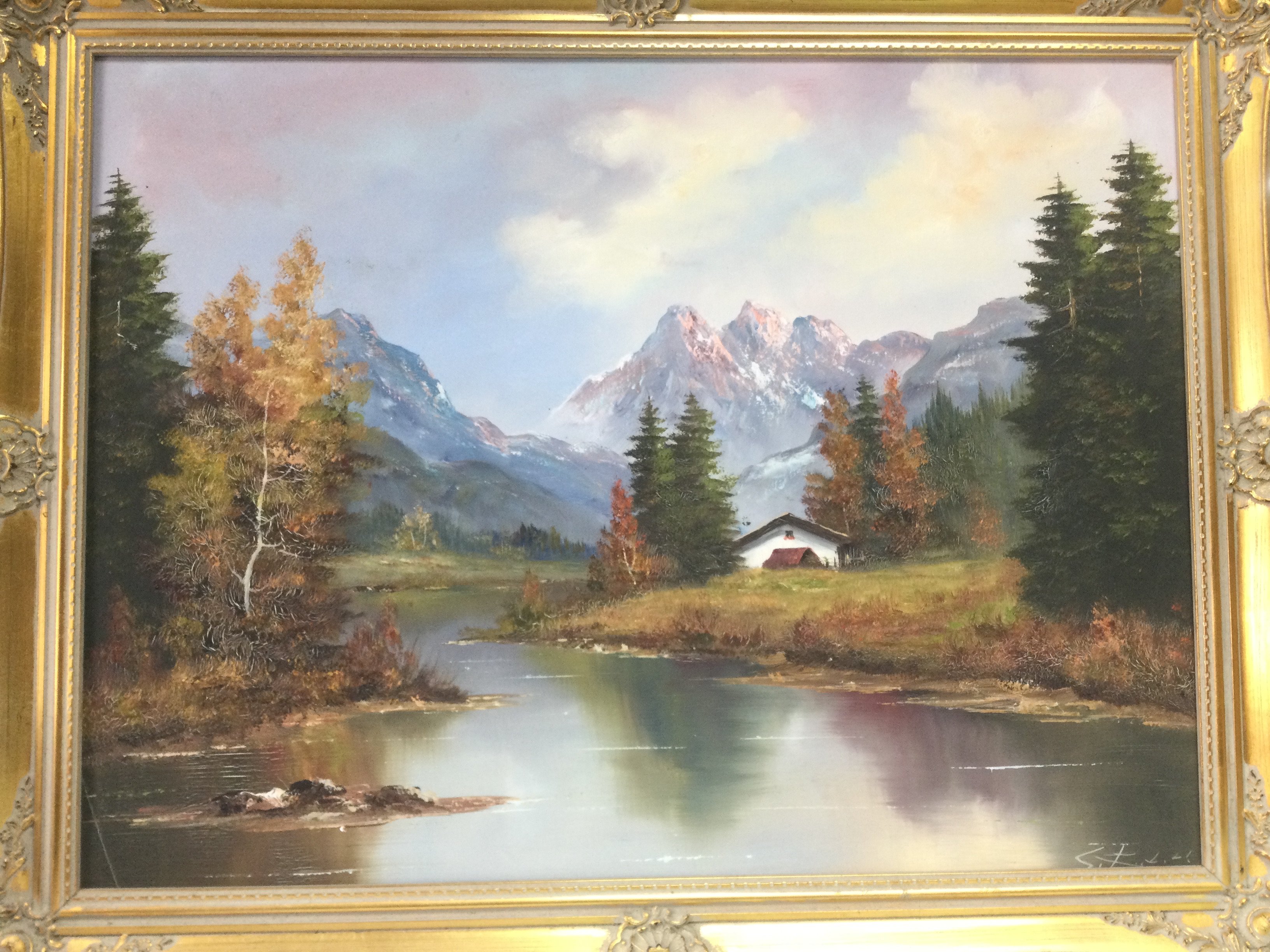 A gilt framed oil on canvas landscape painting with mountains in the background, approx 93cm x 73cm. Shipping category D.