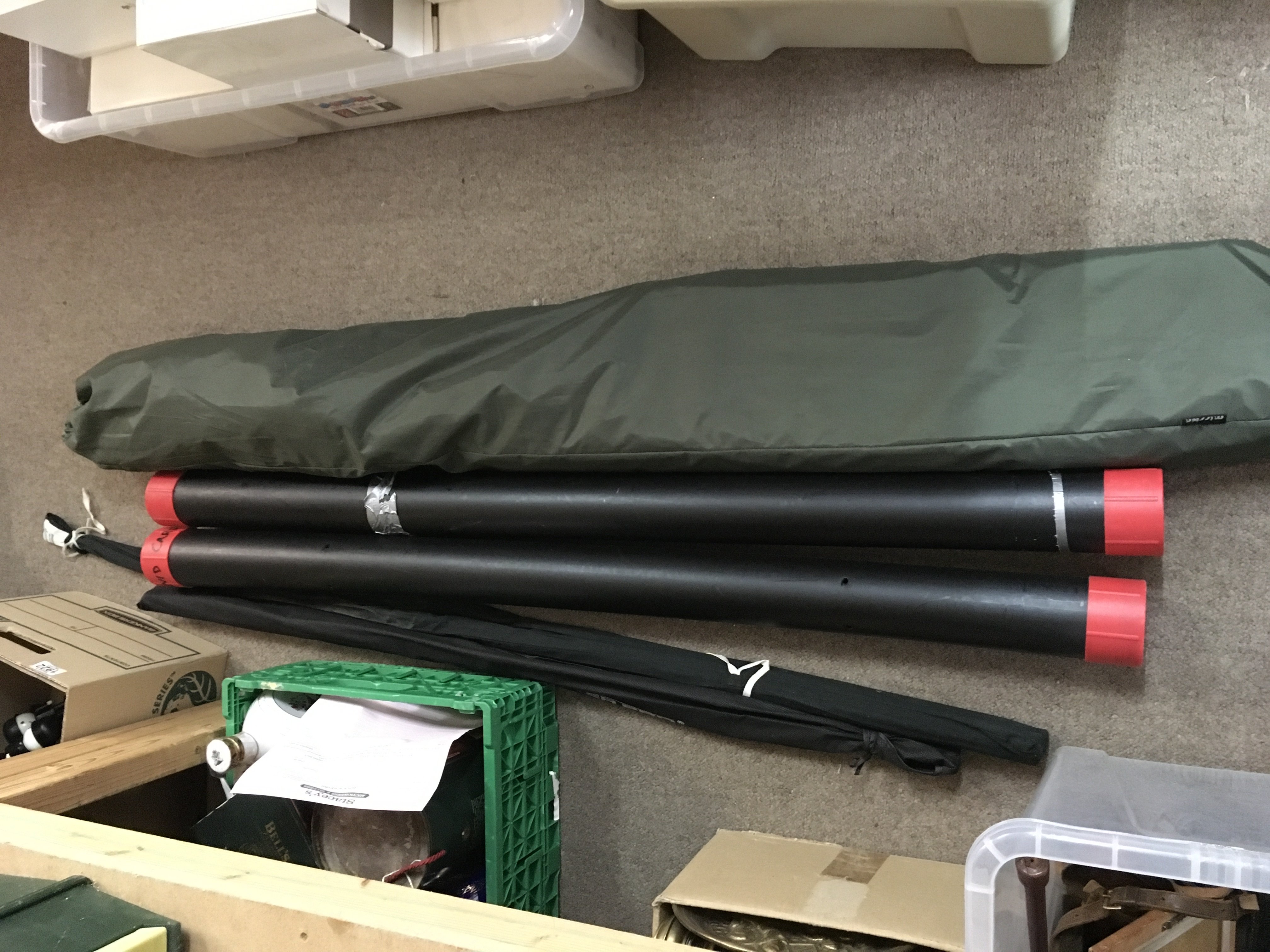 Four fishing rods and a Daiwa shelter . Shakespeare O-Series Graphie glass 1870-285 rod, Hunter Pro feeder 33, Angling Pursuits Float Max 10ft rod, NGT Carp max 12ft