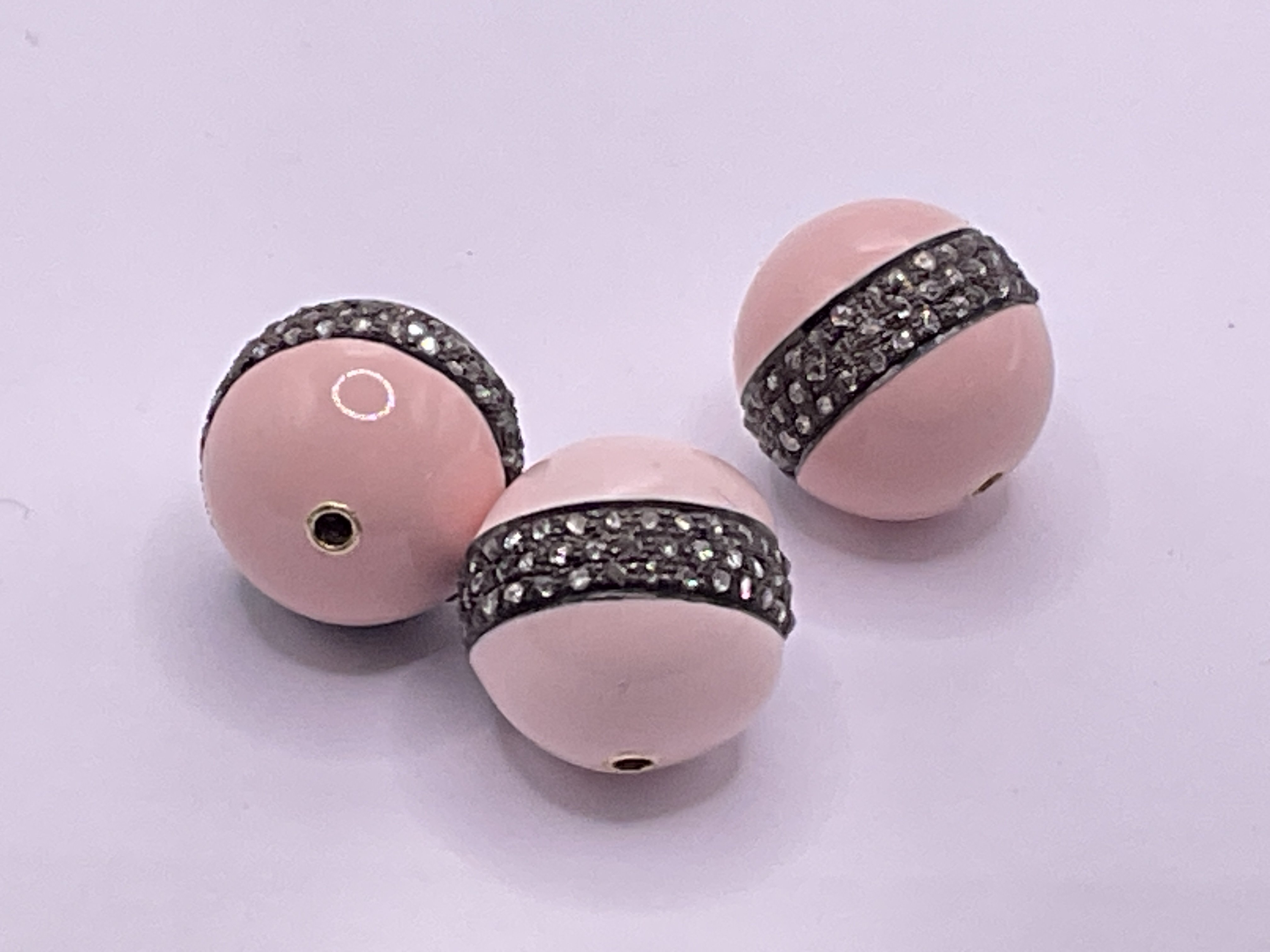 3 silver powder pink enamel beads each set with 3 rows of diamonds. Total diamonds 1.35ct (0.45ct each bead). Postage category A.