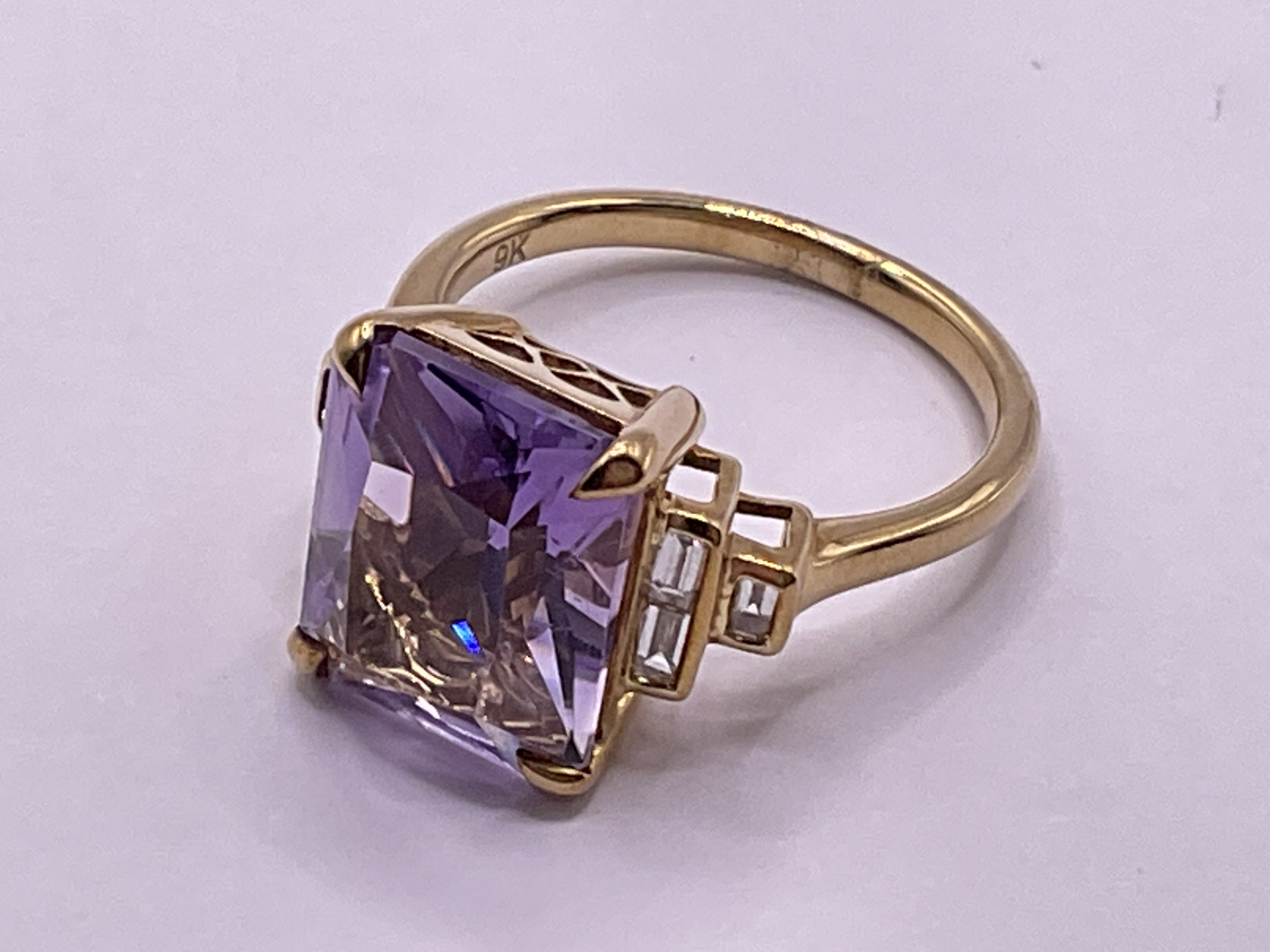 9ct yellow gold ring set with a large rectangular amethyst flanked by baguette cut diamonds. Amethyst 5.68ct. Diamonds 0.23ct. Ring size approx N. Postage category A.