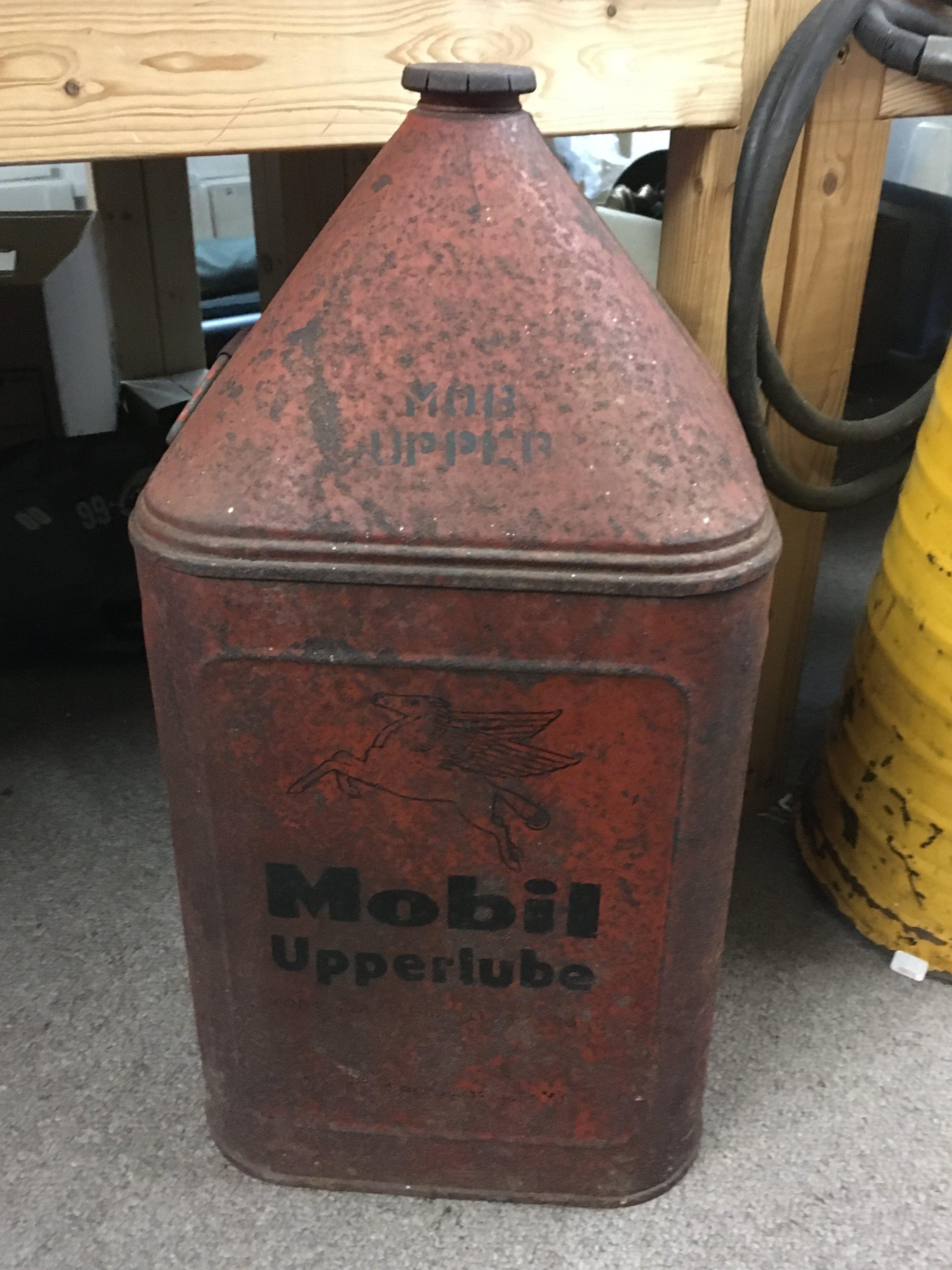 A vintage pyramid 5 gal Mobil oil upper lube oil drum.