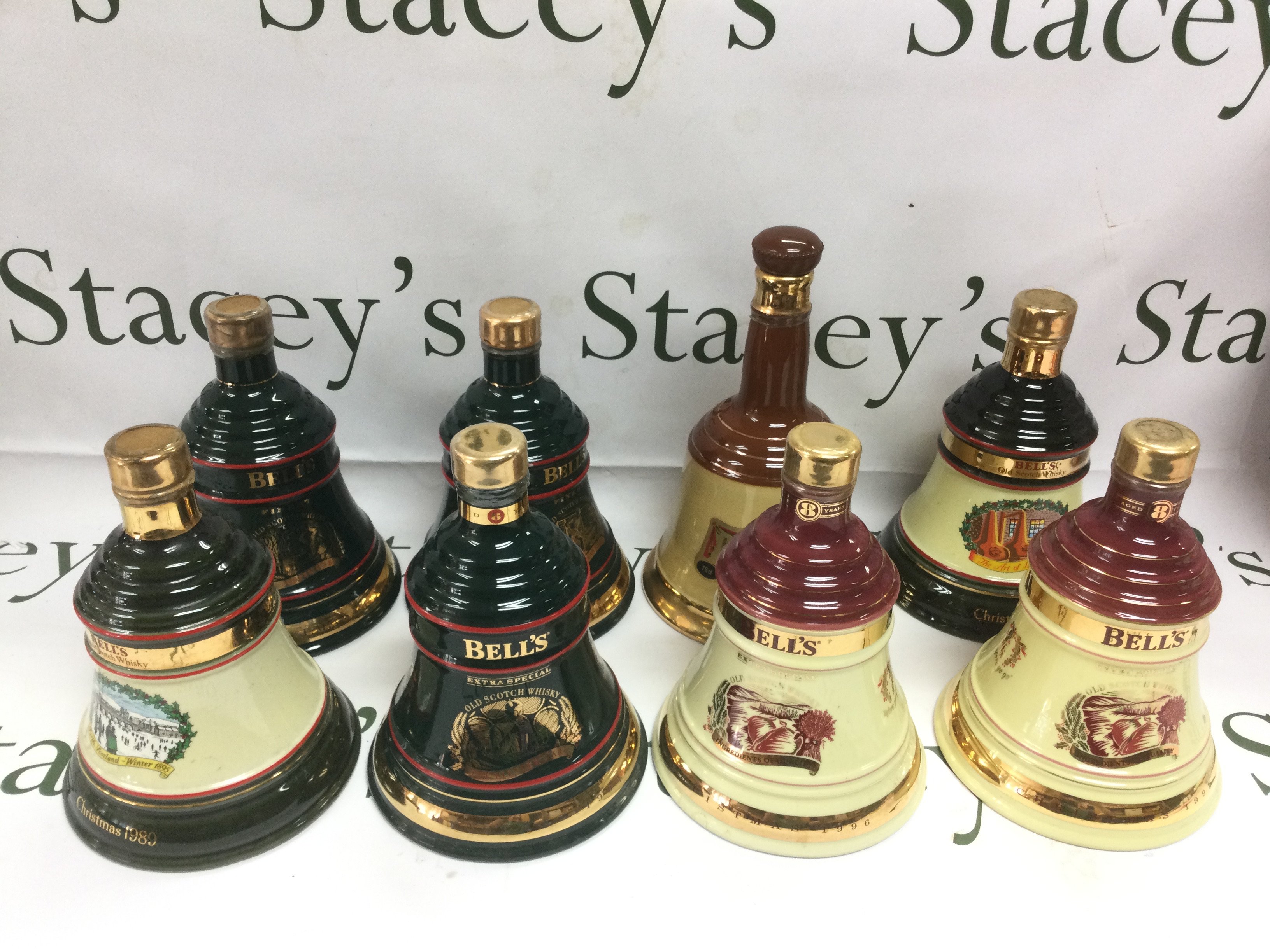 Eight decanters of Bell's Whisky including Extra Special and Christmas examples, Seven sealed, one empty. Shipping category D.