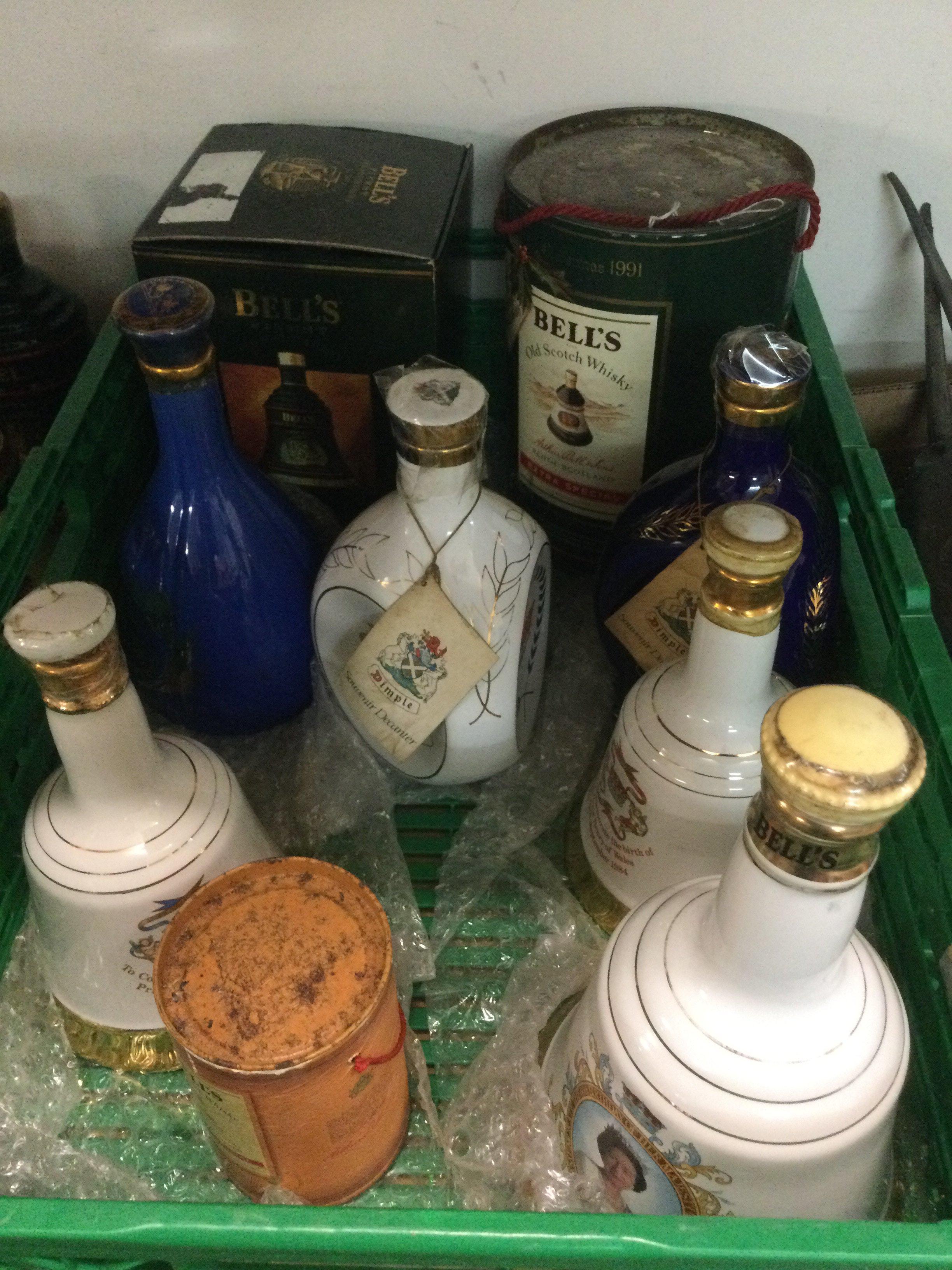 A box of Whiskey in decanters comprising mainly Bell's examples. Shipping category D.