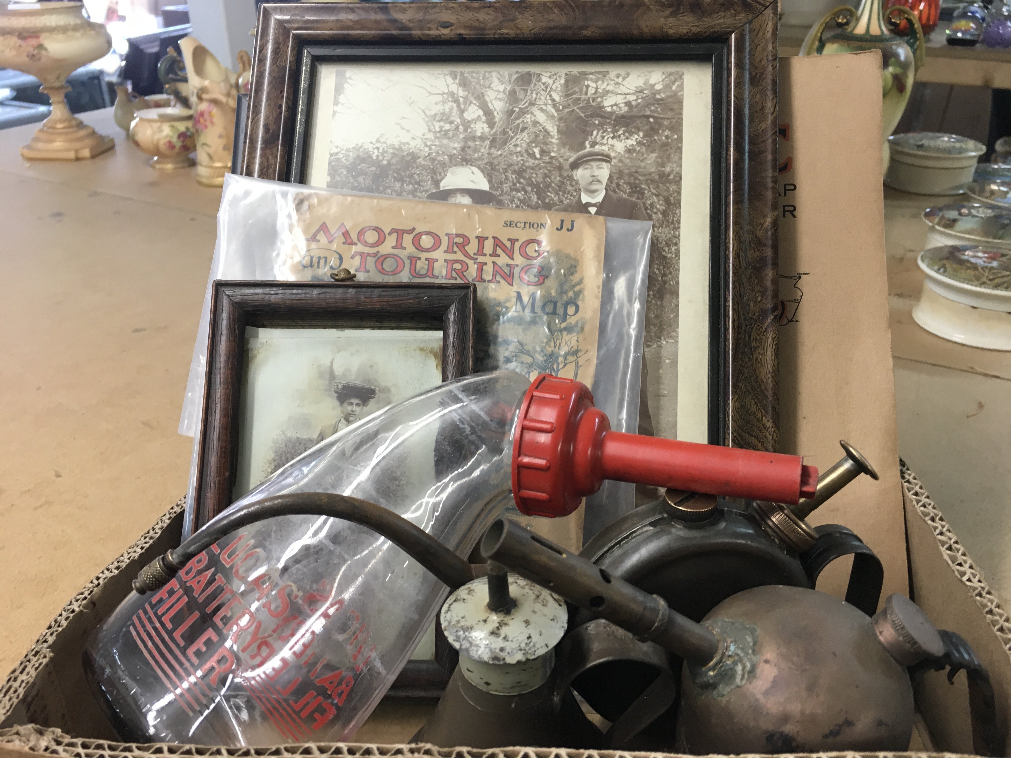 Various early photos of bikes and cars , battery filler and two smaller oil squirty cans