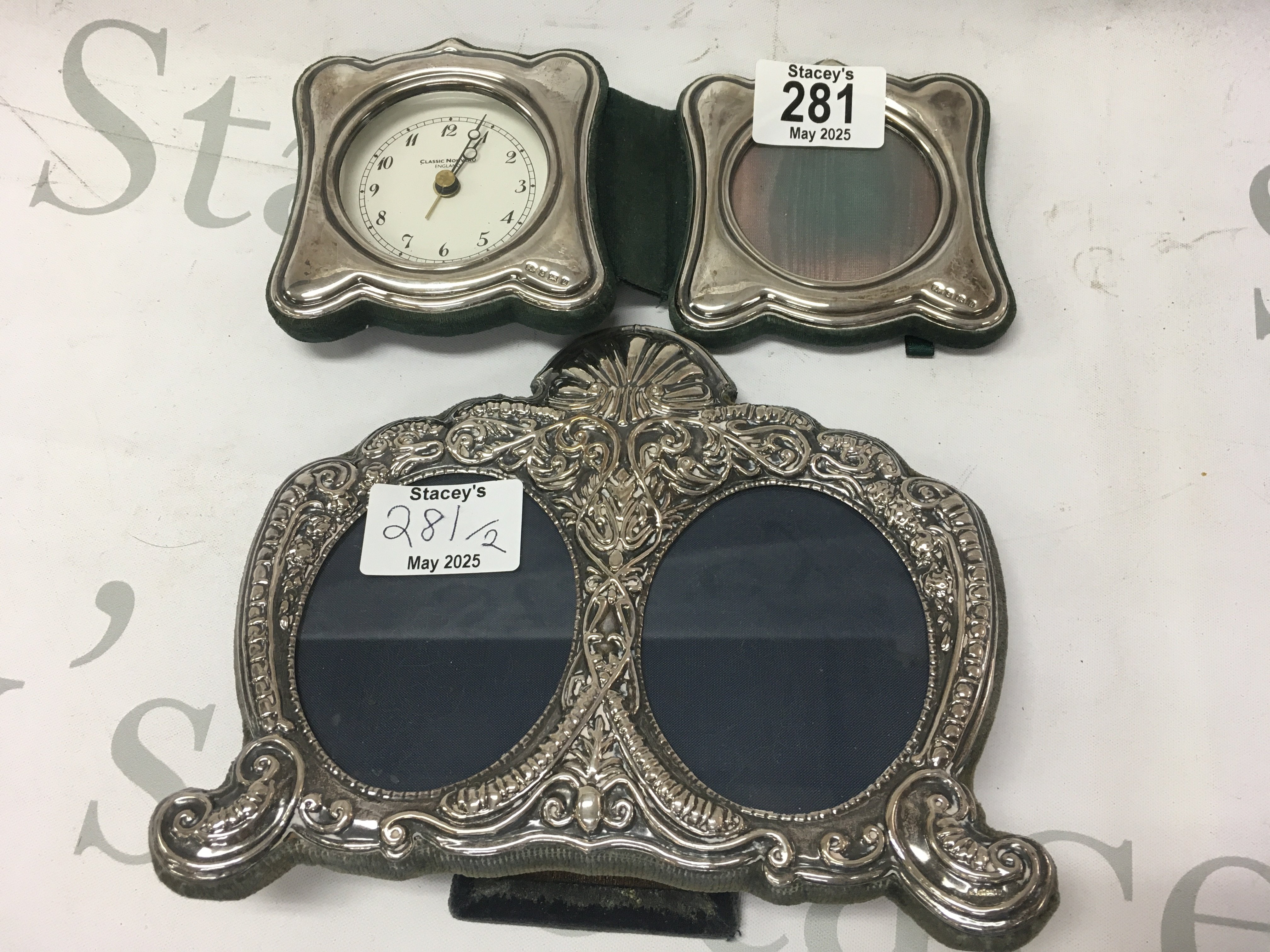 A silver double photo frame together with a silver desk clock and photo frame.