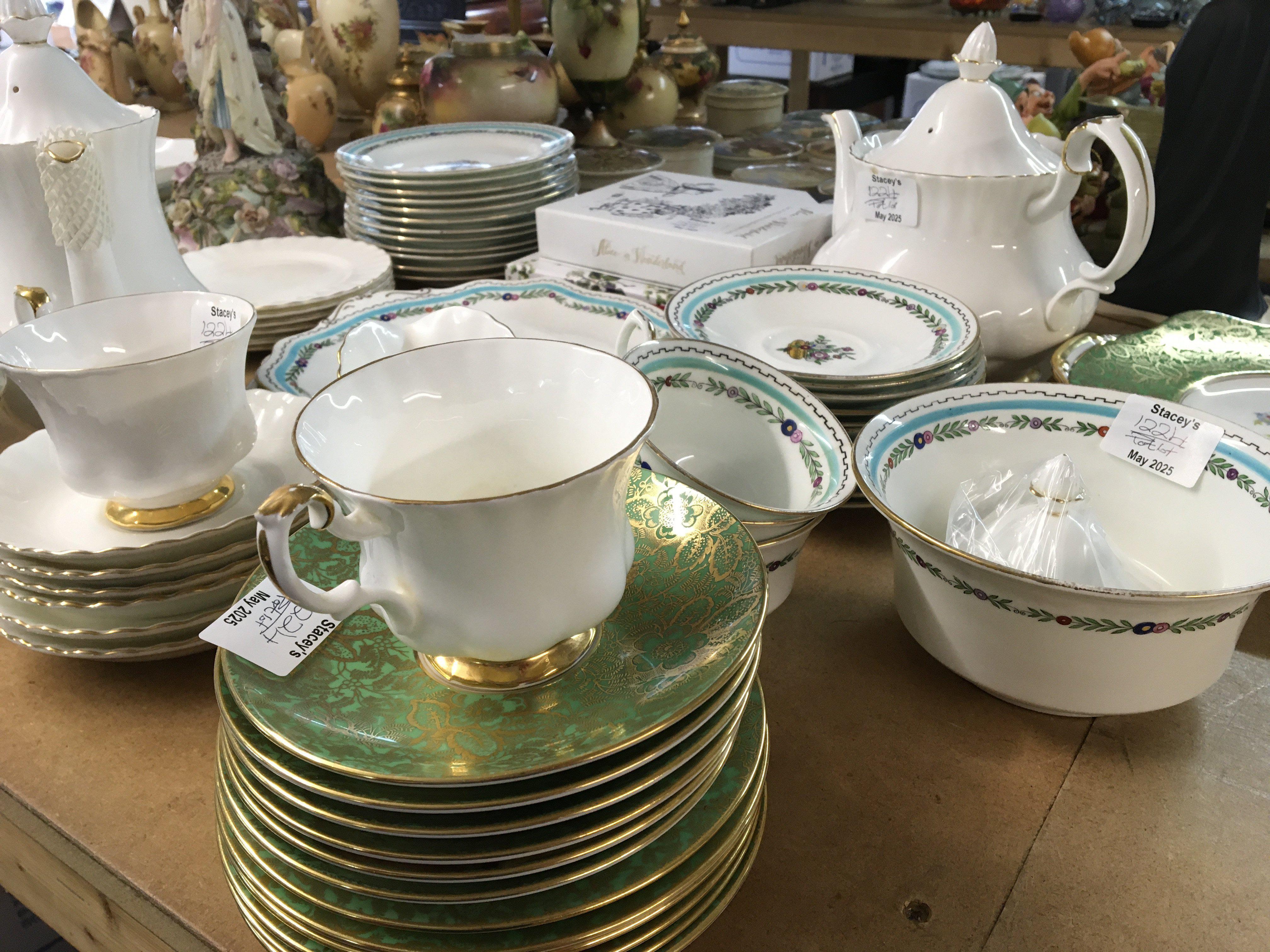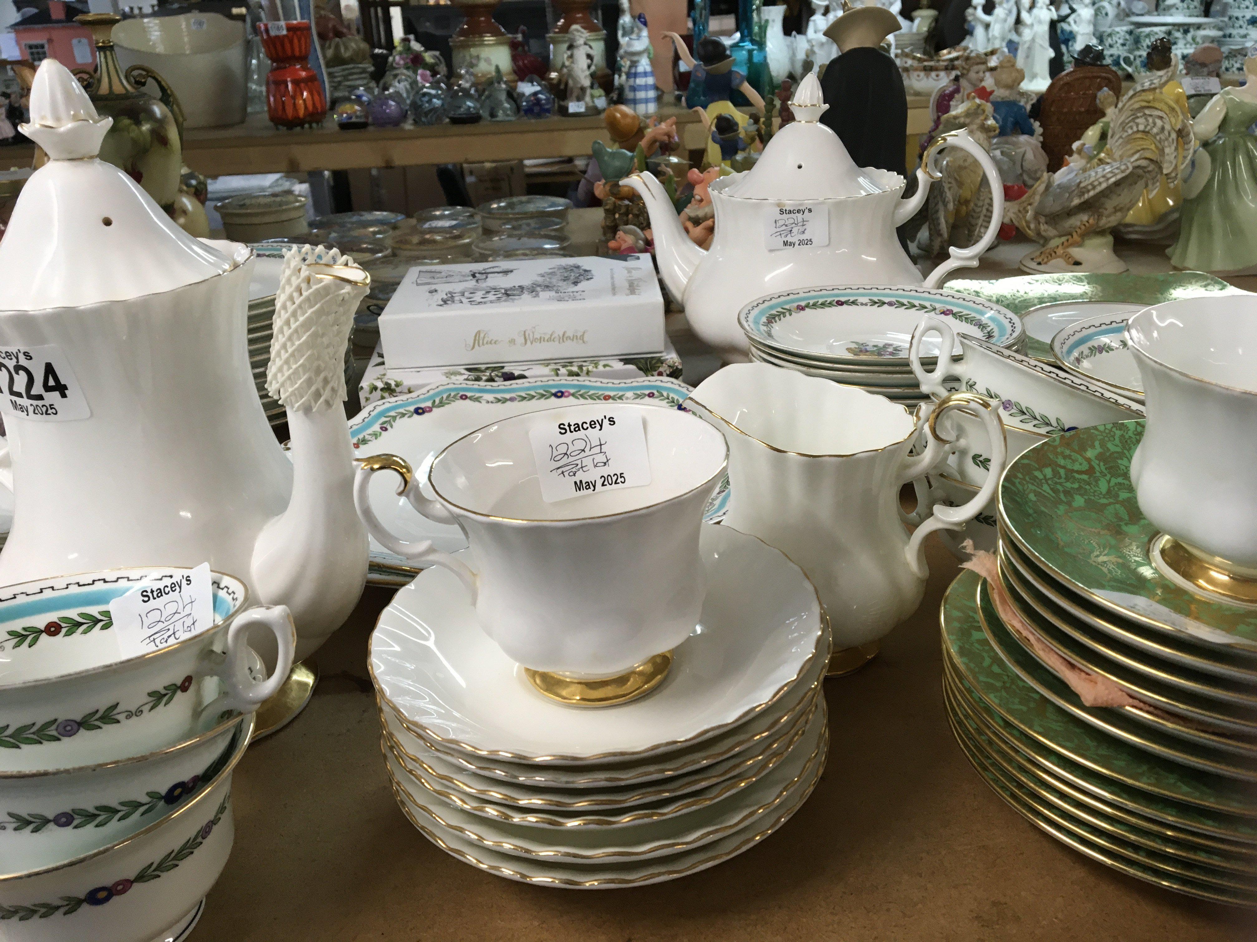 A collection of tea sets and plates a white and gold Royal Albert tea and coffee set Taunton china tea set Minton plates and other best bone china and oddments.