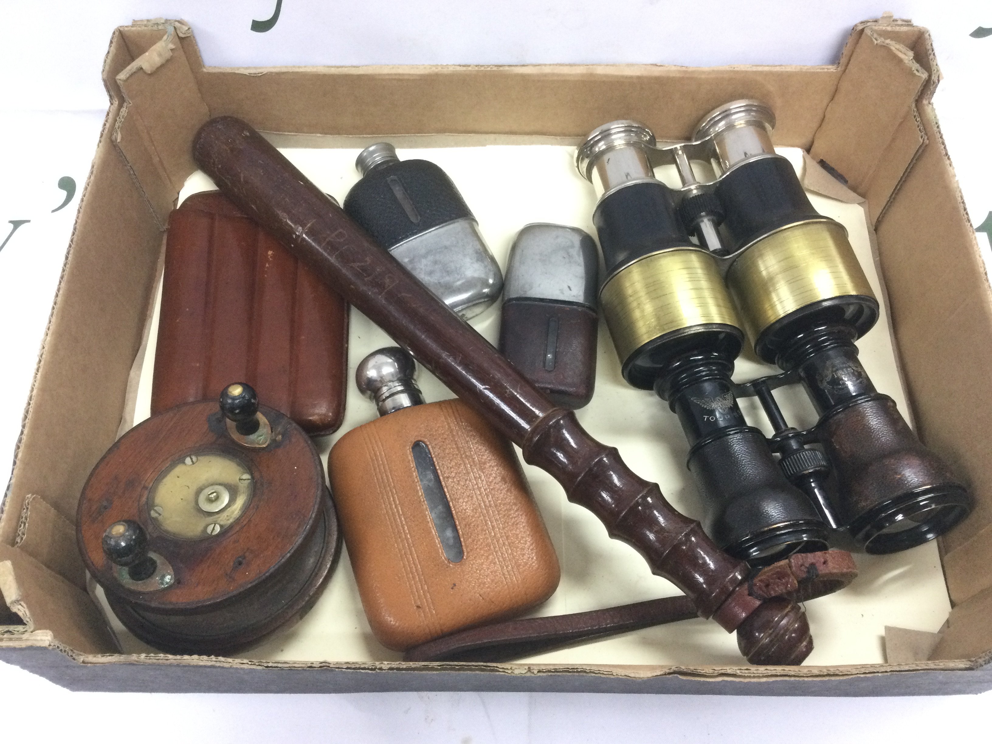 A box of oddments comprising an old police truncheon, hip flask, binoculars etc. Shipping category D.
