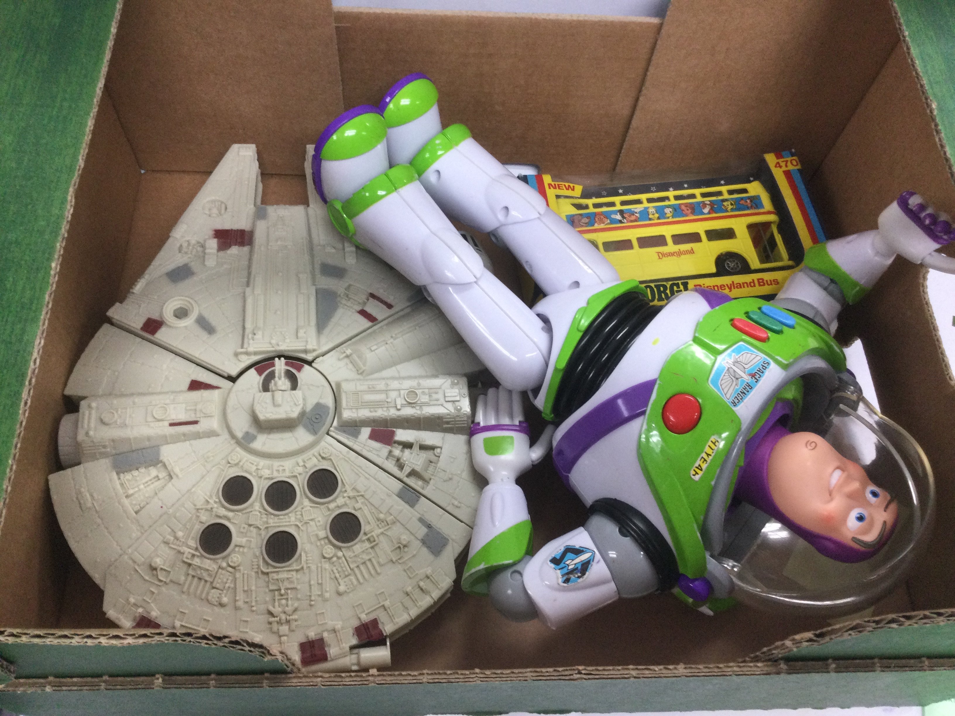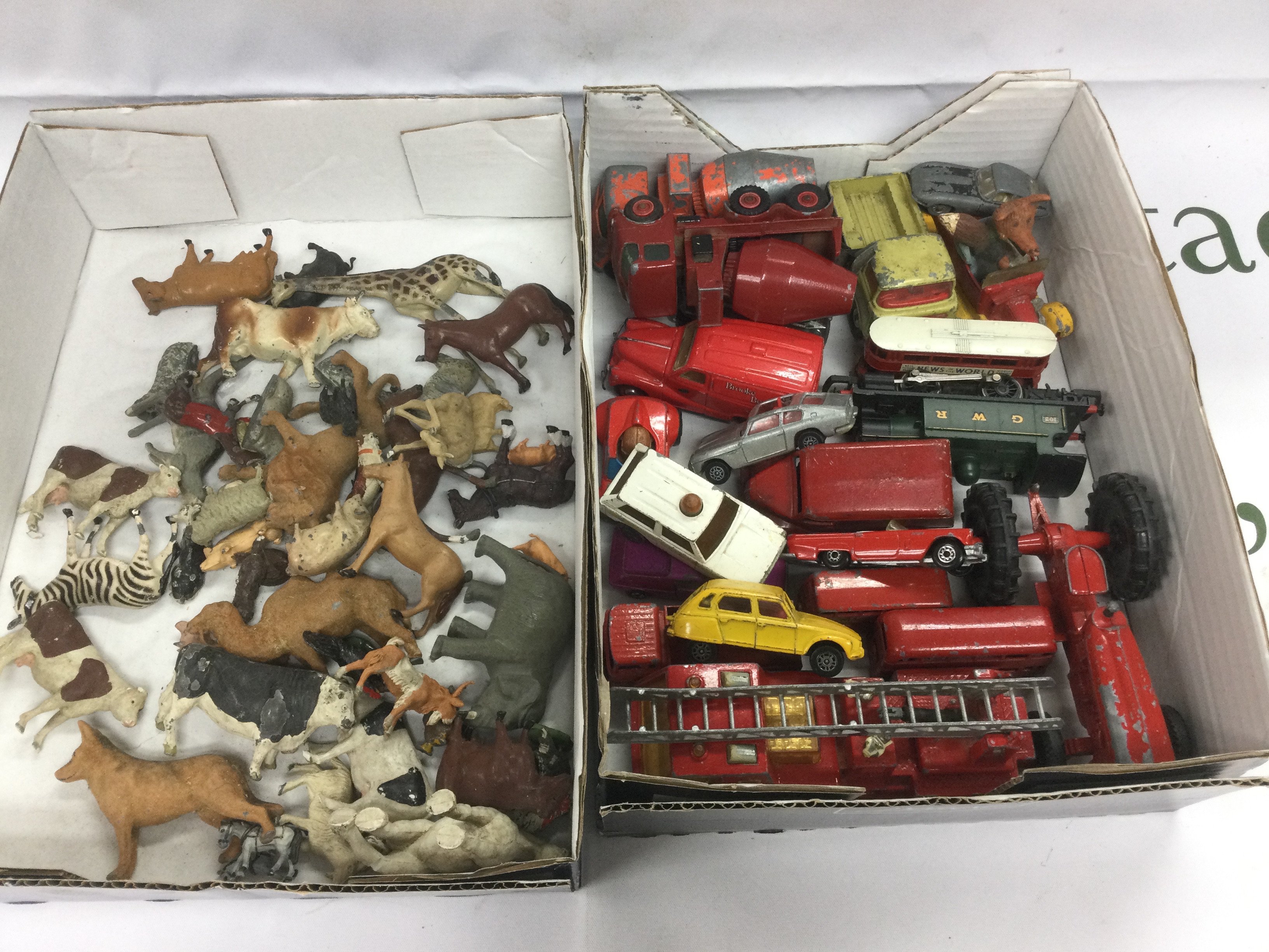 Three boxes of vintage toys including lead farm animals, die cast vehicles etc. Shipping category D.