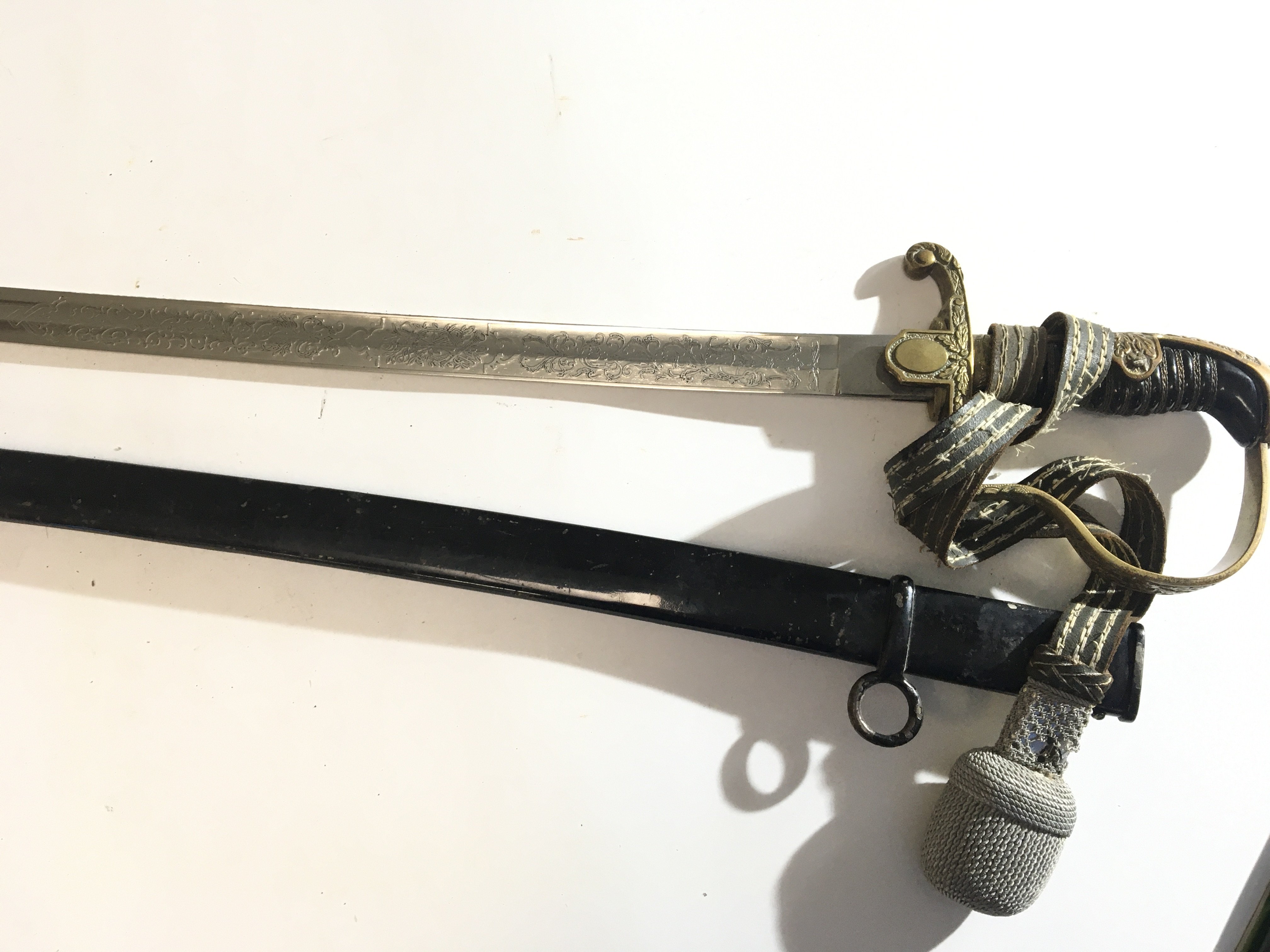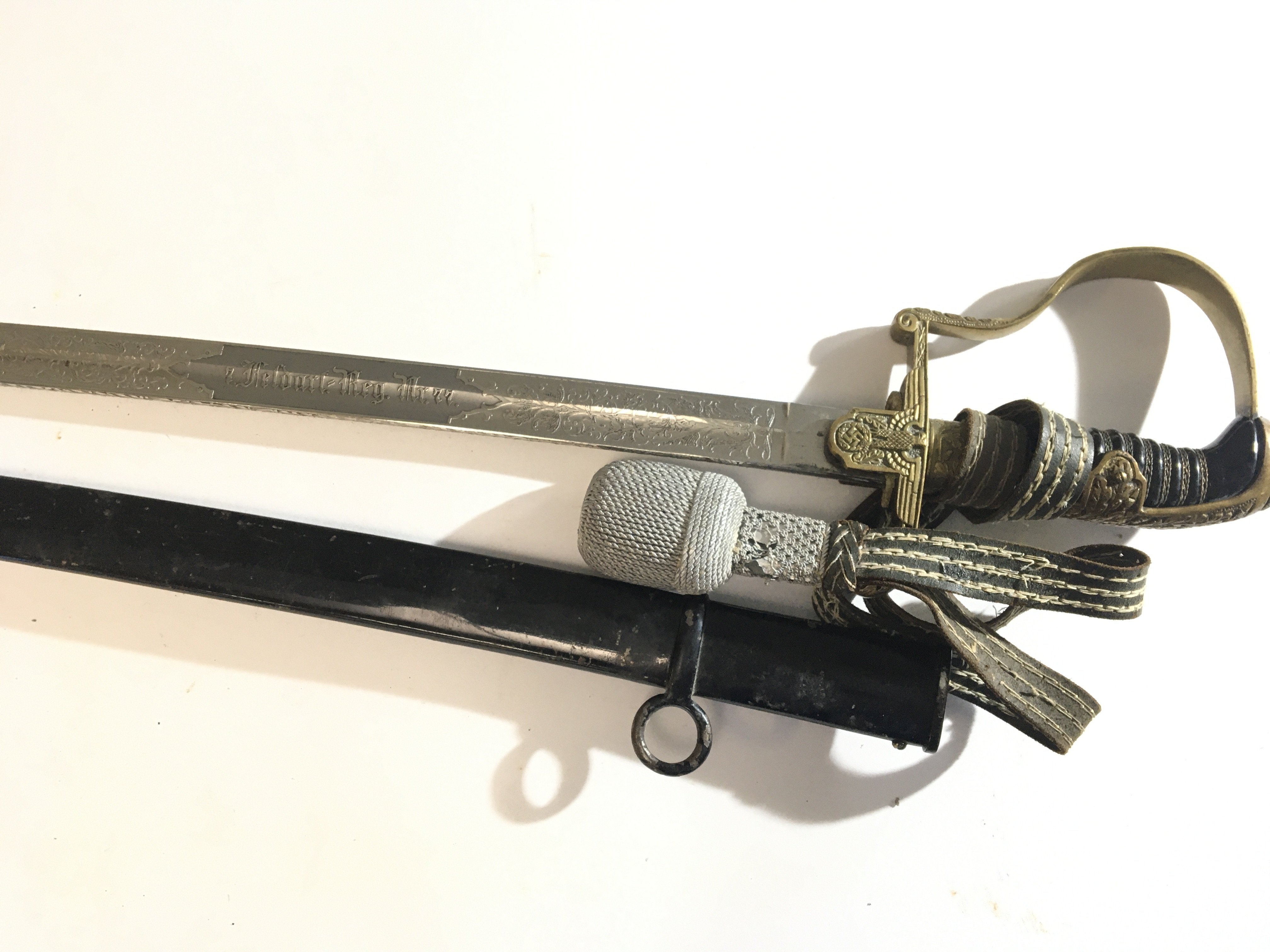 A German Third Reich Military officers dress sword with a brass grip with Swastika and attached pommel the blade with ornate double sided and edge pattern Fullered with slightly curved blade. Good condition.