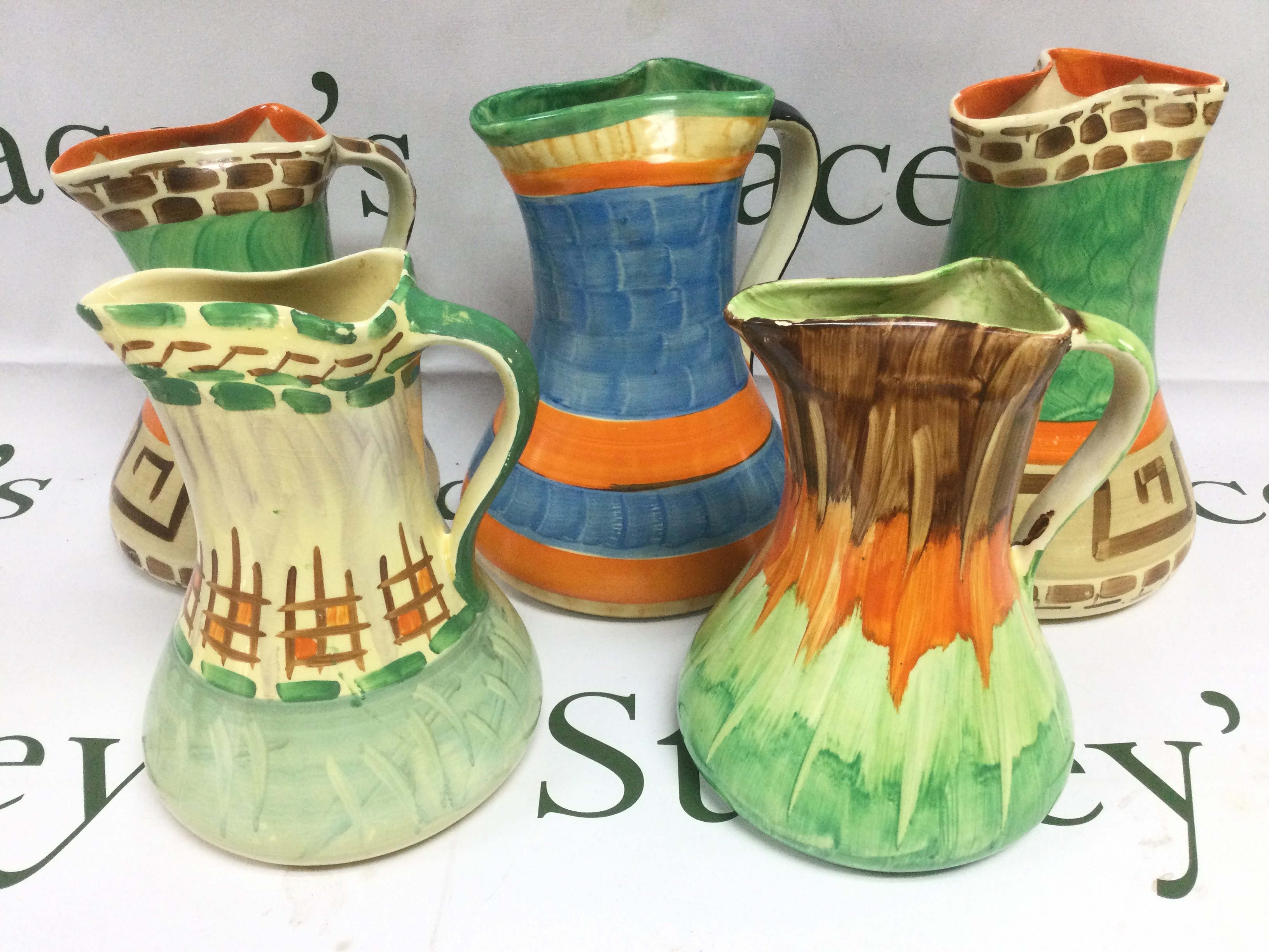 Five Myott & Son pinched neck pottery jugs, tallest approx 20cm. Shipping category D.