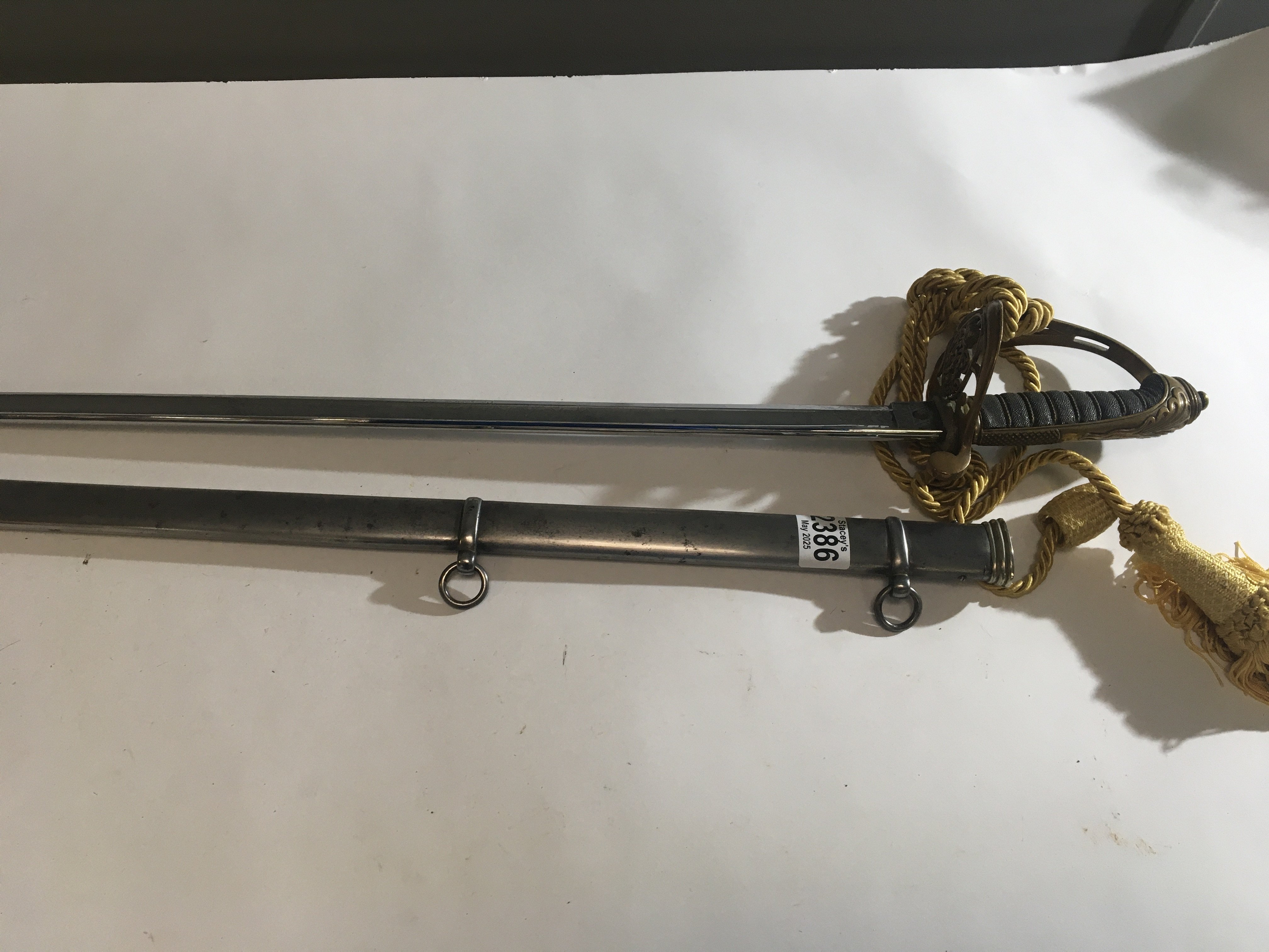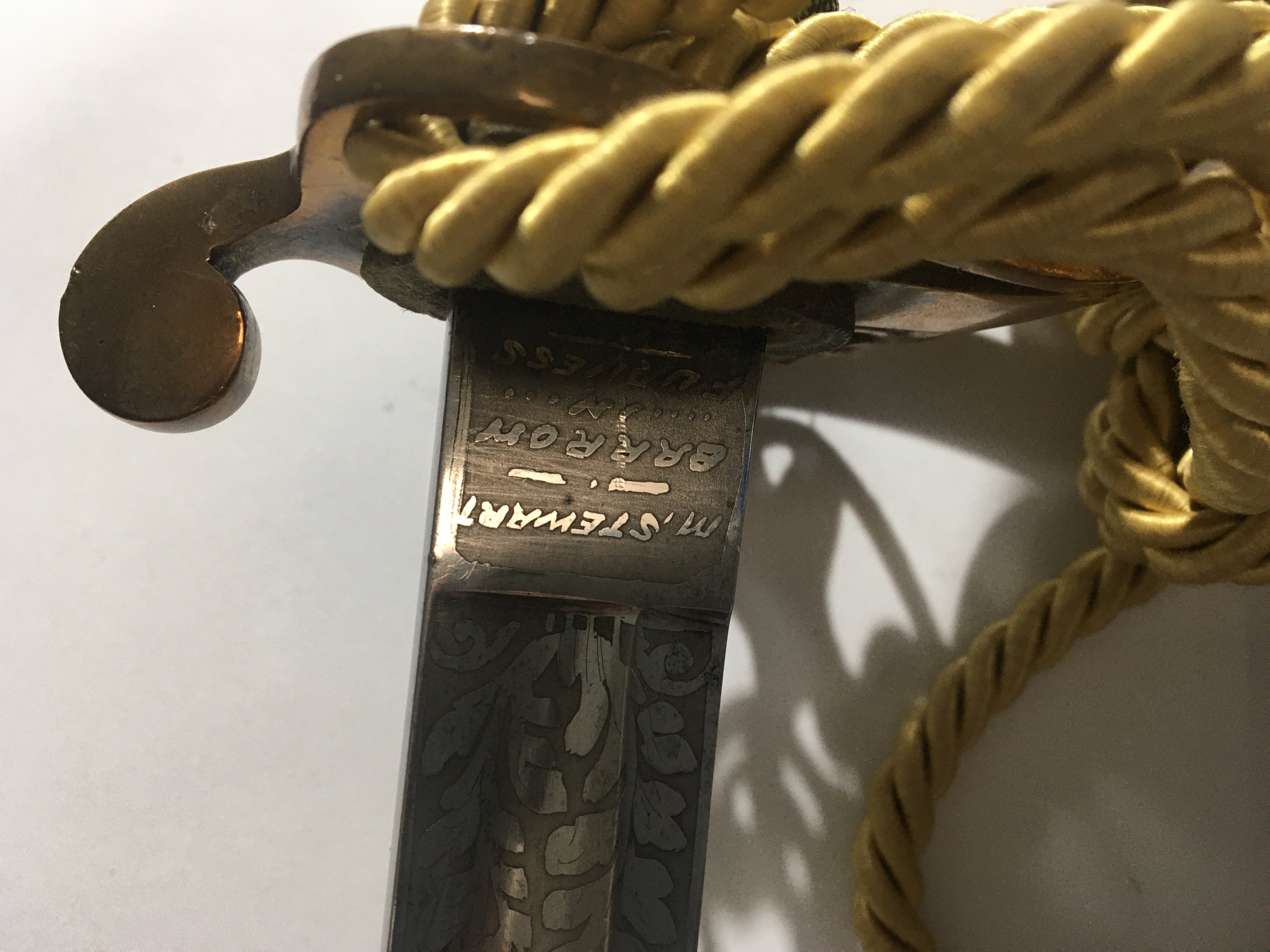 A Victorian officers Cavalry Sword with a brass cross guard with Victorian Cypher bound grip the blade with further ornamentation maker M Stewart Barron in Furness steel scabbard.
