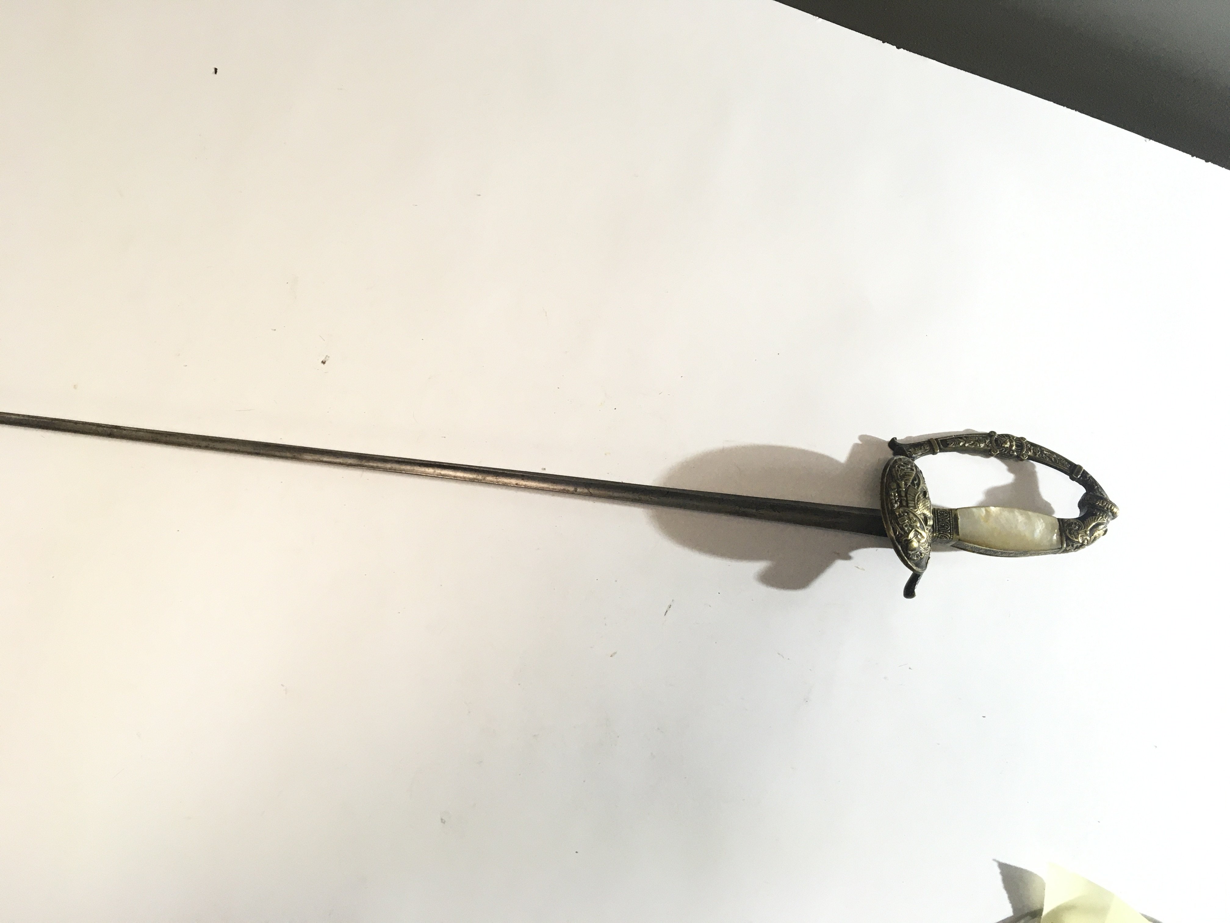 A Court sword possible Italian with mother of pearl grip with ornamentation of Roman influence and patterned blade.