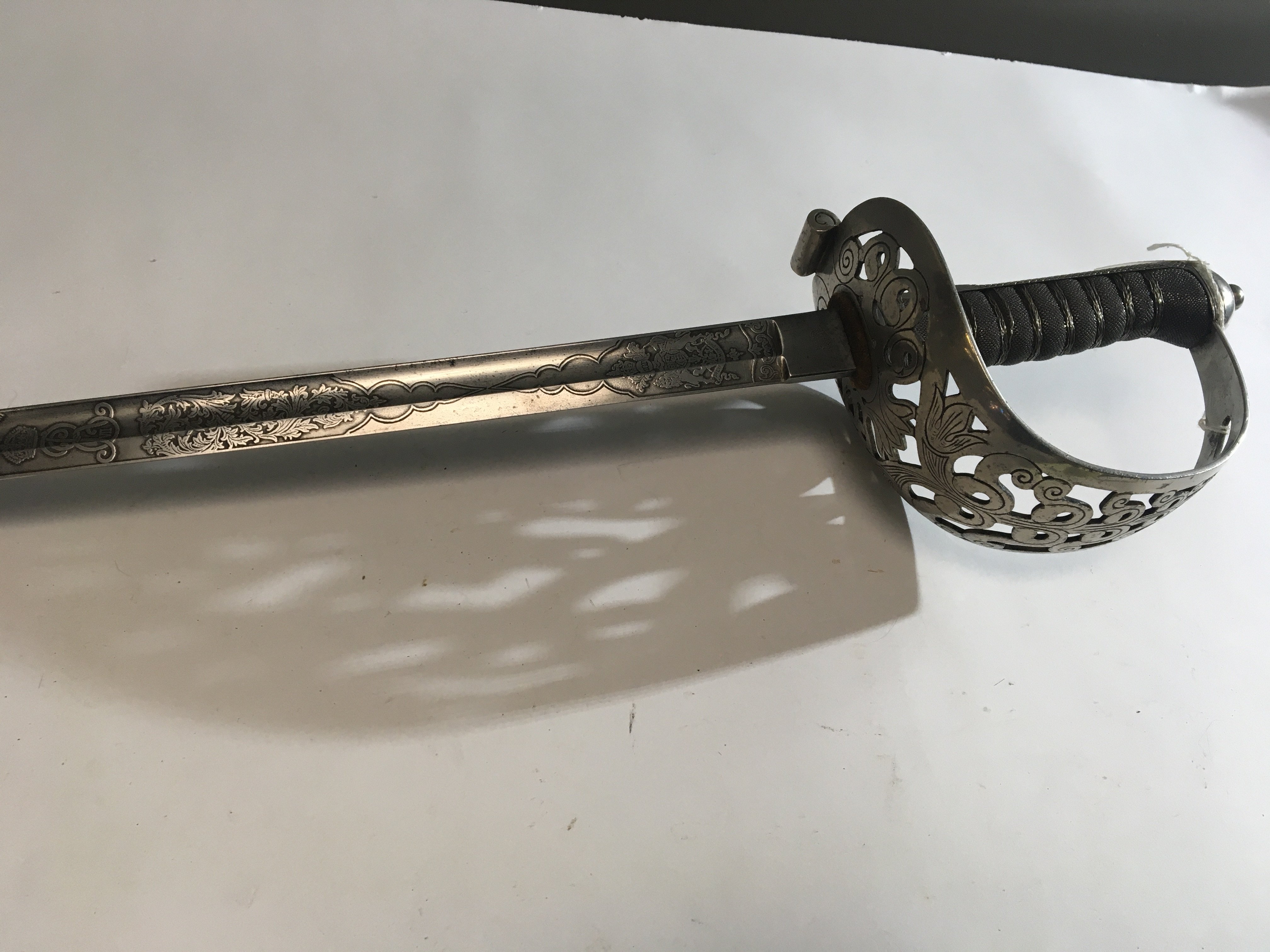 An interesting Edward VII Military sword with engraved blade and edge Military numbered 16164 possible made in Germany for the British Army.