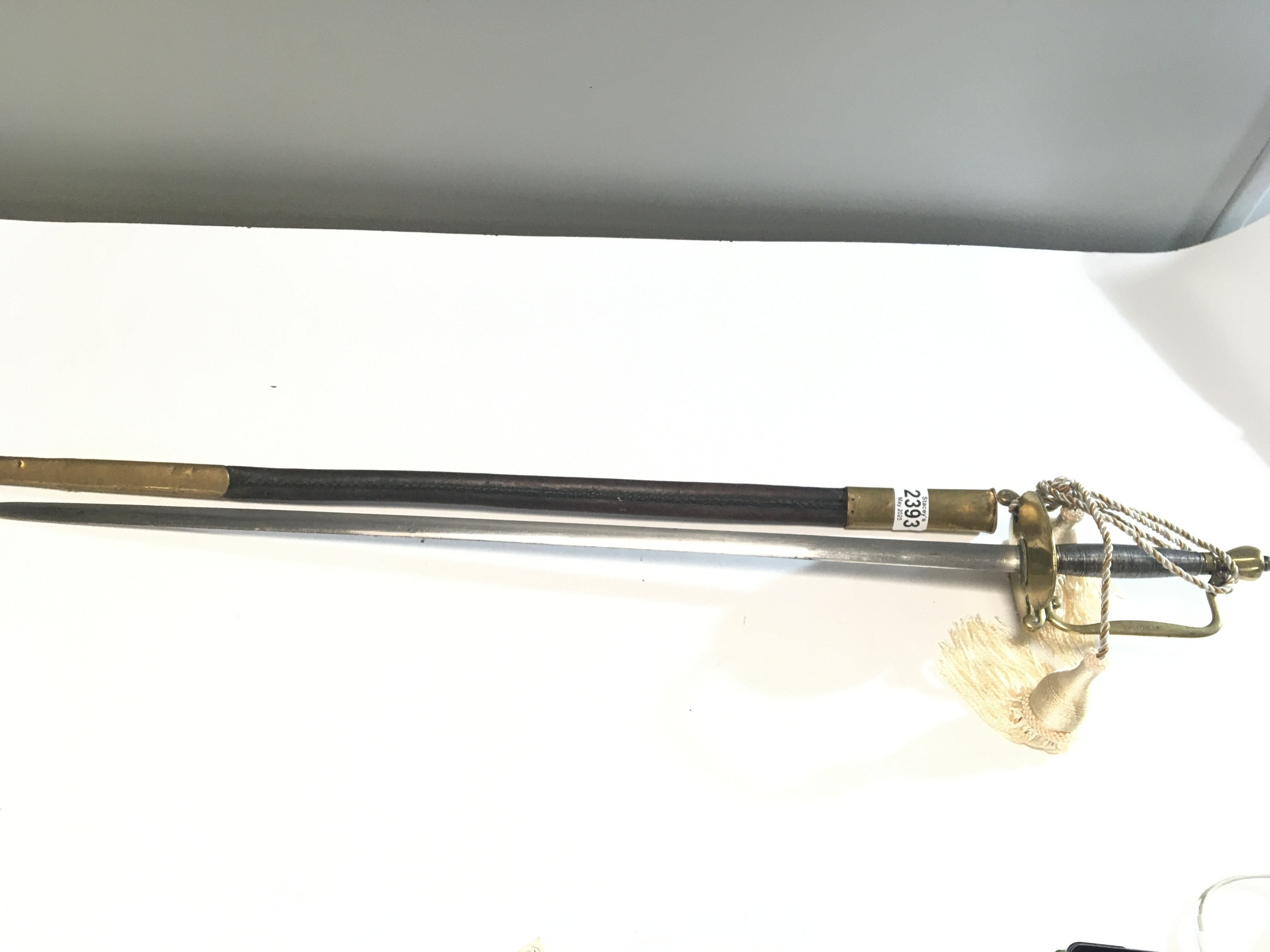 A steel and brass sword with wired grip stamped Nathan with a brass mounted leather scabbard.