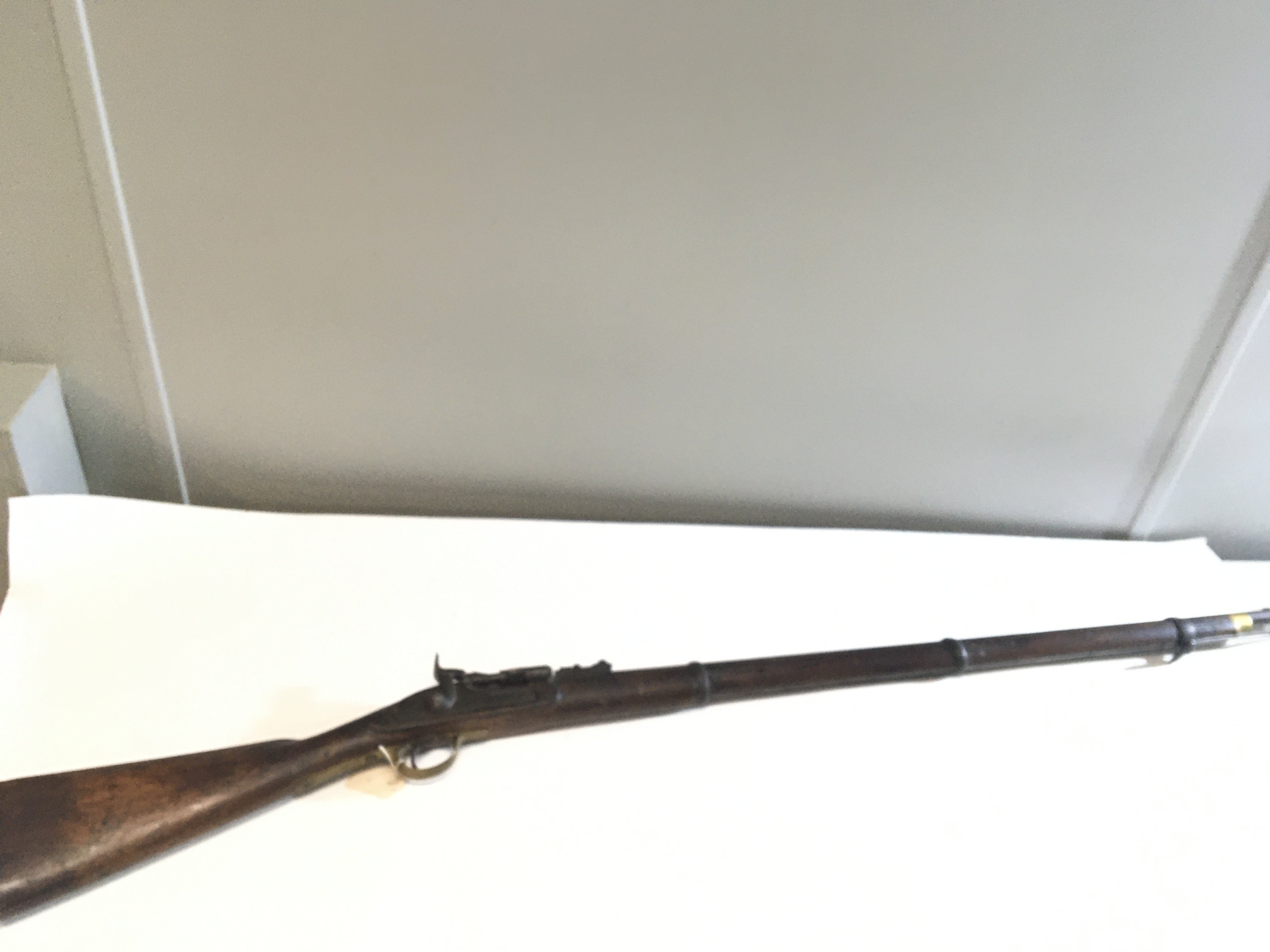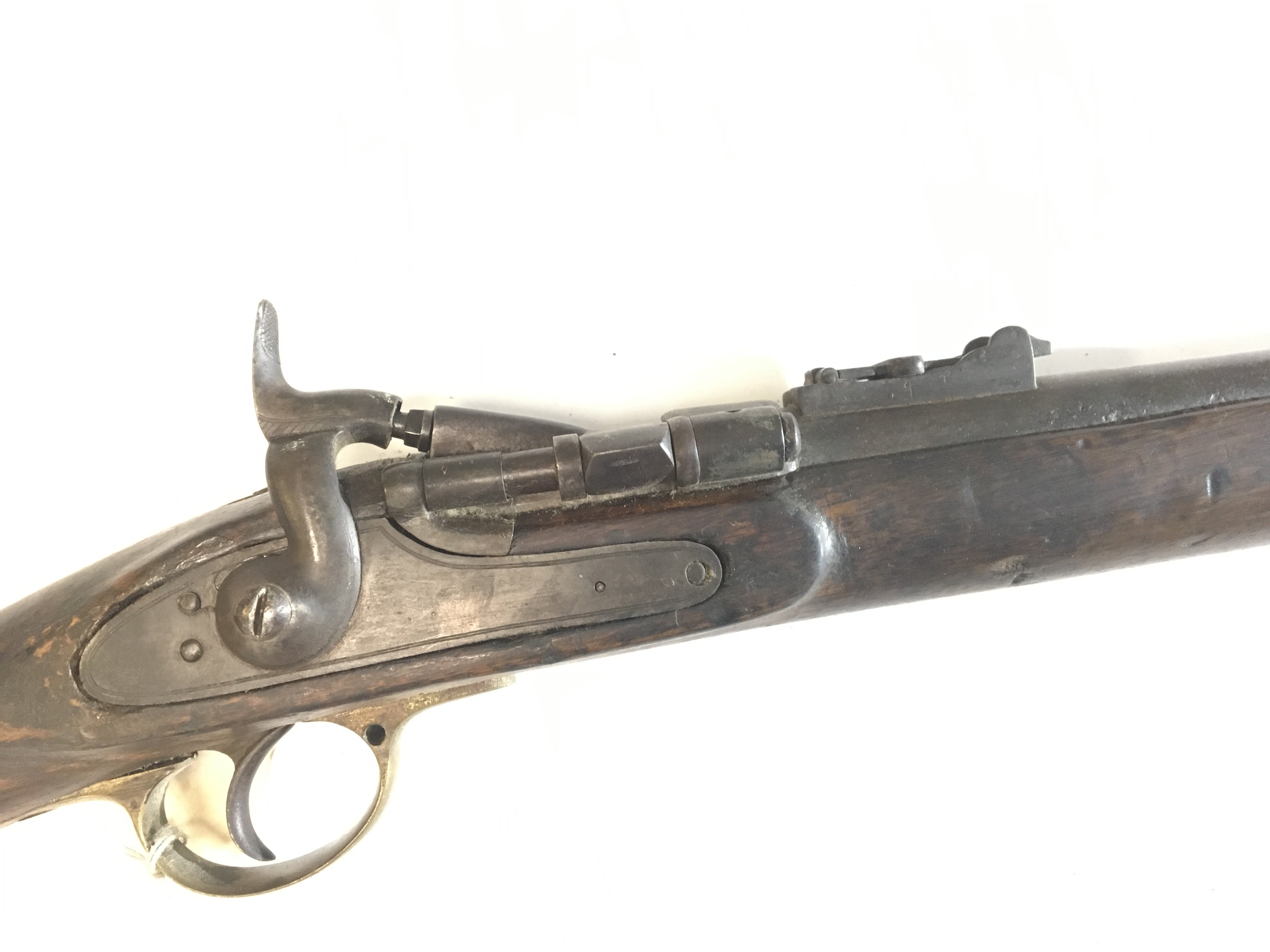 A 19th century Indian Military issue Rifle with brass trigger steel ram rod early breech loading mechanism. Indian military marks.