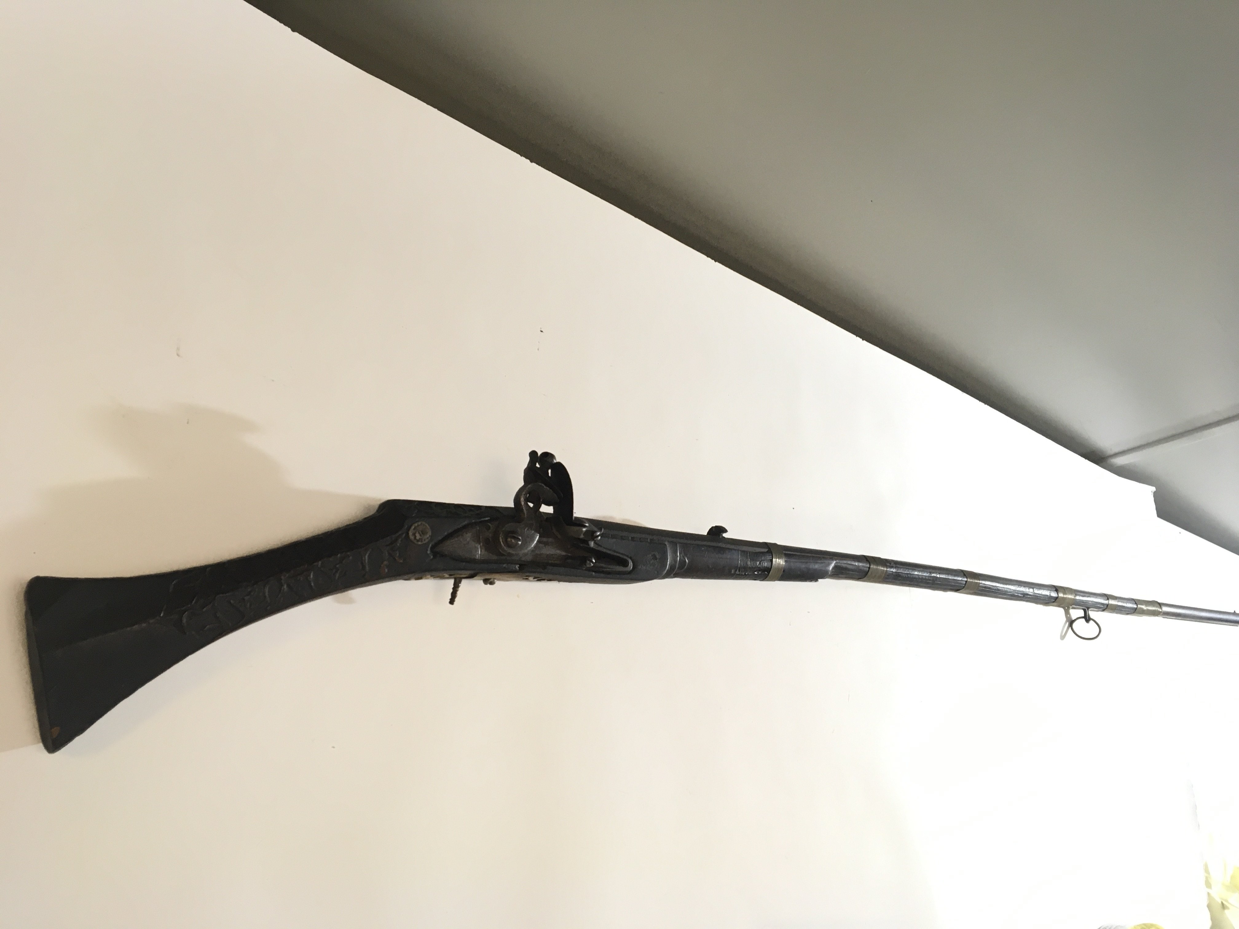 A 19th century Indian or North West Frontier Jezail flintlock rifle with a carved stock wired barrel.