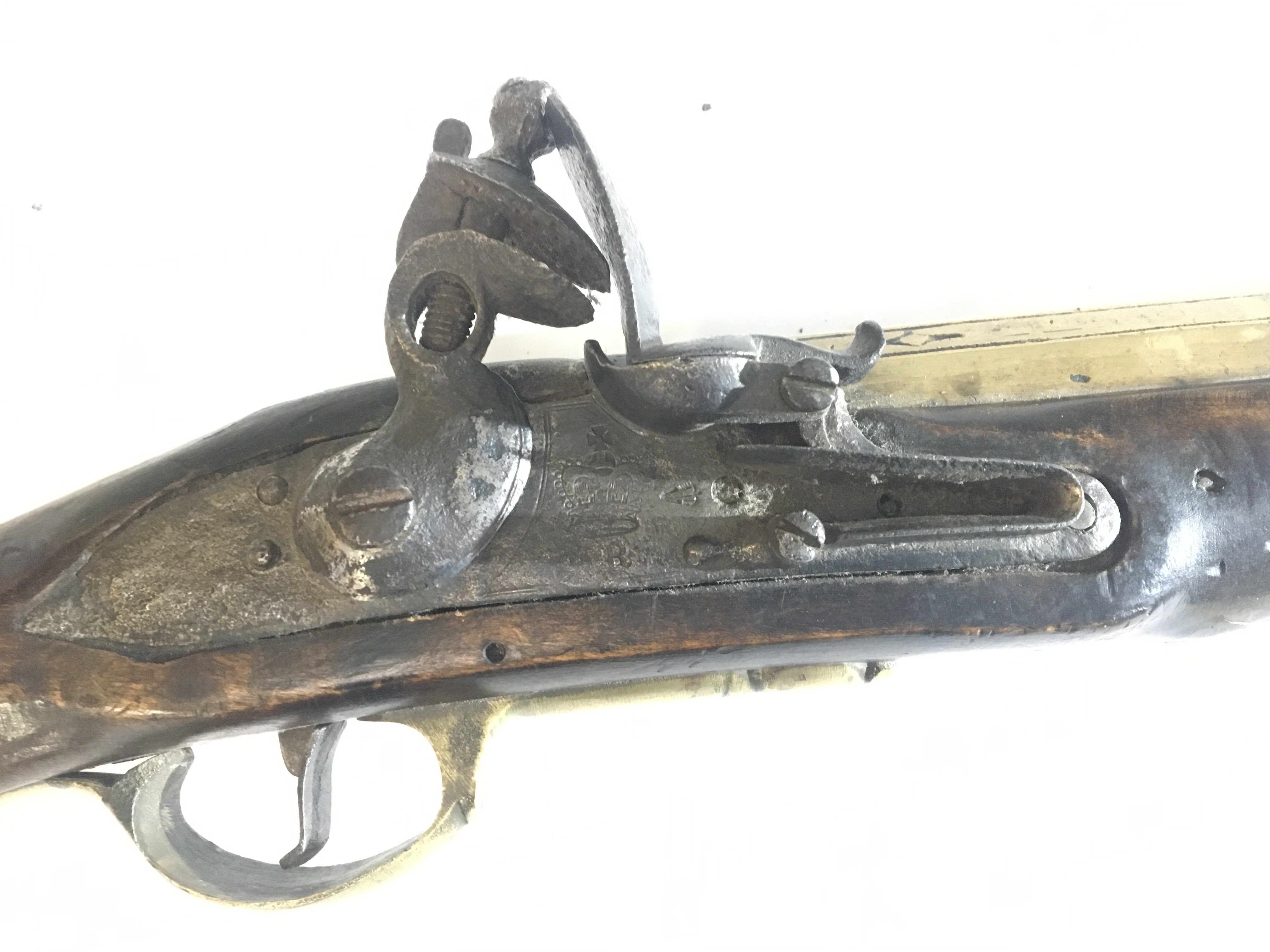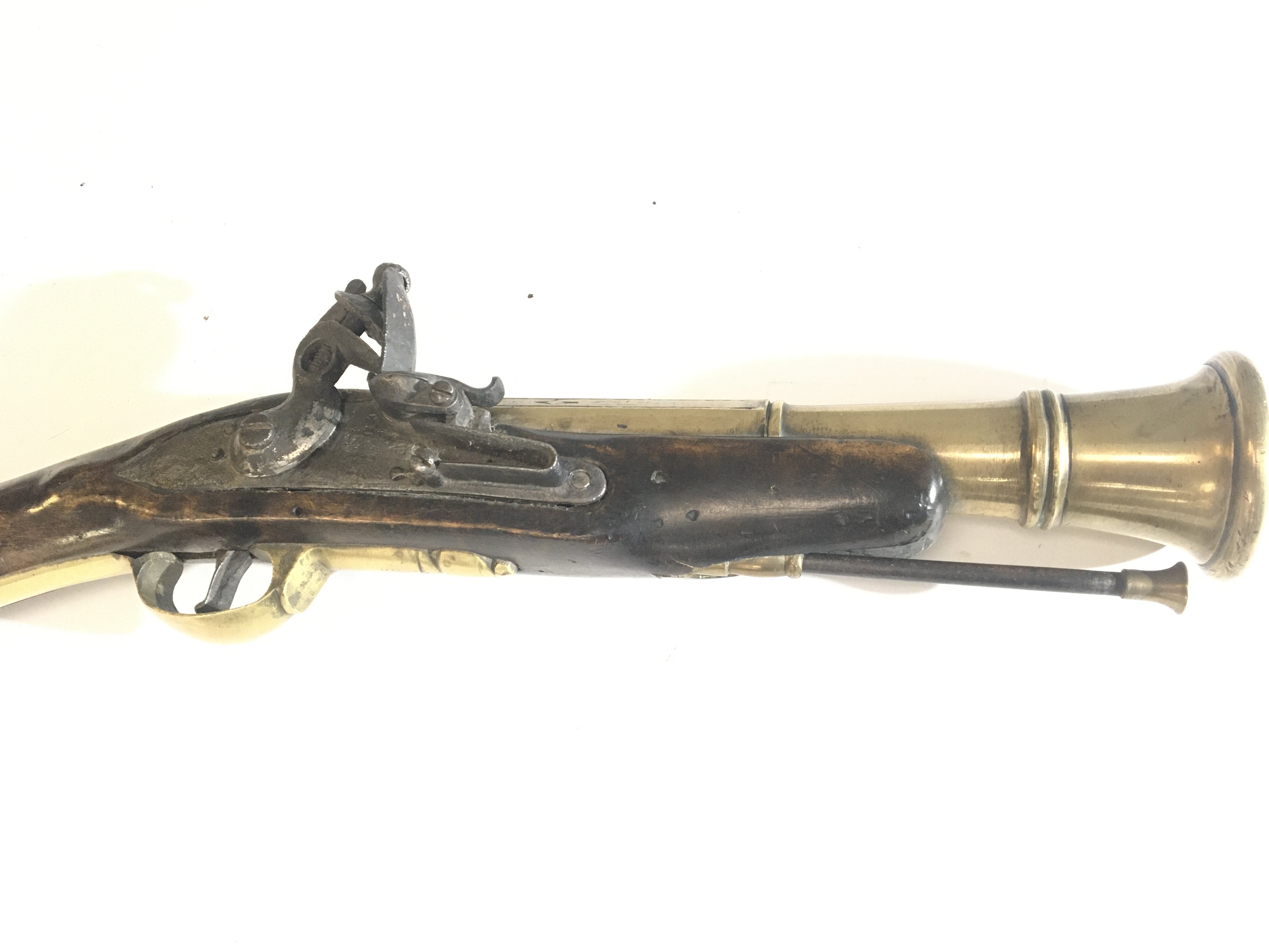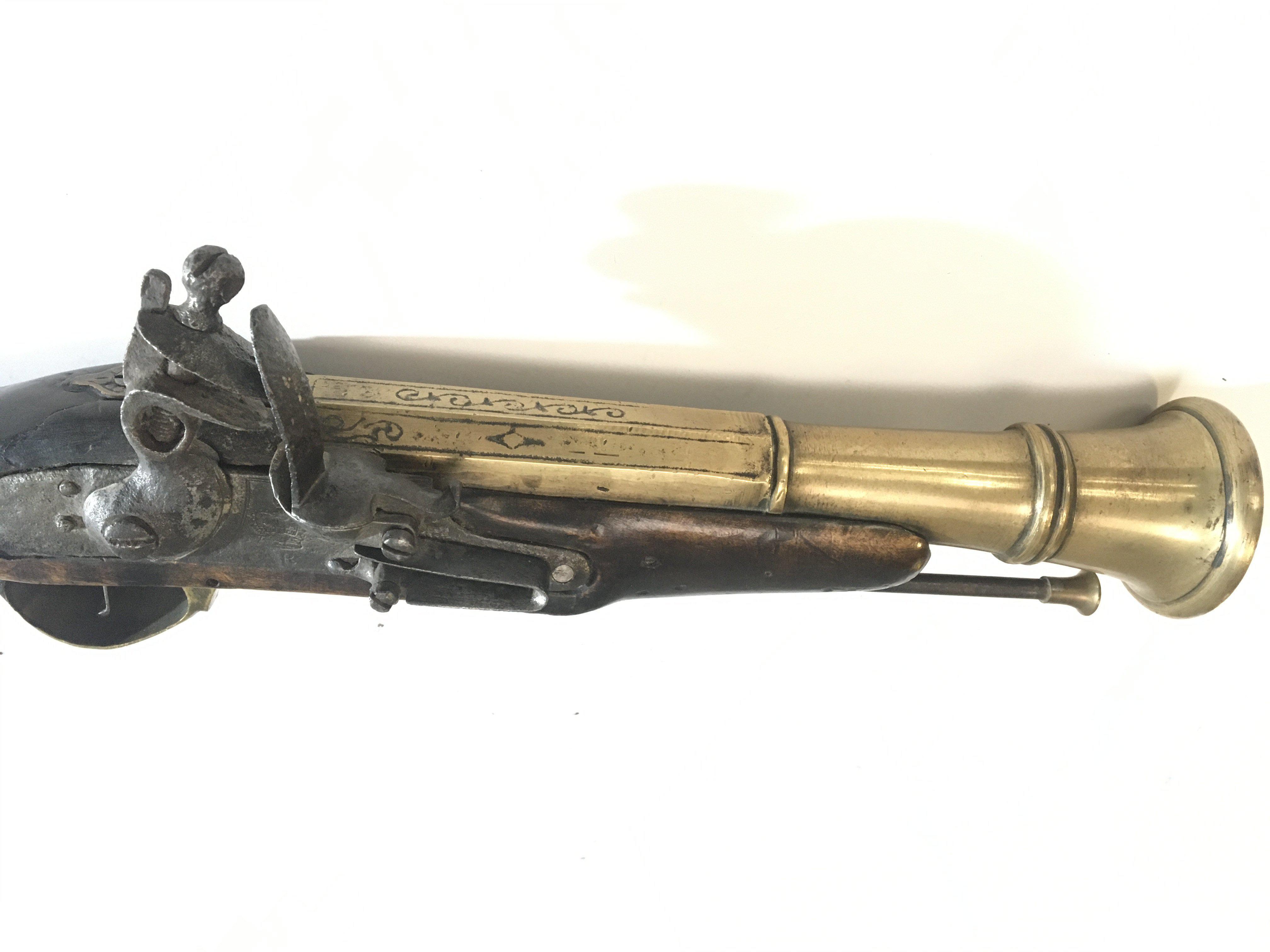An 18th Century English brass barrel Blunderbuss flintlock most likely a coachmen’s protection arm. With a wide opening flared barrel with turned end and some ornamentation brass fittings the action stamped with Royal Crown GR.