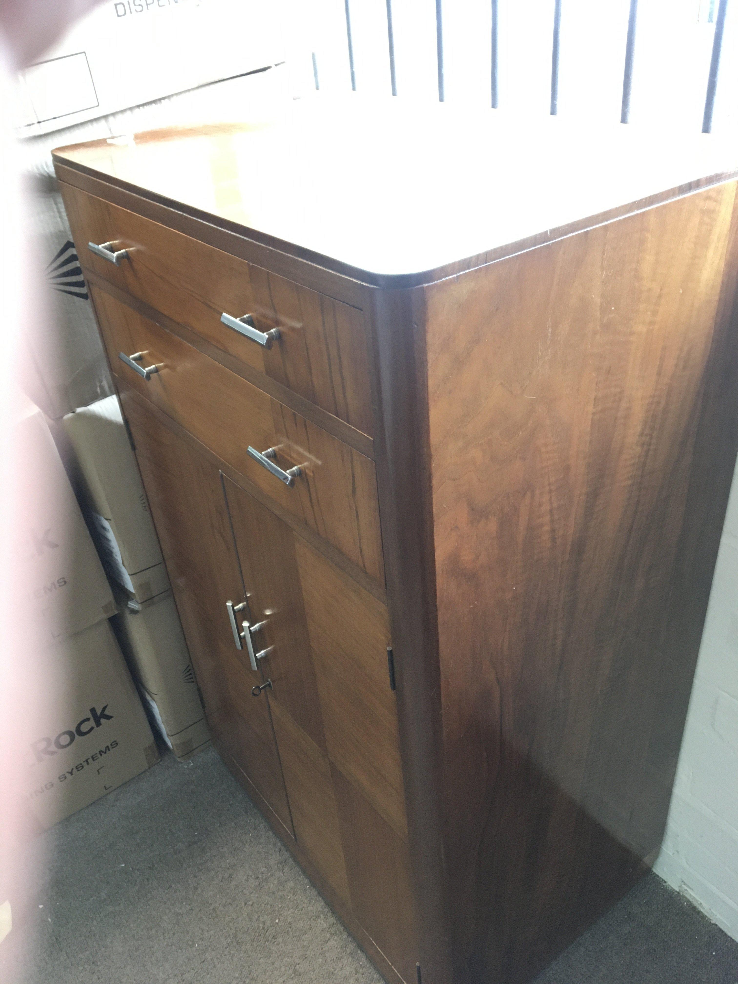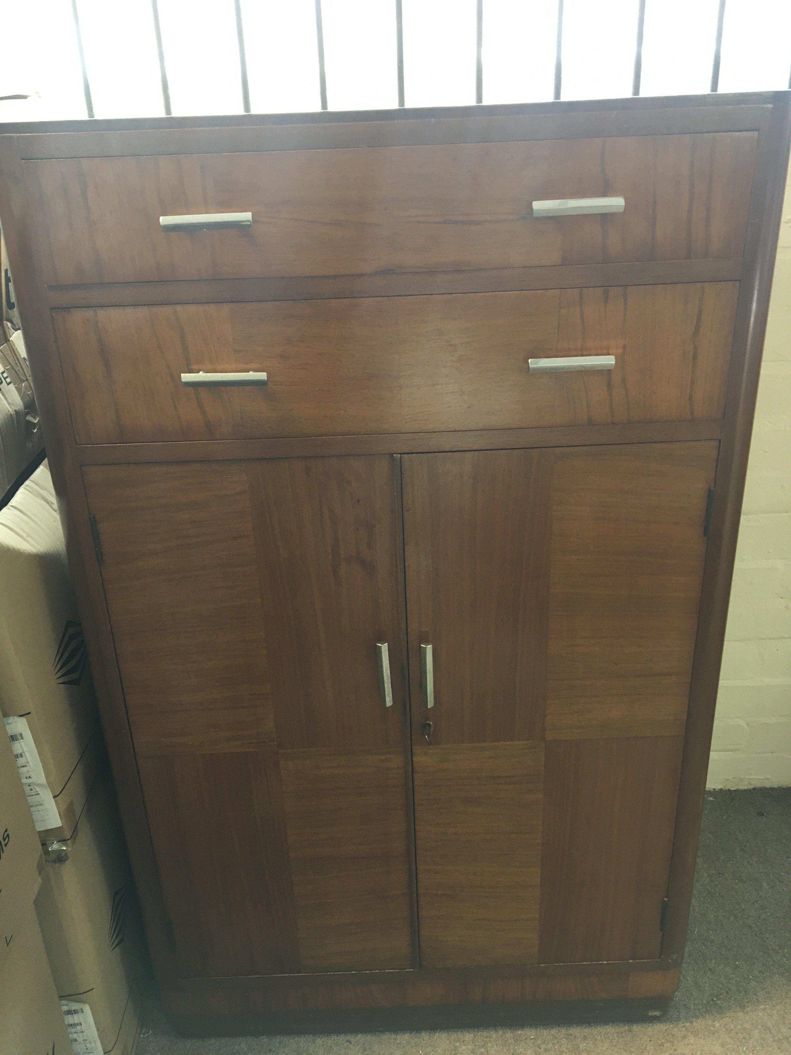 An Art Deco design walnut cabinet with chrome fittings two drawers and cupboards. Height 112cm width 70cm