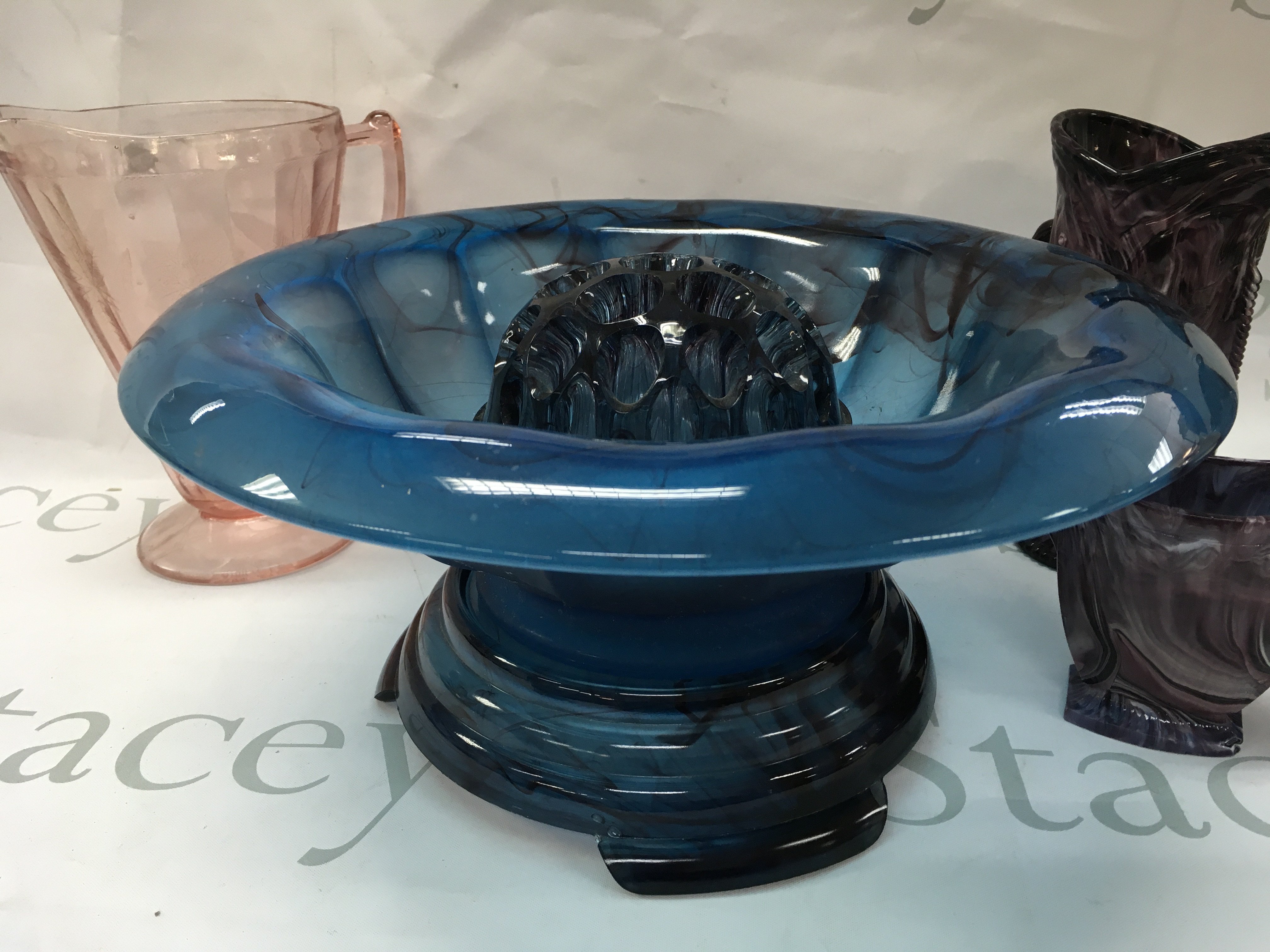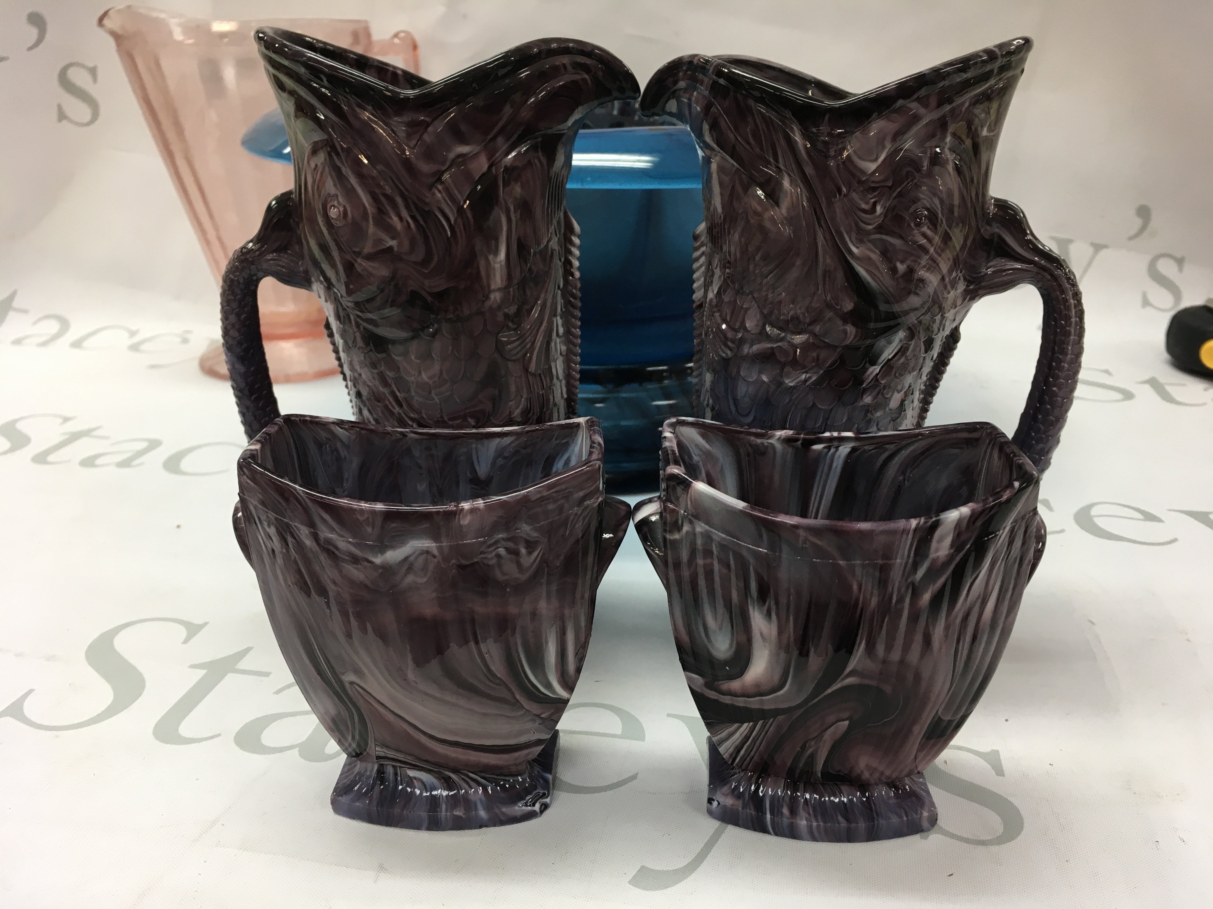 A large cloud glass flower bowl together with two fish jugs and vases and one other jug .