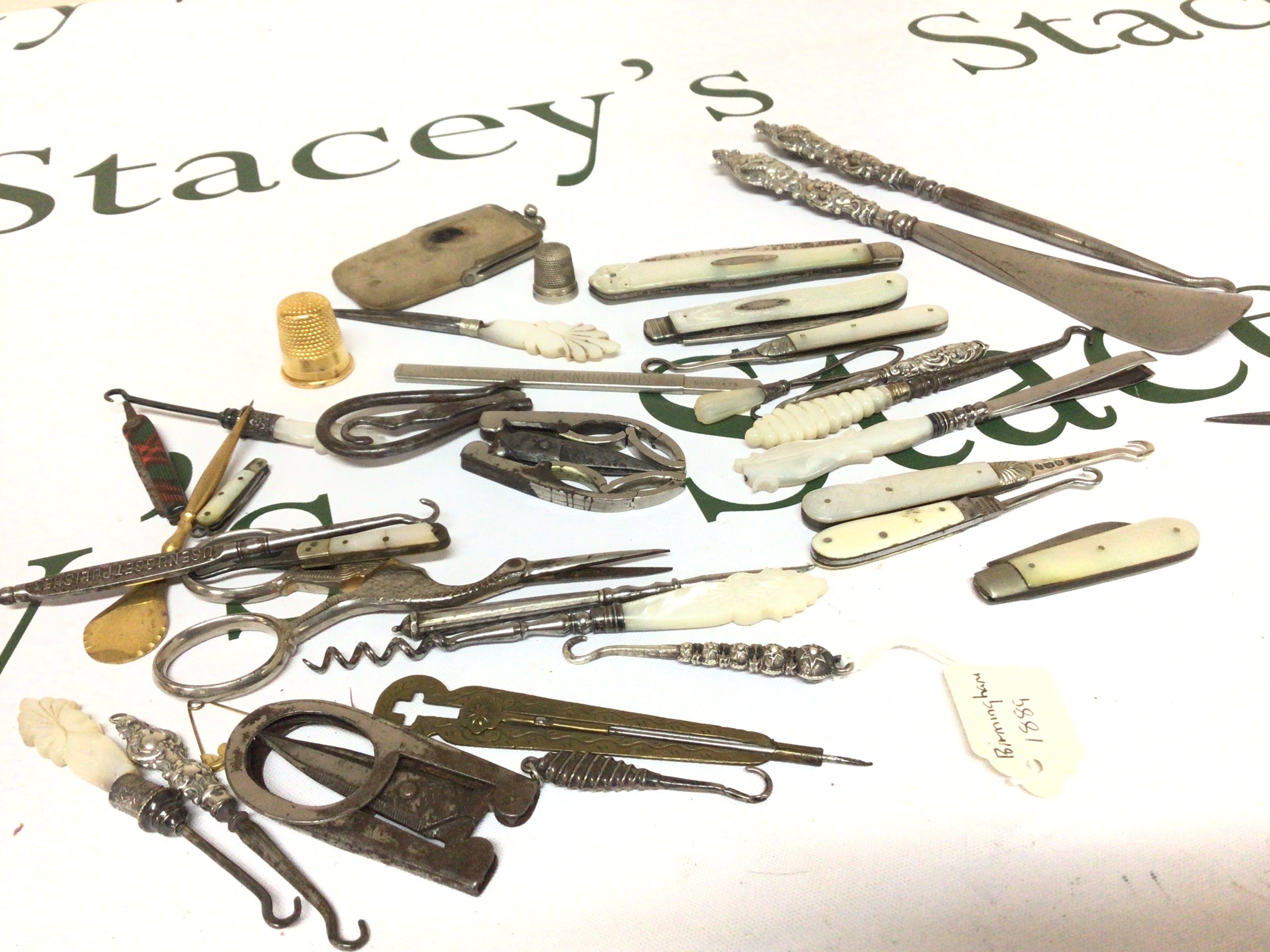 A collection of Victorian and later sewing implements mother of pearl and silver button hooks small folding knives silver handled button hooks and other assorted sewing items.