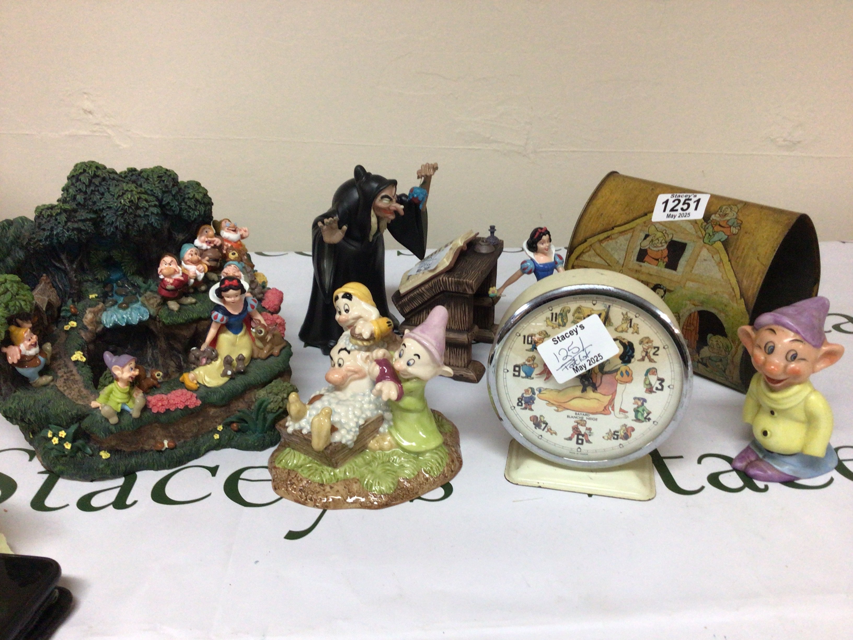 A collection of Disney ceramics including a Doulton Snow White figure group a Vintage Snow White wind up alarm clock and other oddments.
