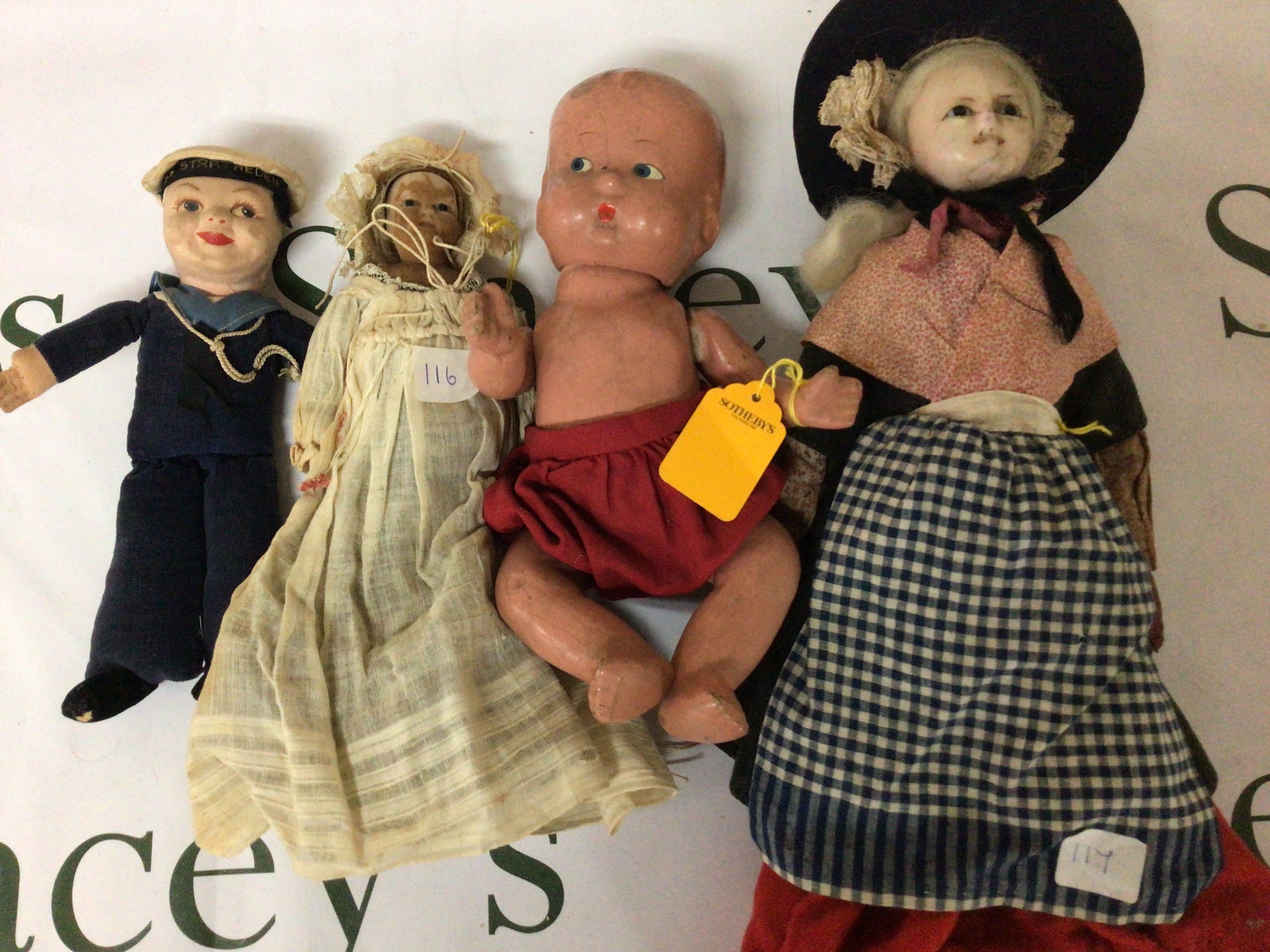 Four antique and Vintage dolls including a wax head doll in traditional welsh dress a sailor doll and two others