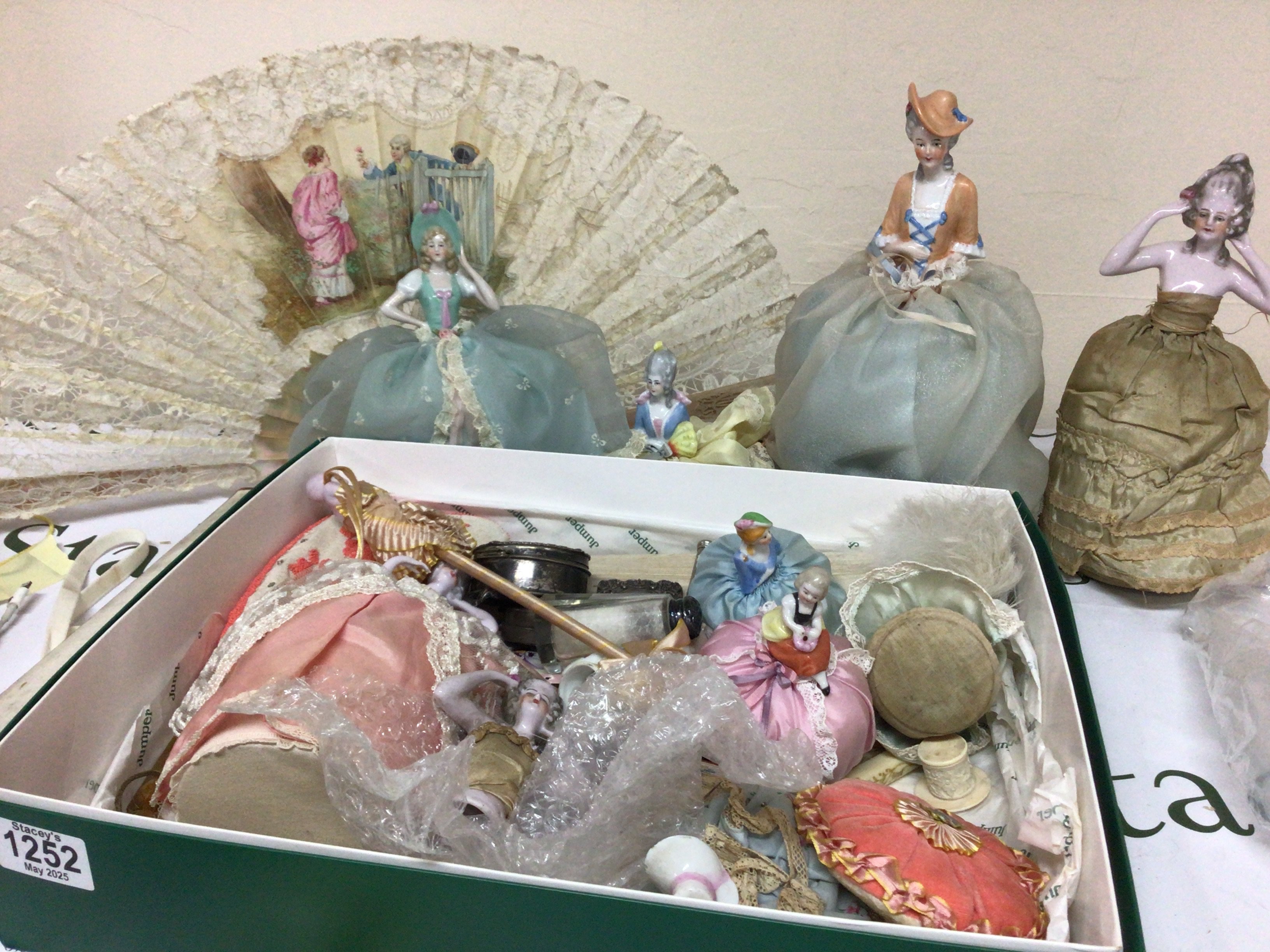 A collection of porcelain pin dolls Vintage fans and some small silver oddments.