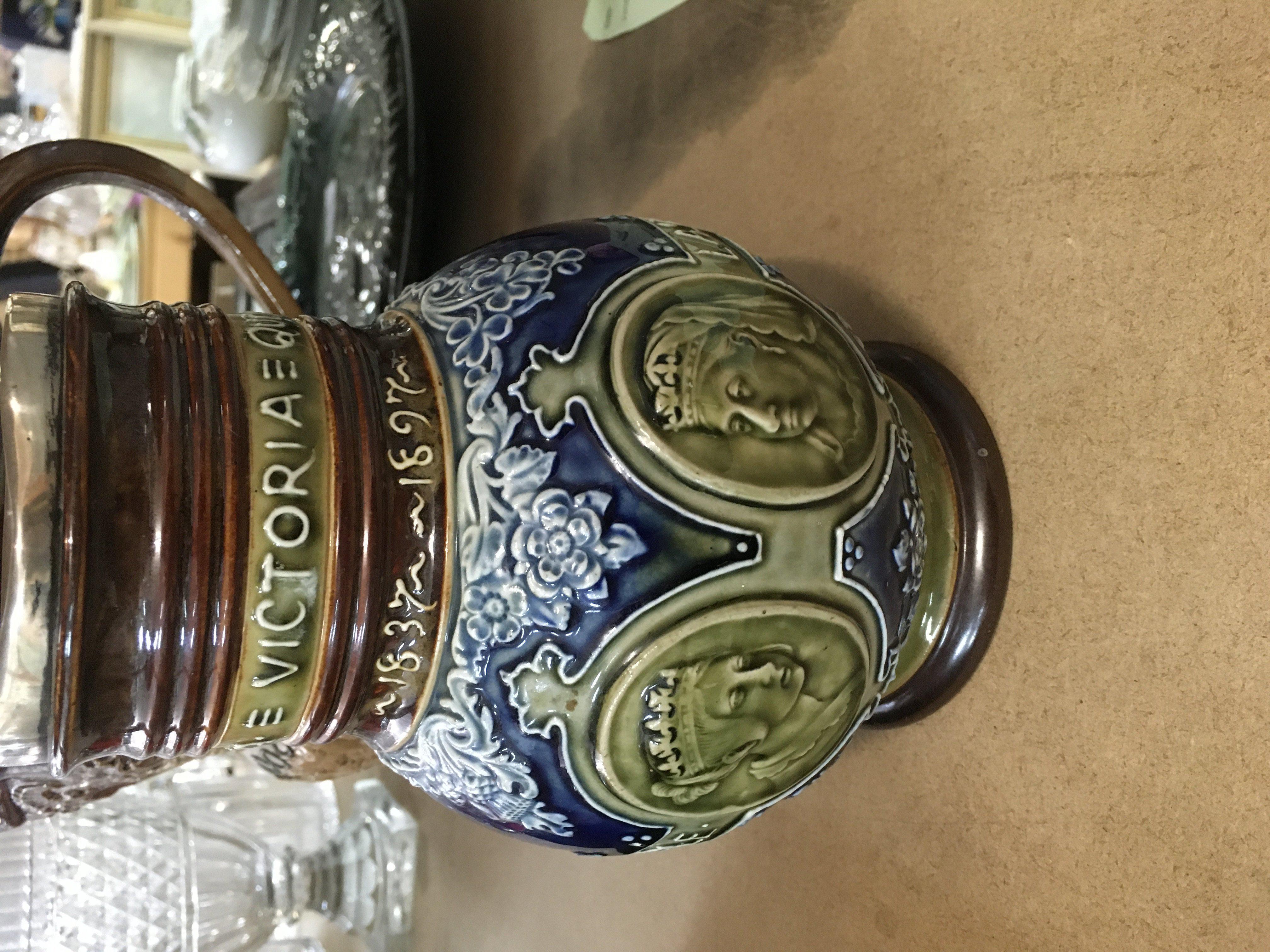A Doulton jug Queen Victoria 1837 - 1897 with silver rim .