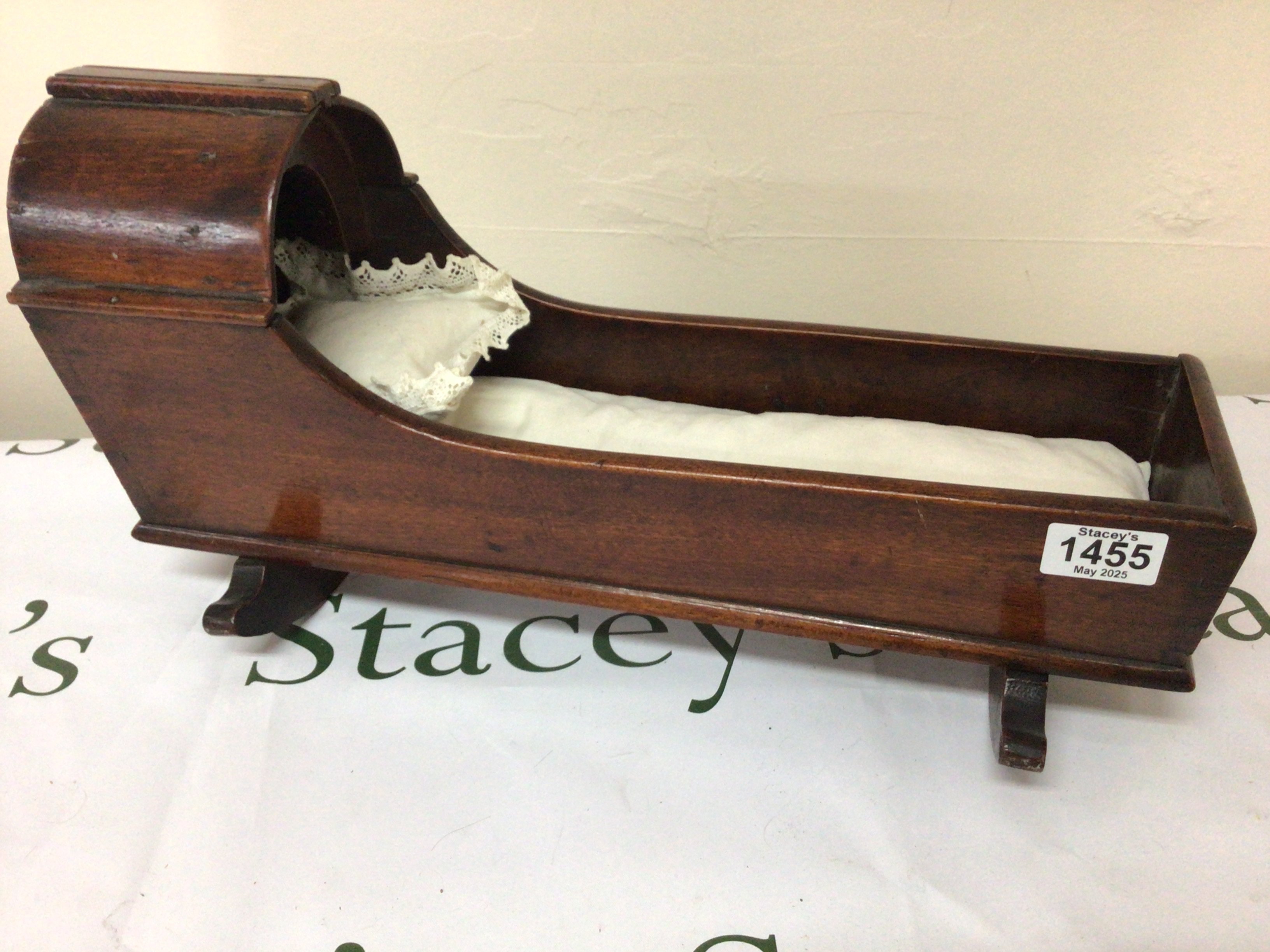 A George III Mahogany Childs doll cradle with a raised hood on shaped rocker supports length 45cm