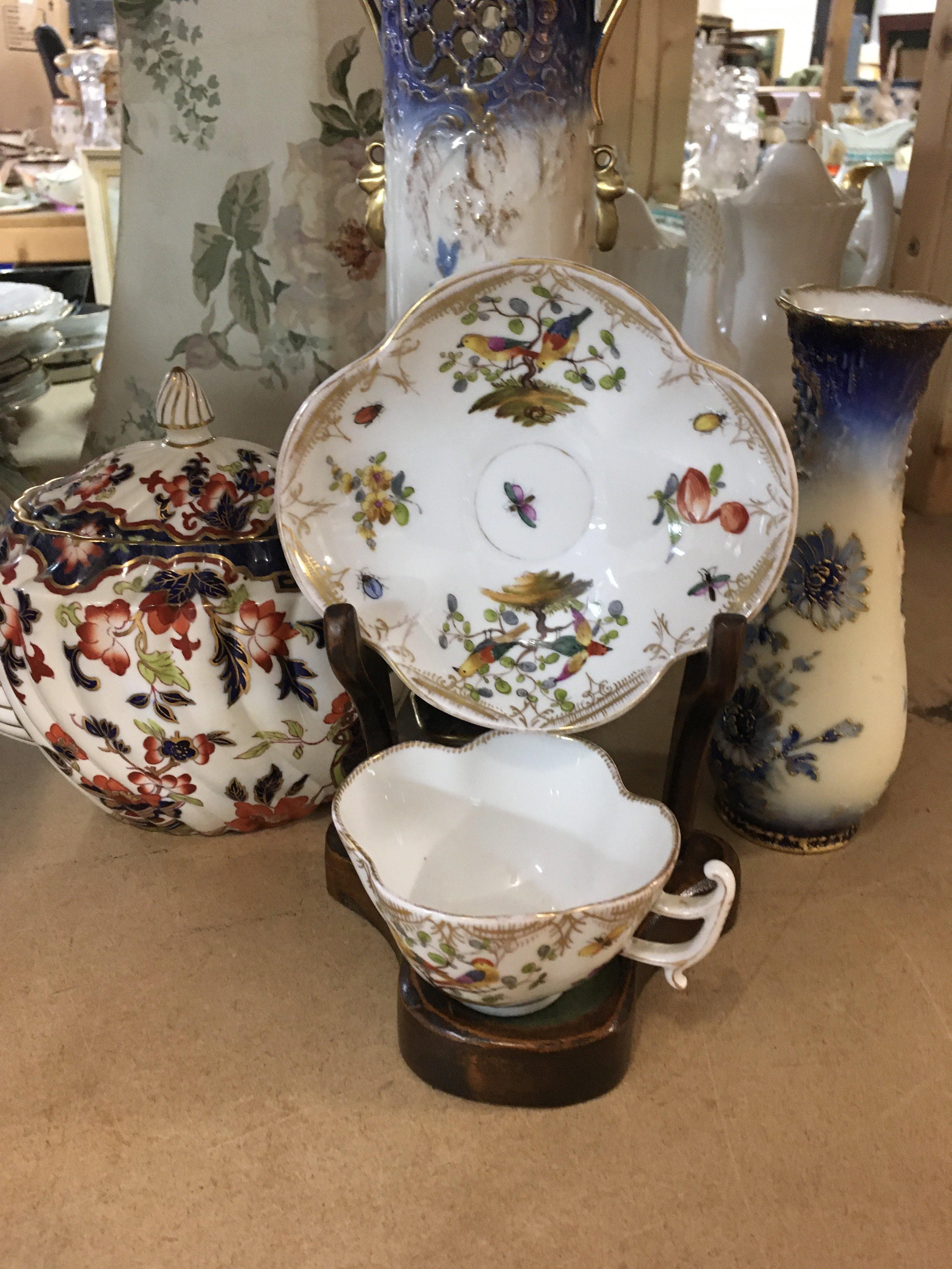 A Dresden cup and saucer two Austrian floral vases and a tea pot .