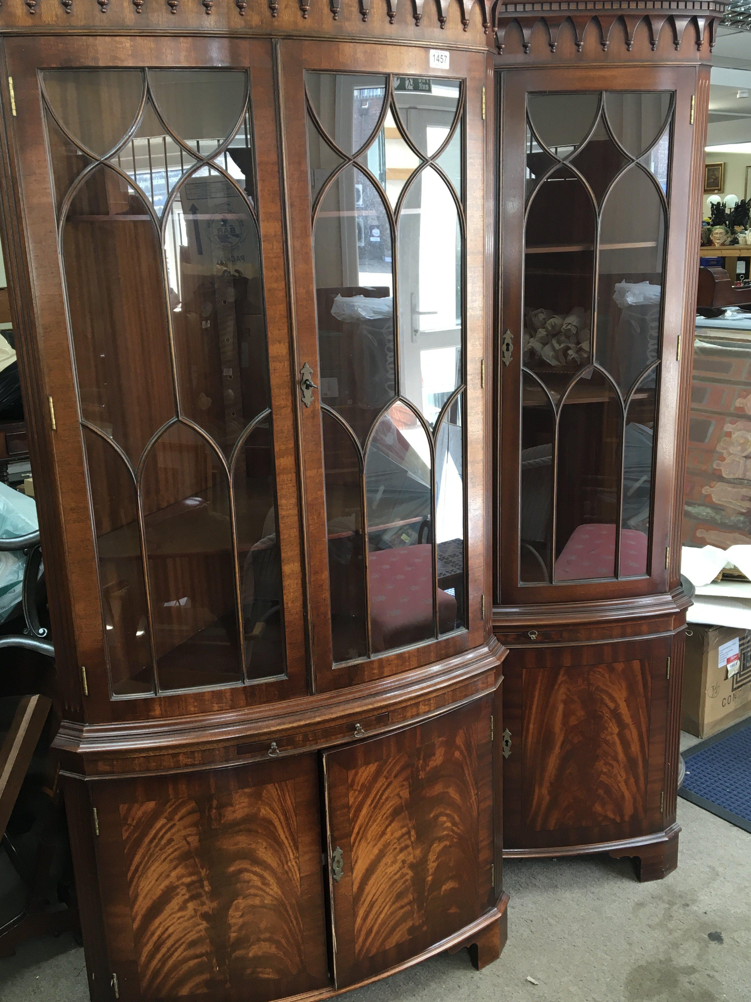 A pair of Mahogany corner cabinets with elaborate moulded tops above glazed doors and cupboards