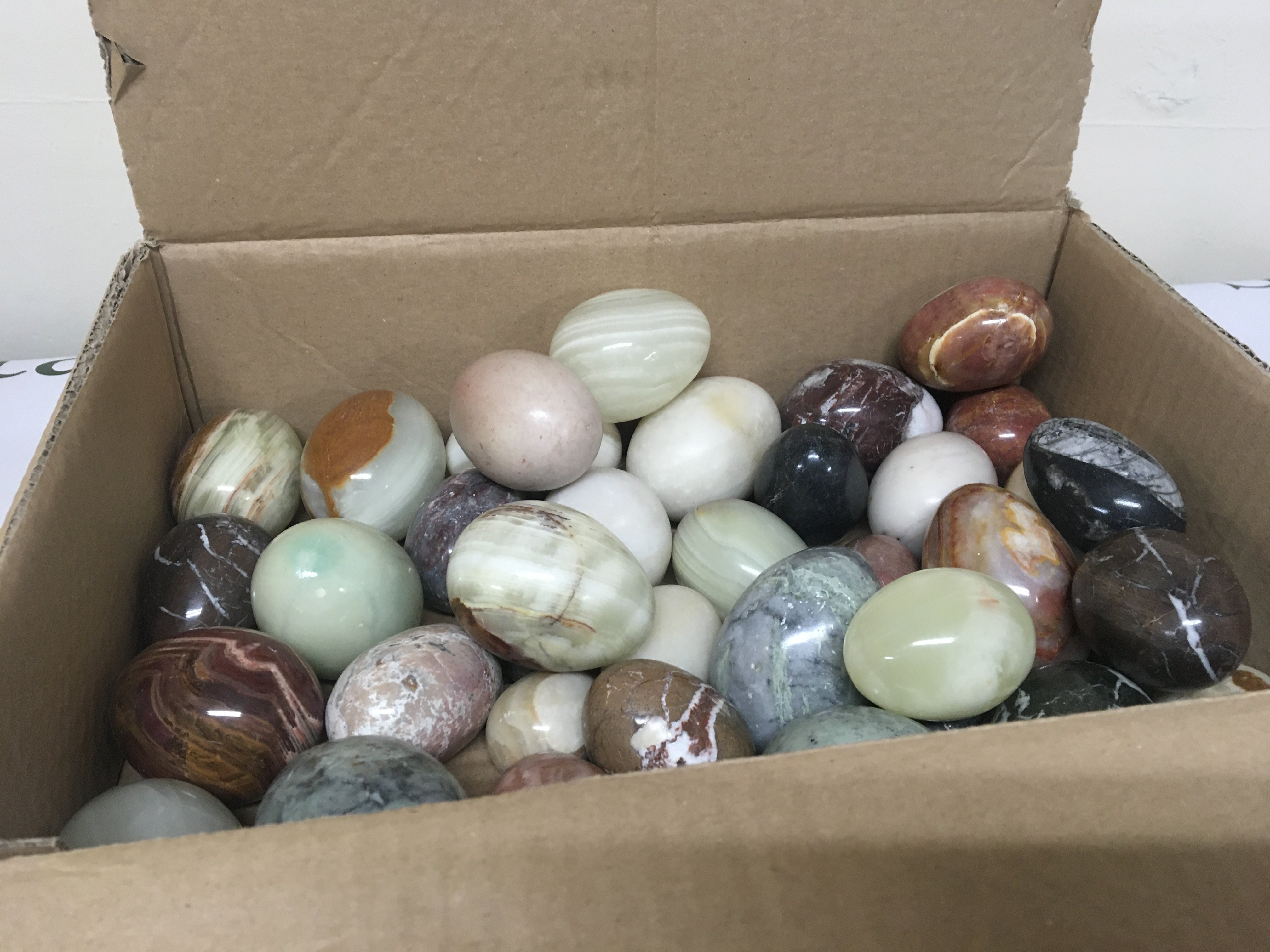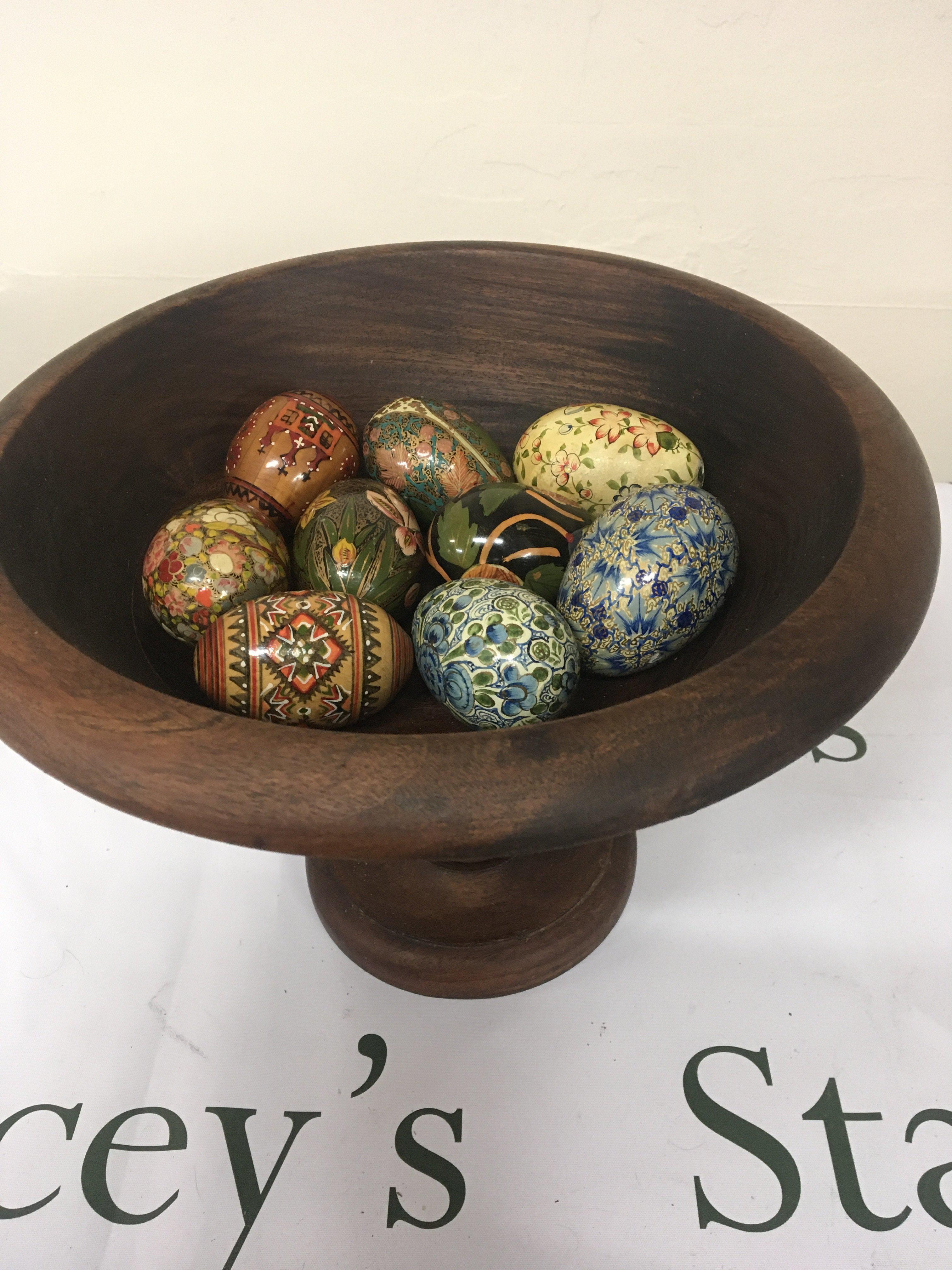 A collection of polished stone and onyx eggs. a modern treen bowl other wooden painted eggs and balls.