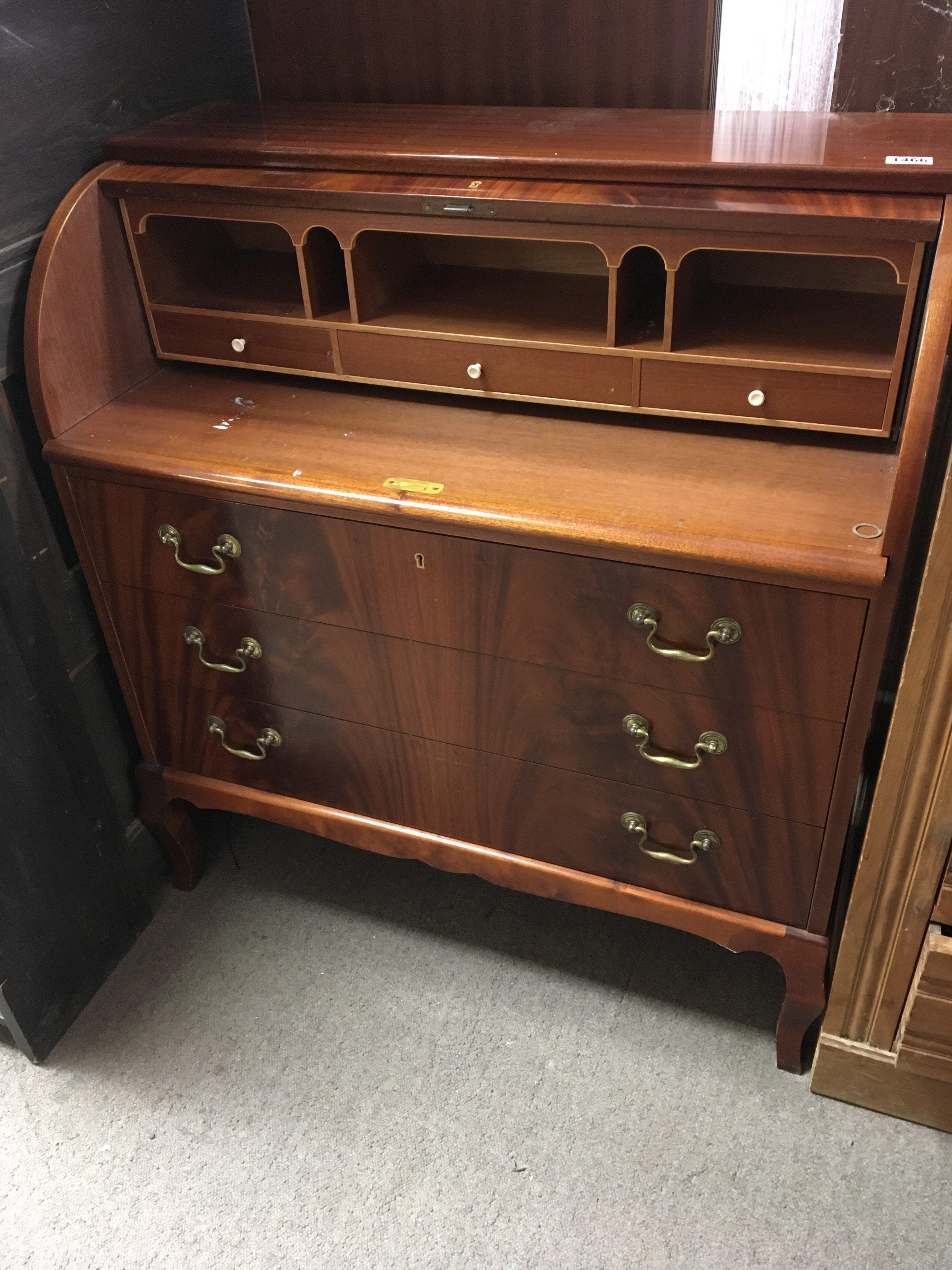A Mahogany cylinder bureau with a solid roll top fitted interior above three drawers. 90cm wide