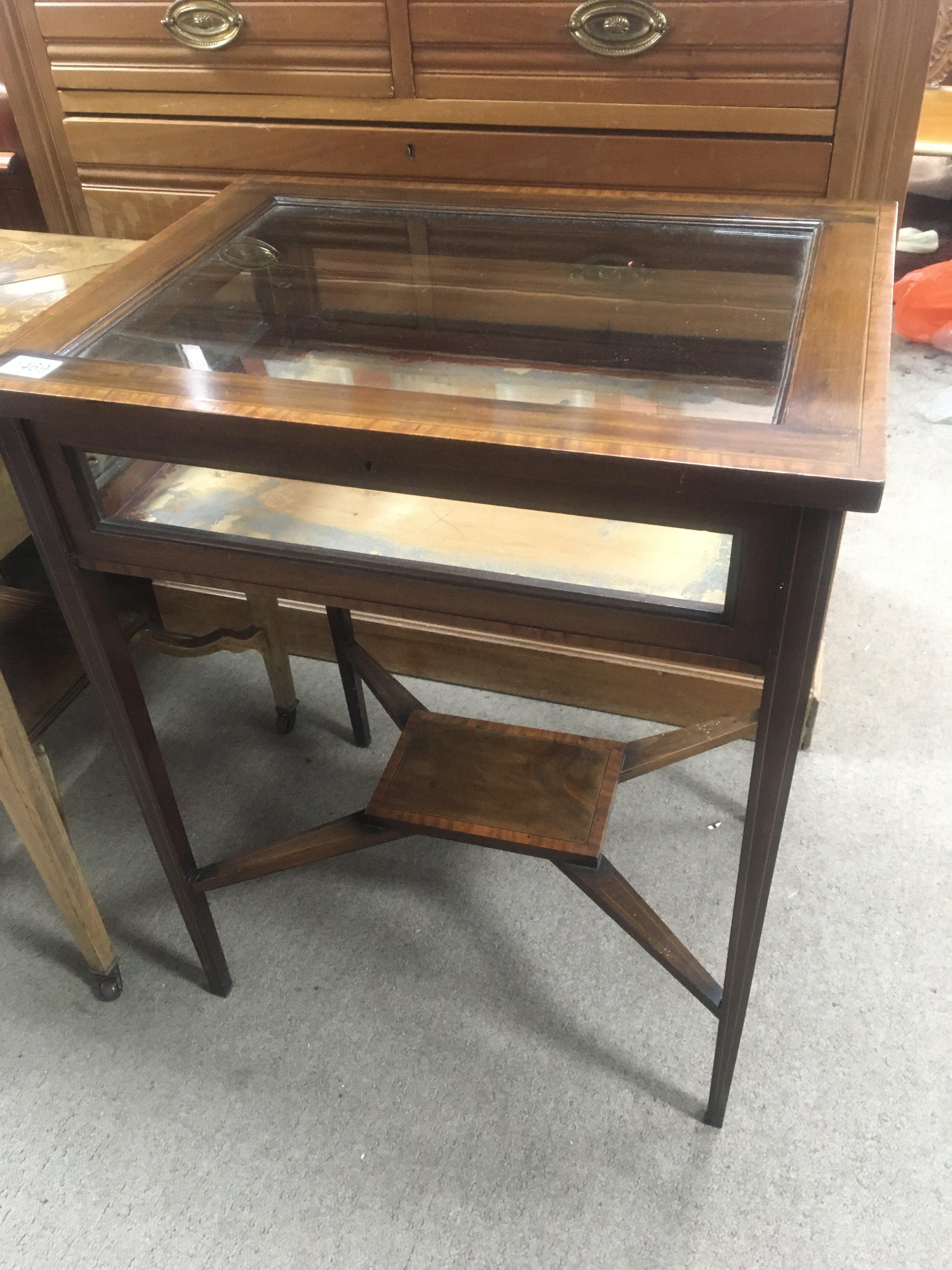 An Edwardian satinwood banded display cabinet with a hinged top above glazed sides on square legs united by stretches .