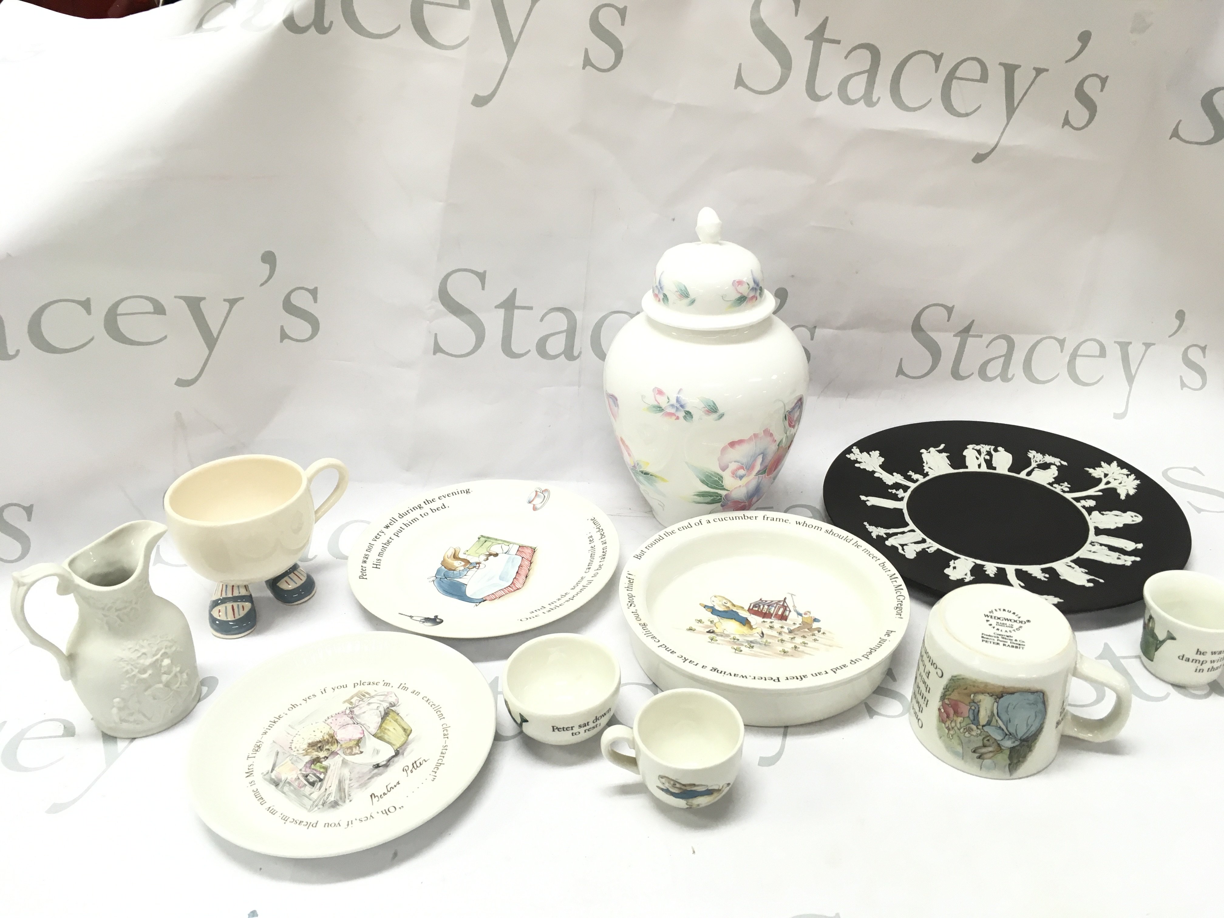 A collection of ceramics including a Wedgwood plate, Wedgwood Beatrix Potter Peter rabbit tea set , Ansley vase