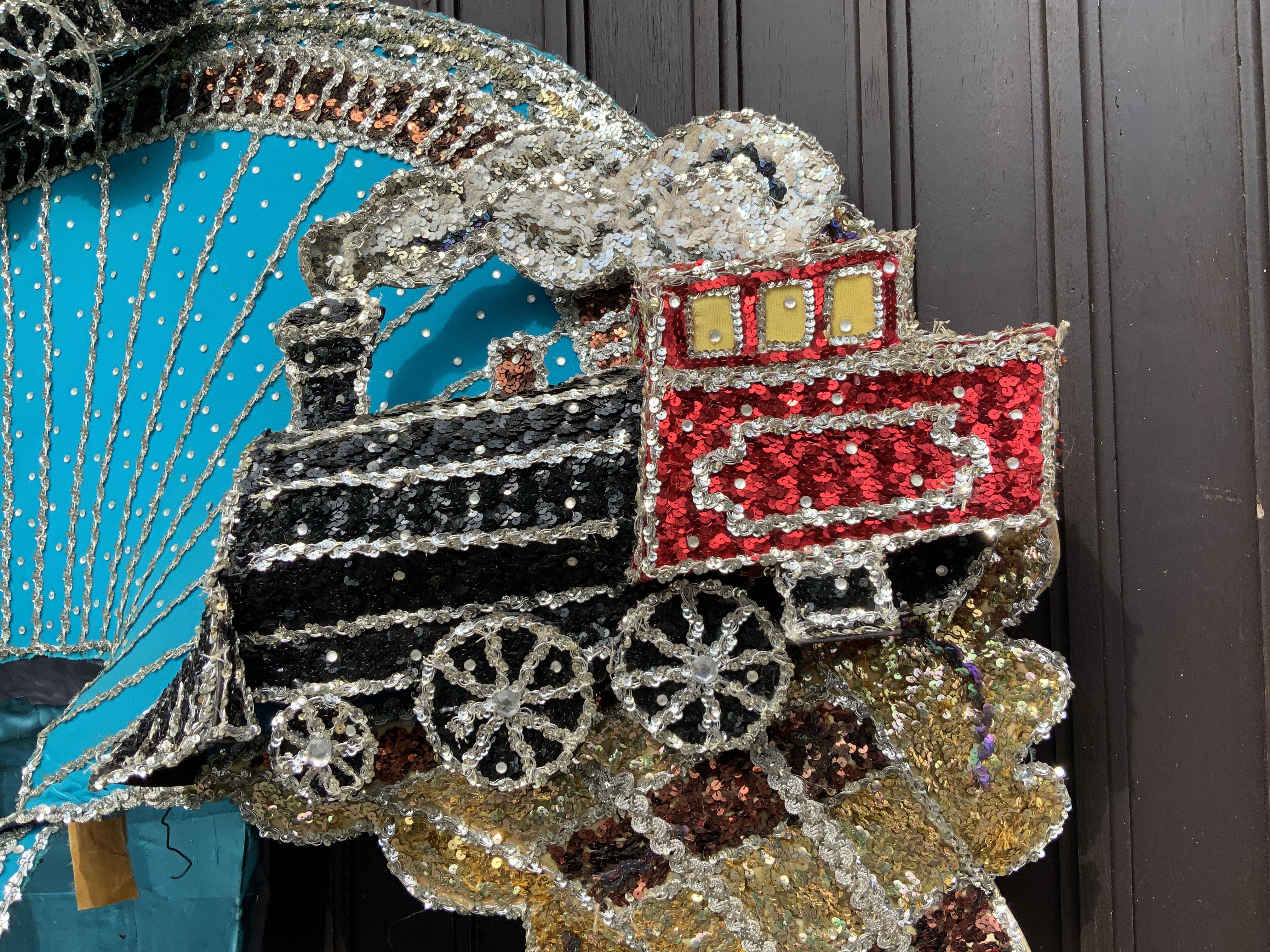 An elaborate Mardi Gras costume the theme ‘The Age of Steam’ worn and made for the New Orleans Mardi Gras Circa 2010, Purchased at Vicky Vines Auction, Houston Texas. Wire framed and sequin covered. (A)