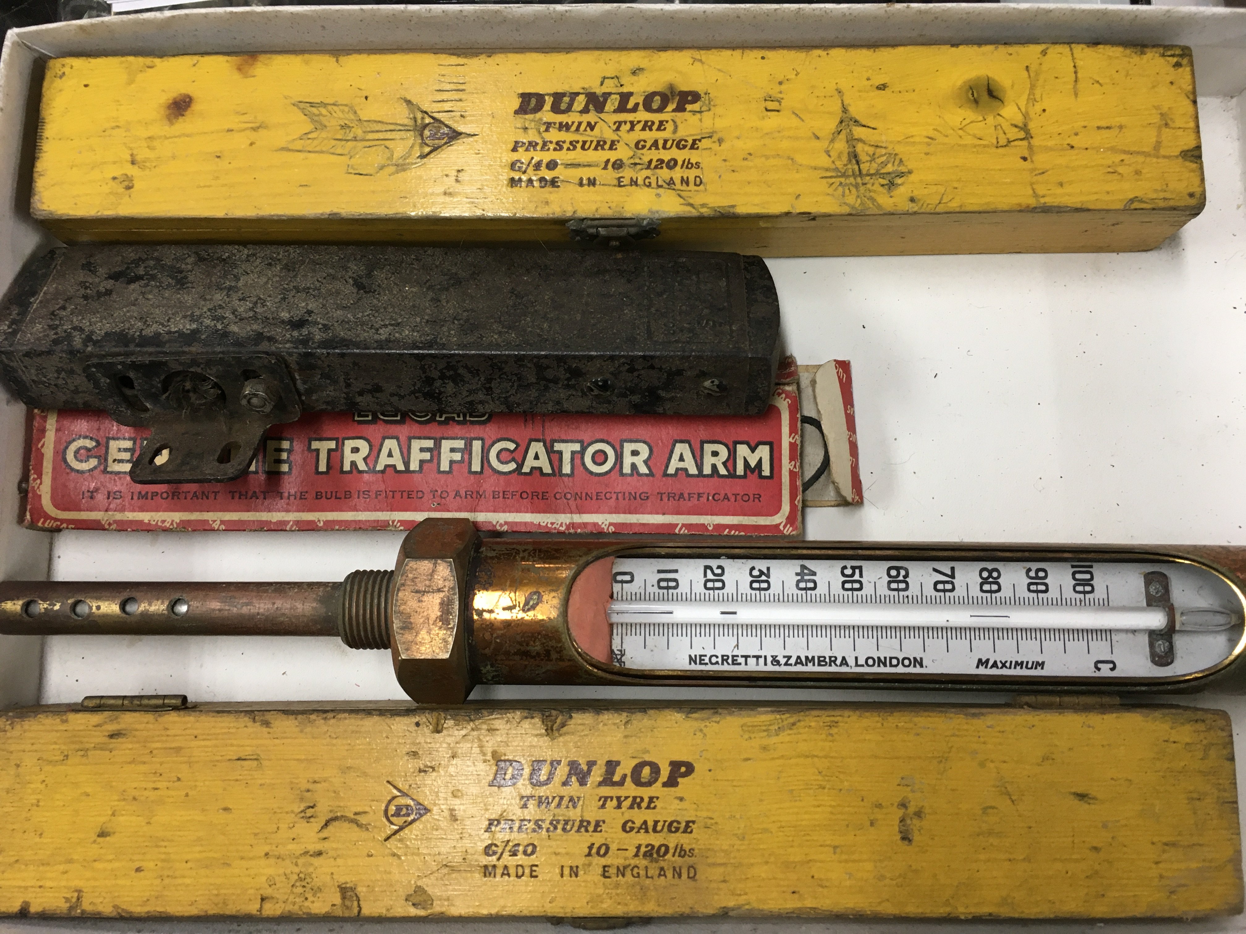 Two vintage trafficator arms and two boxed Dunlop tyre gauges
