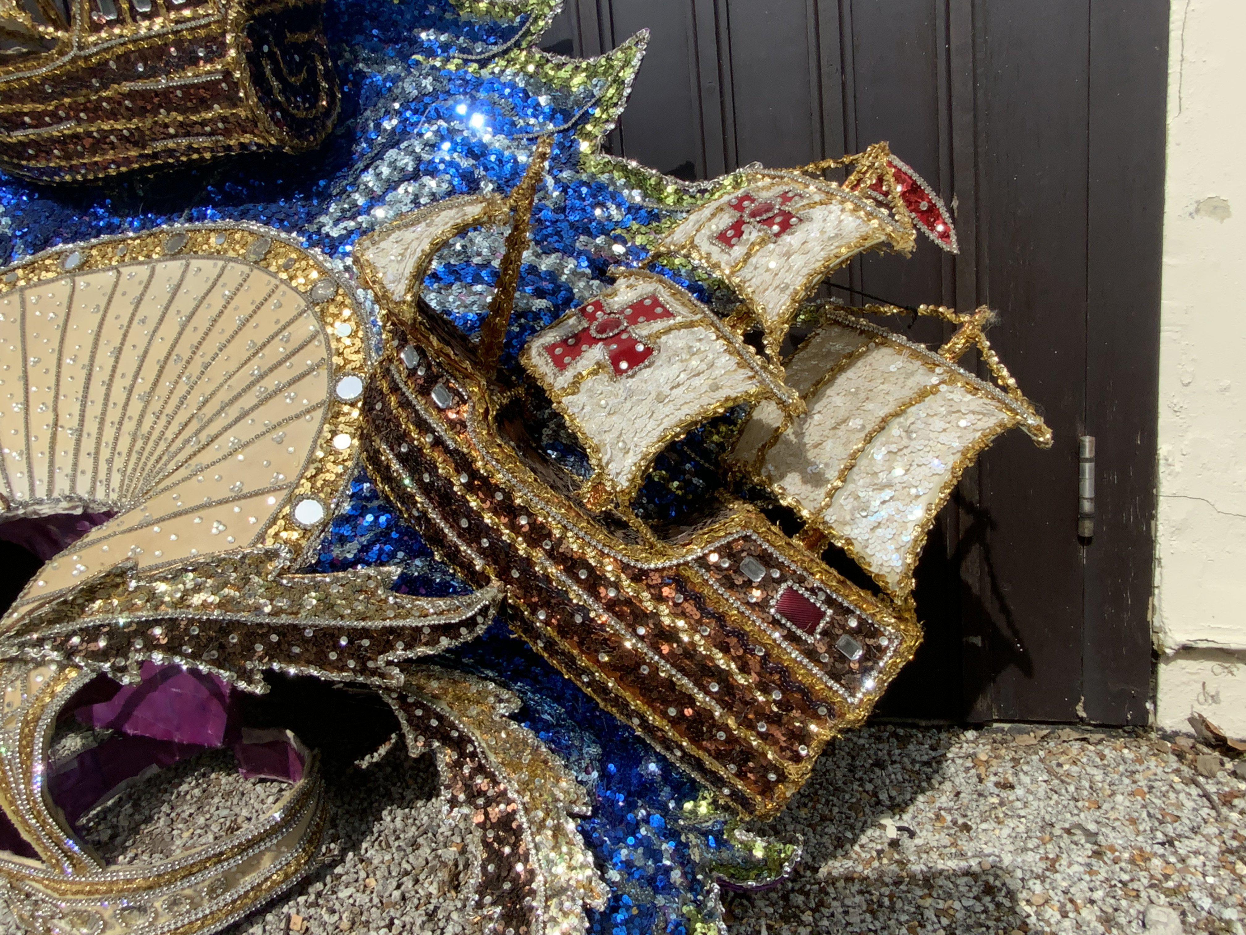 An elaborate Mardi Gras costume the theme of the three Christopher Columbus galleons Santa Maria, Nina and The Pinta, worn and made for the New Orleans Mardi Gras Circa 2010, Purchased at Vicky Vines Auction, Houston Texas. Wire framed and sequin covered. (A)