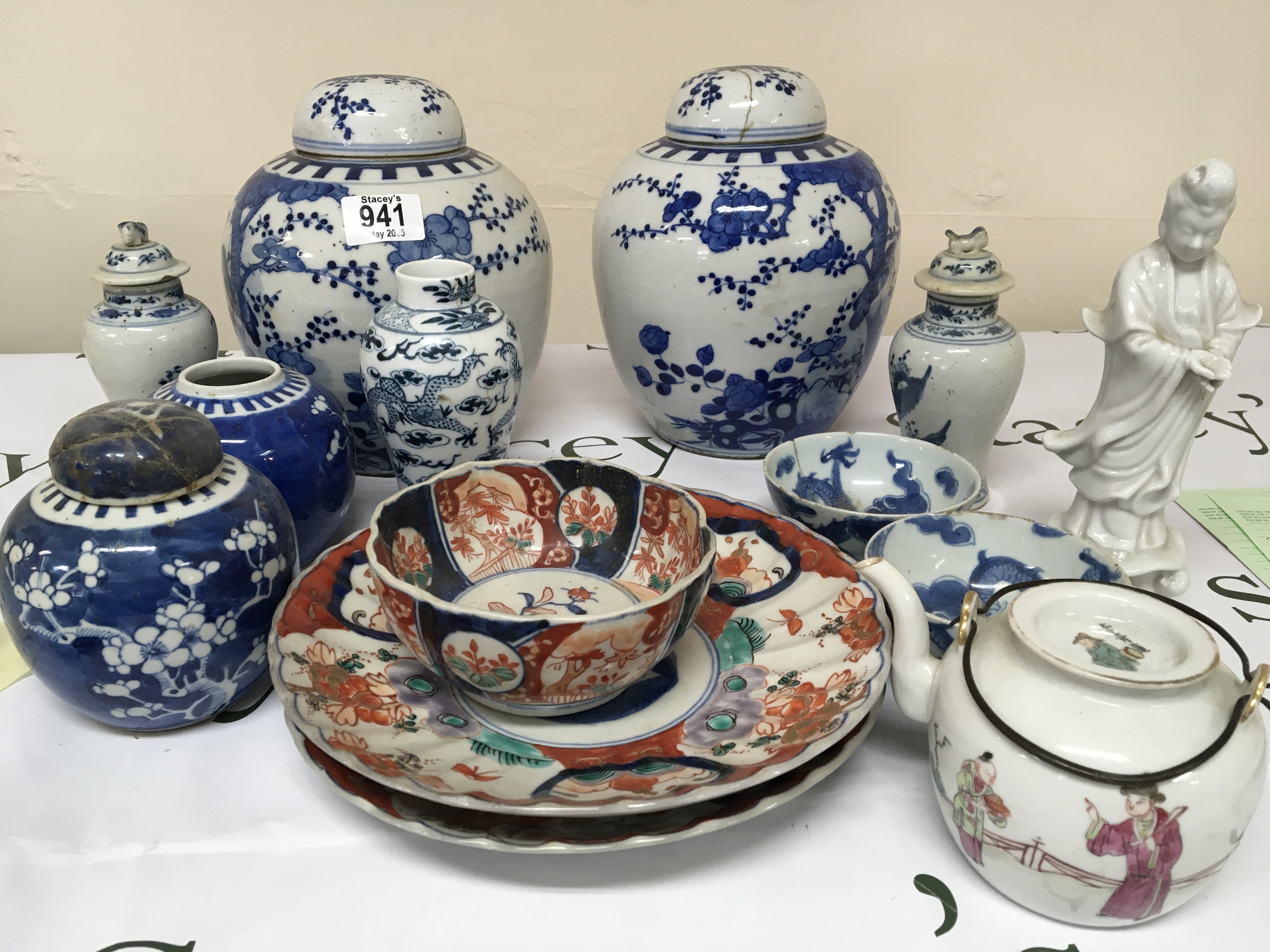 A pair of Chinese porcelain 19th century Export blue and white ginger jars and other Chinese ceramics and Japanese Imari damaged.
