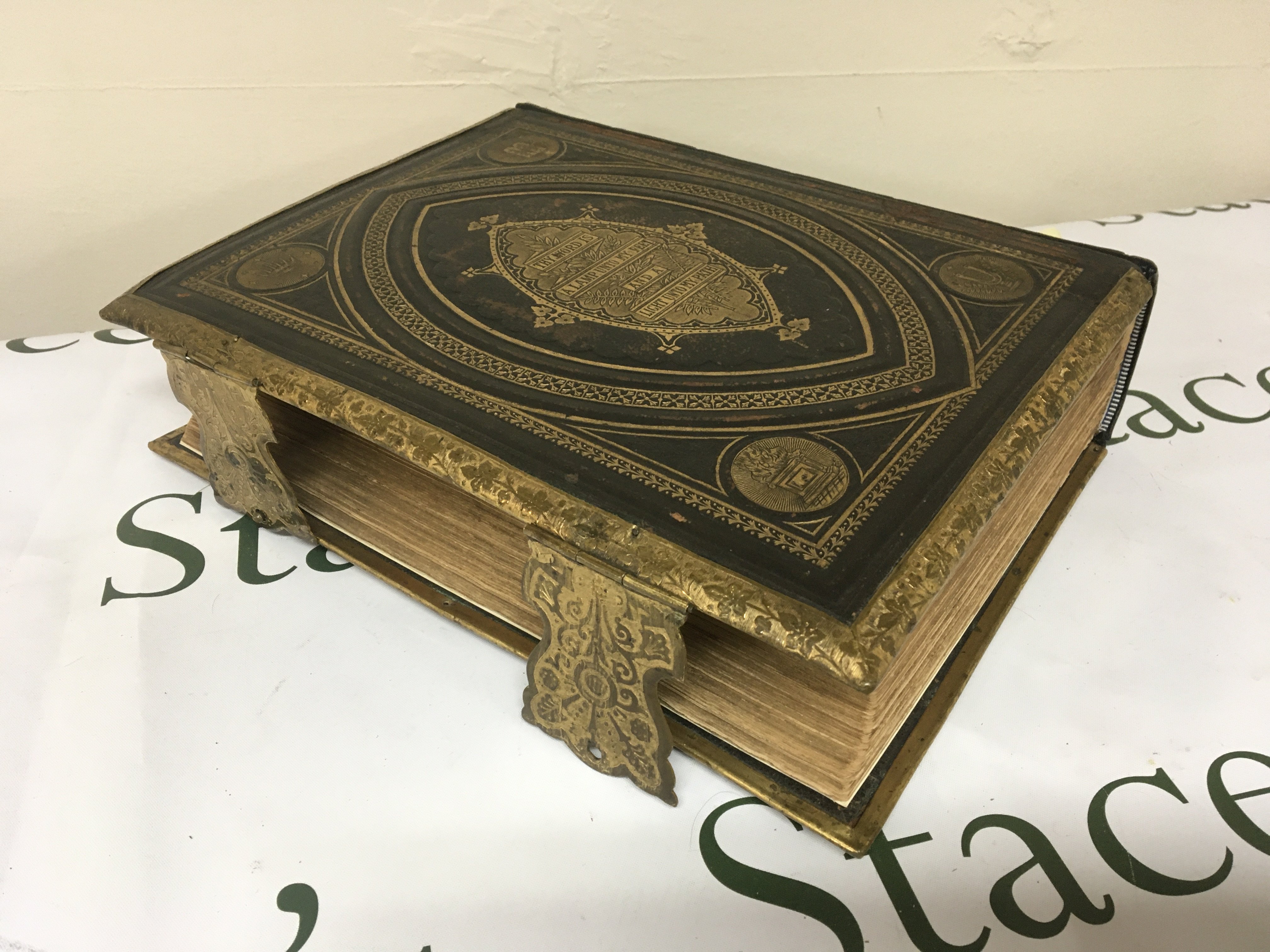 A large Victorian family Bible with brass side clips and edge and ornate embossed leather cover.