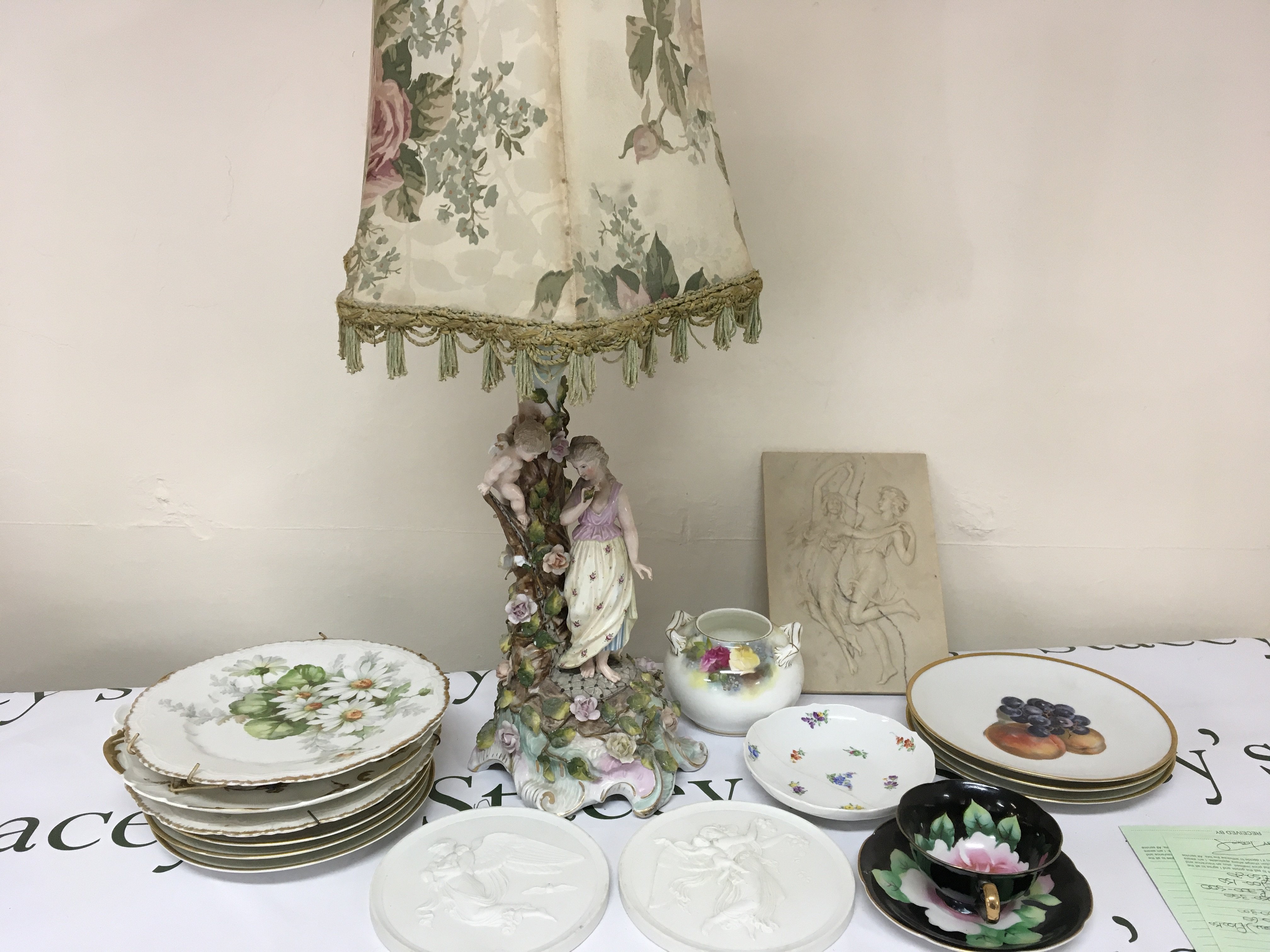 A porcelain lamp surmounted with figures (damaged) two Royal Copenhagen porcelain plaques decorative plates and other ceramics.