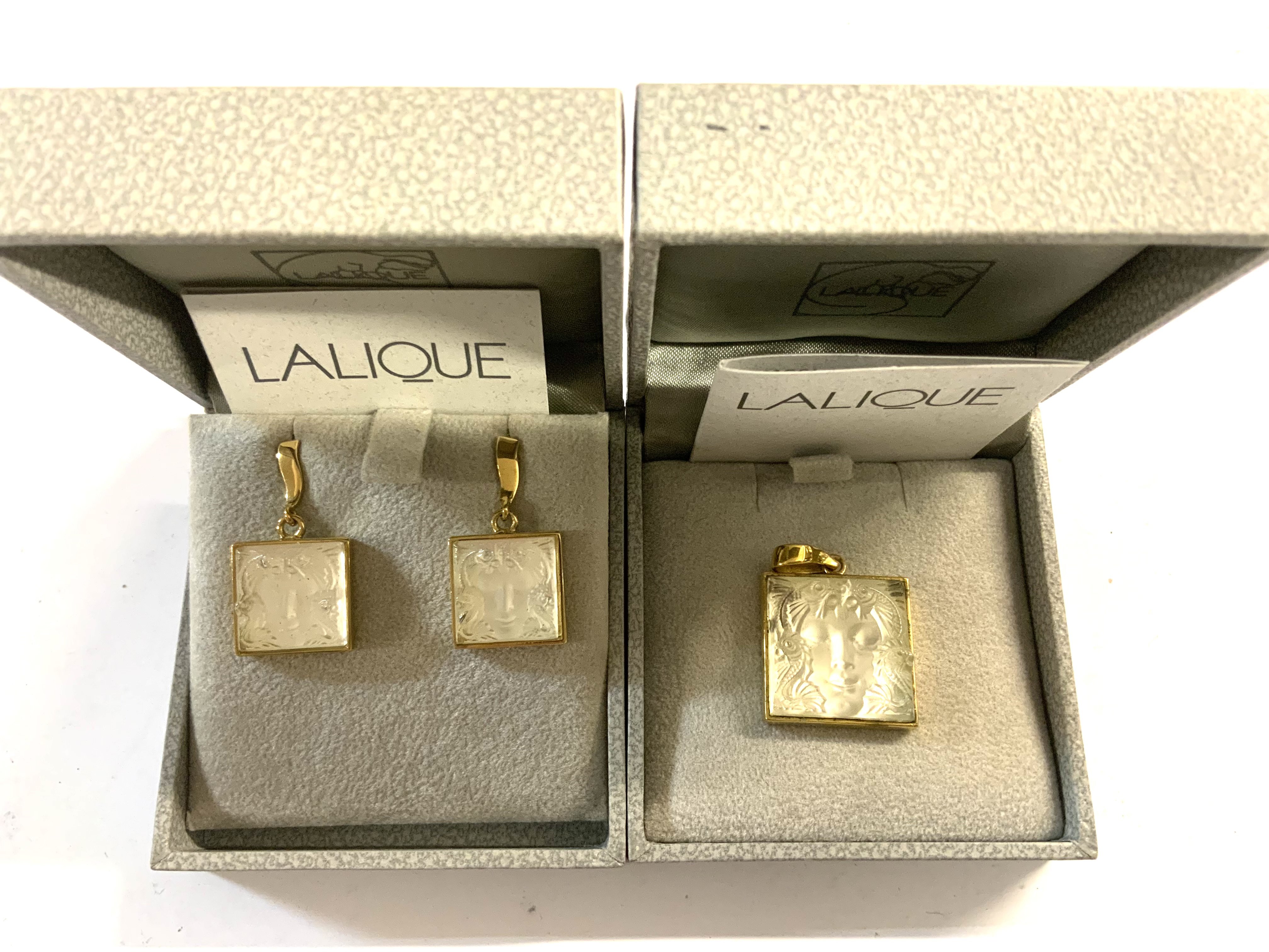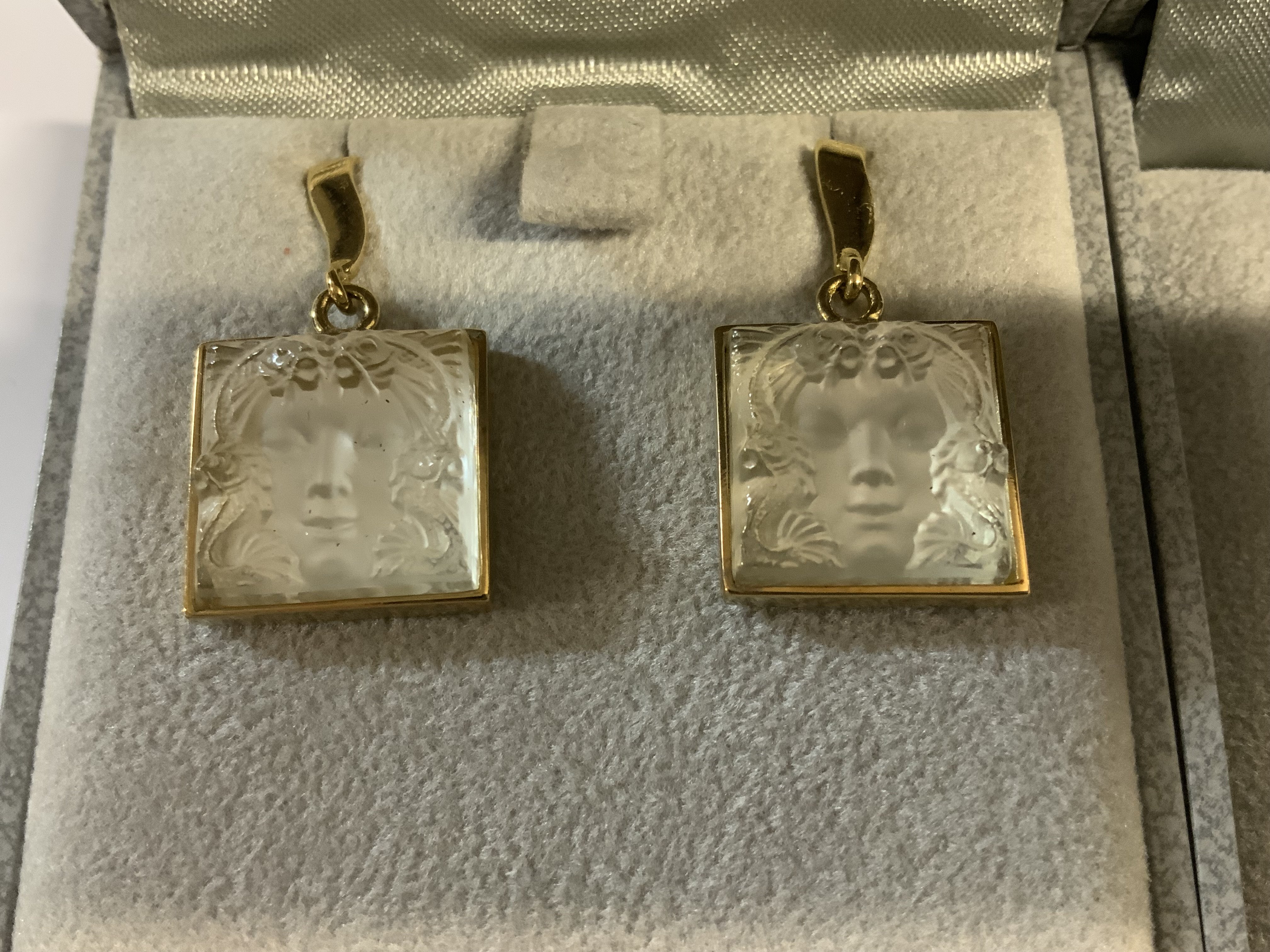 LALIQUE "MASQUE DE FEMME" CRYSTAL PENDANT & EARRINGS Mid-20th Century Raised woman's face surrounded by Ocean Life, mounted on a gold-plated 1.25" square. Marked "Lalique" and stamped on reverse.