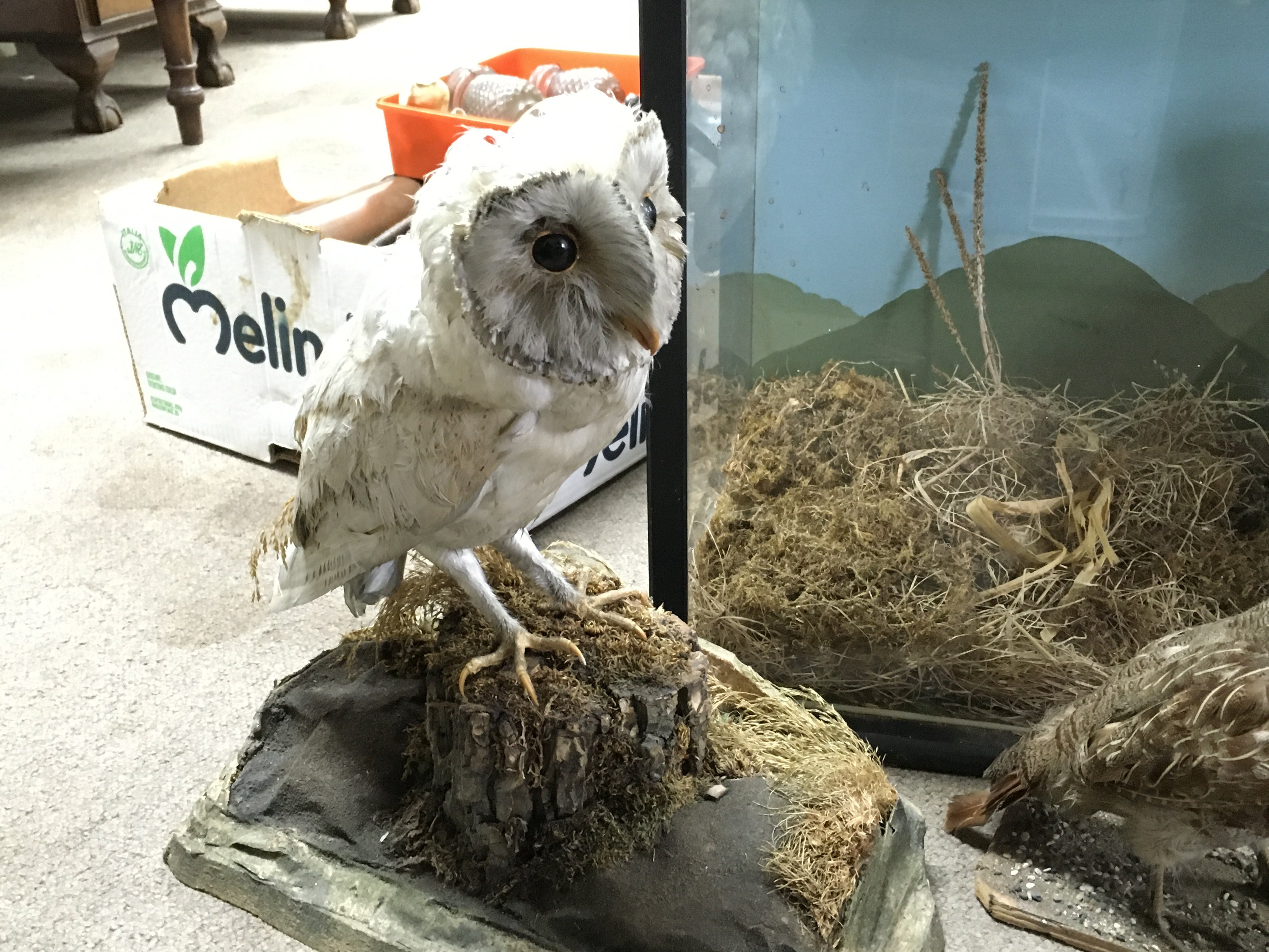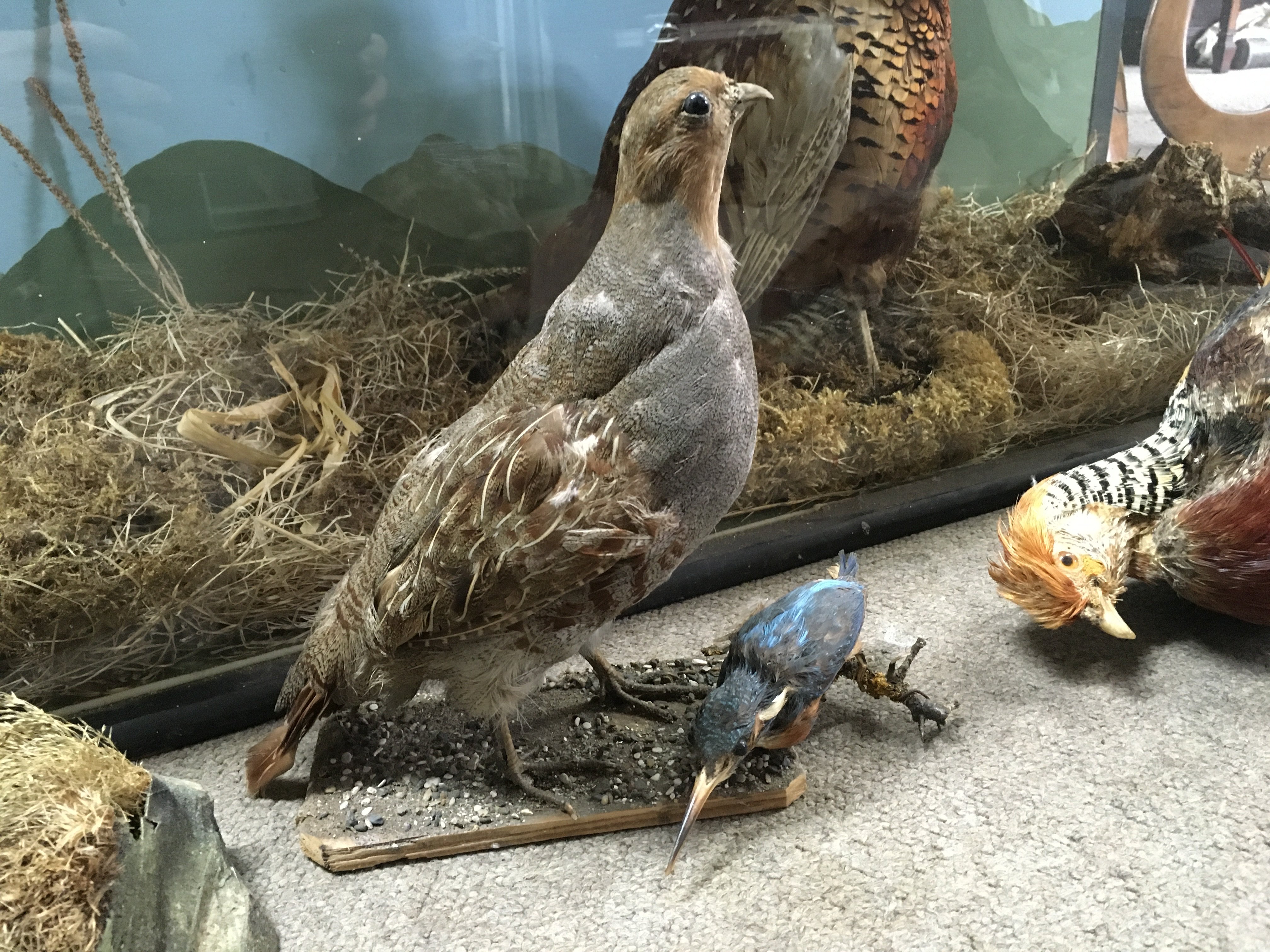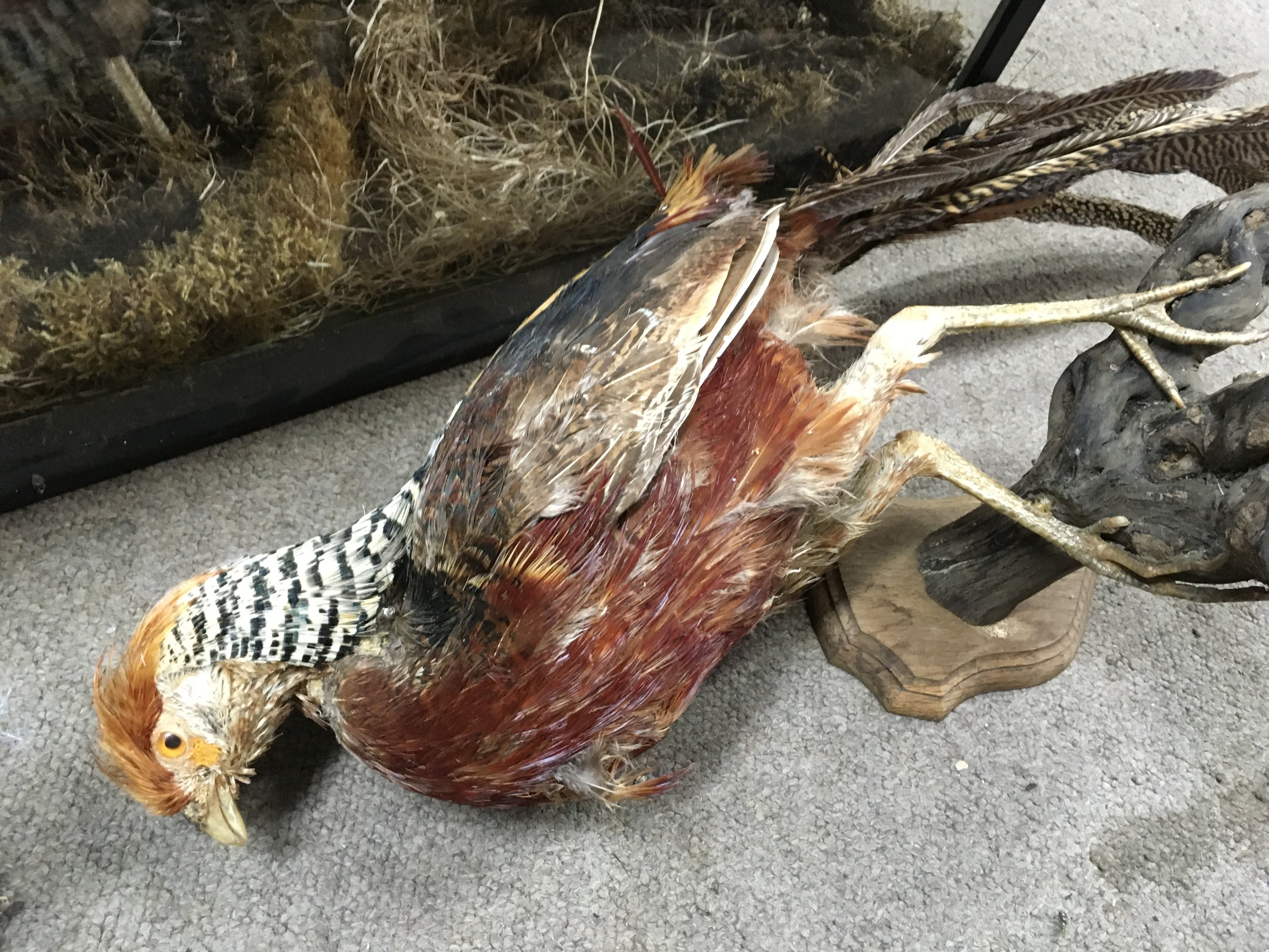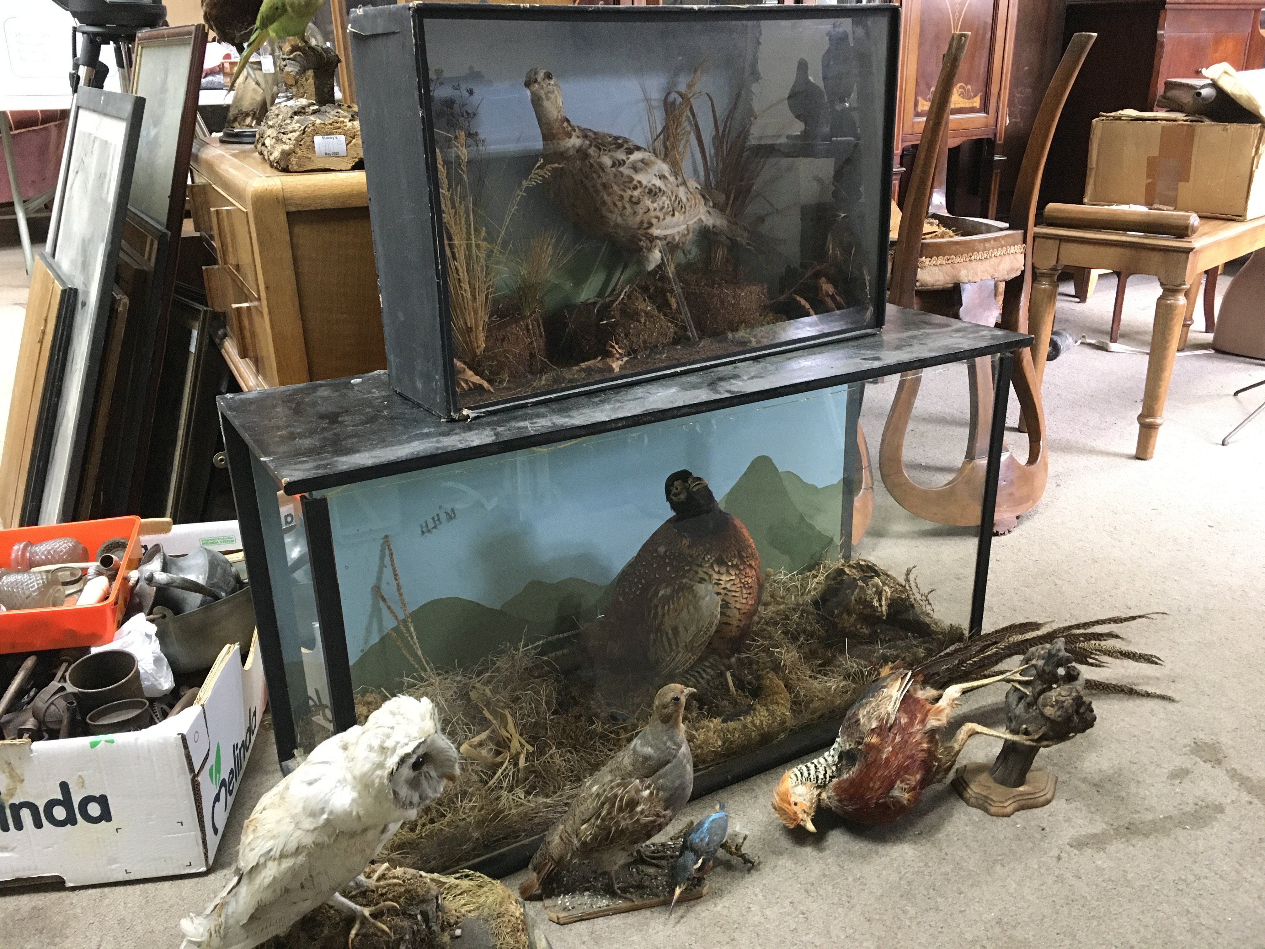 A collection of taxidermy birds including a golden pheasant ,cased Pheasant, Partridge, barn owl, kingfisher. This lot cannot be posted