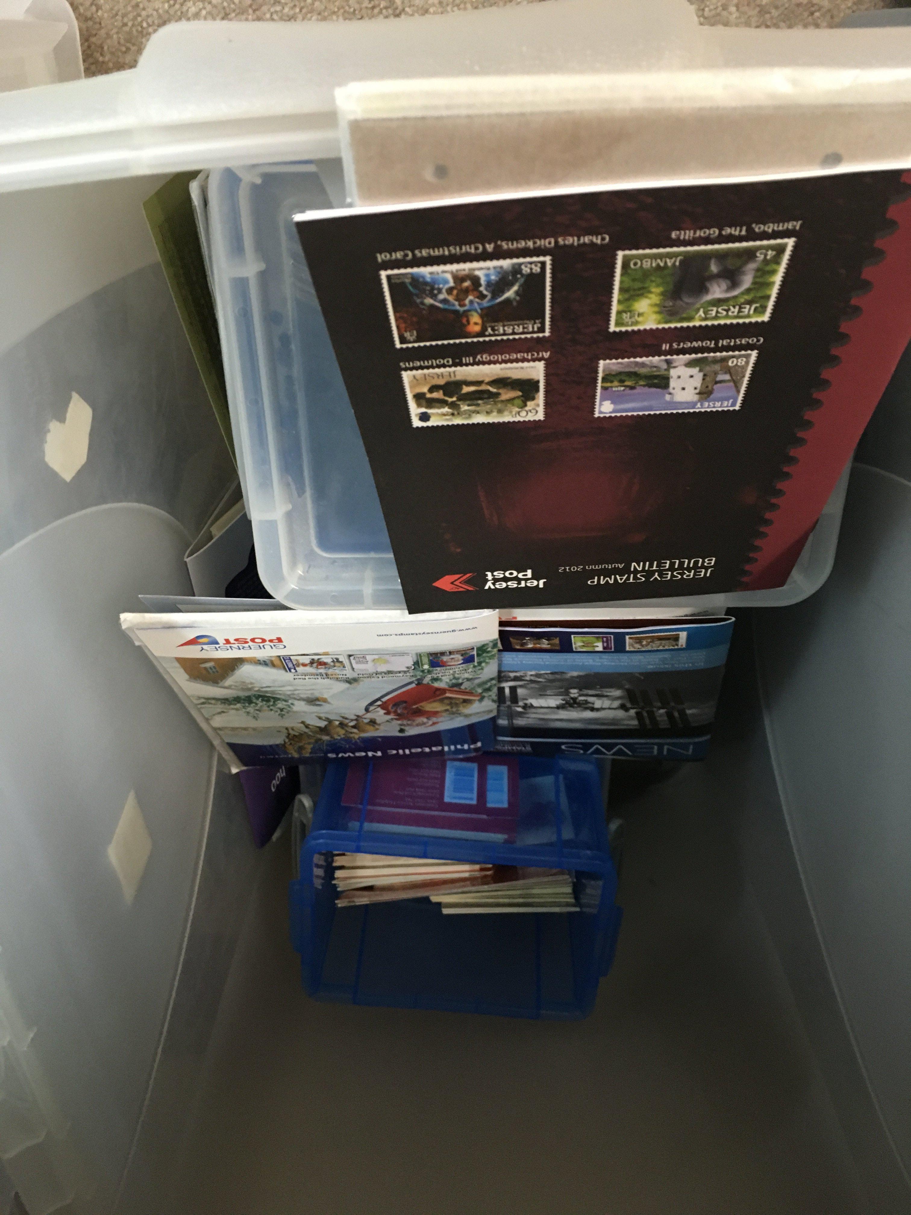 A box containing GB Stamps including presentation stamps Guernsey and jersey .