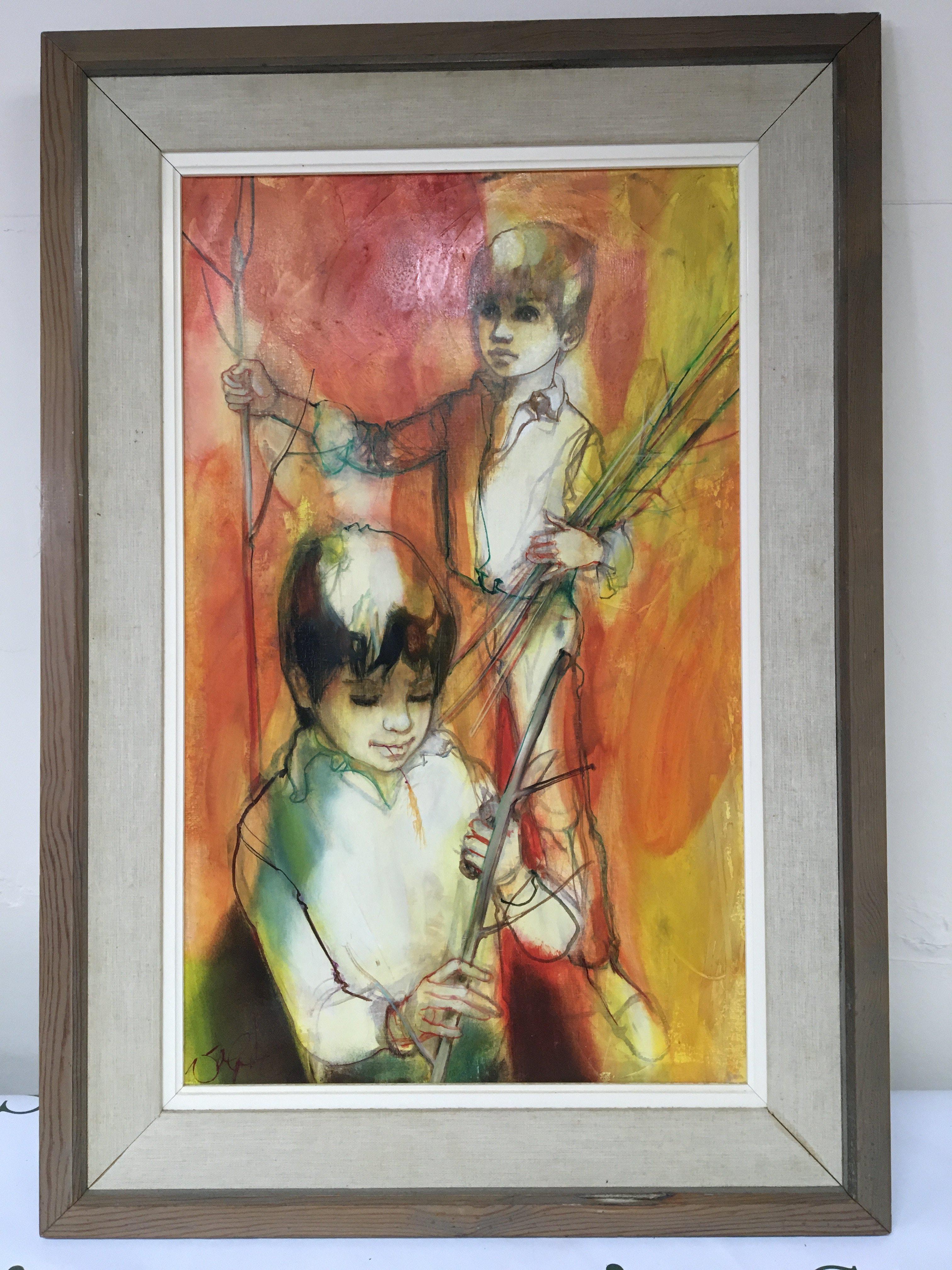 A modern mid 20th century oil painting study of two boys collecting sticks on a vivid orange ground. Signed lower left and attributed to Jean-Baptiste Valadie (b1933) 53x78cm