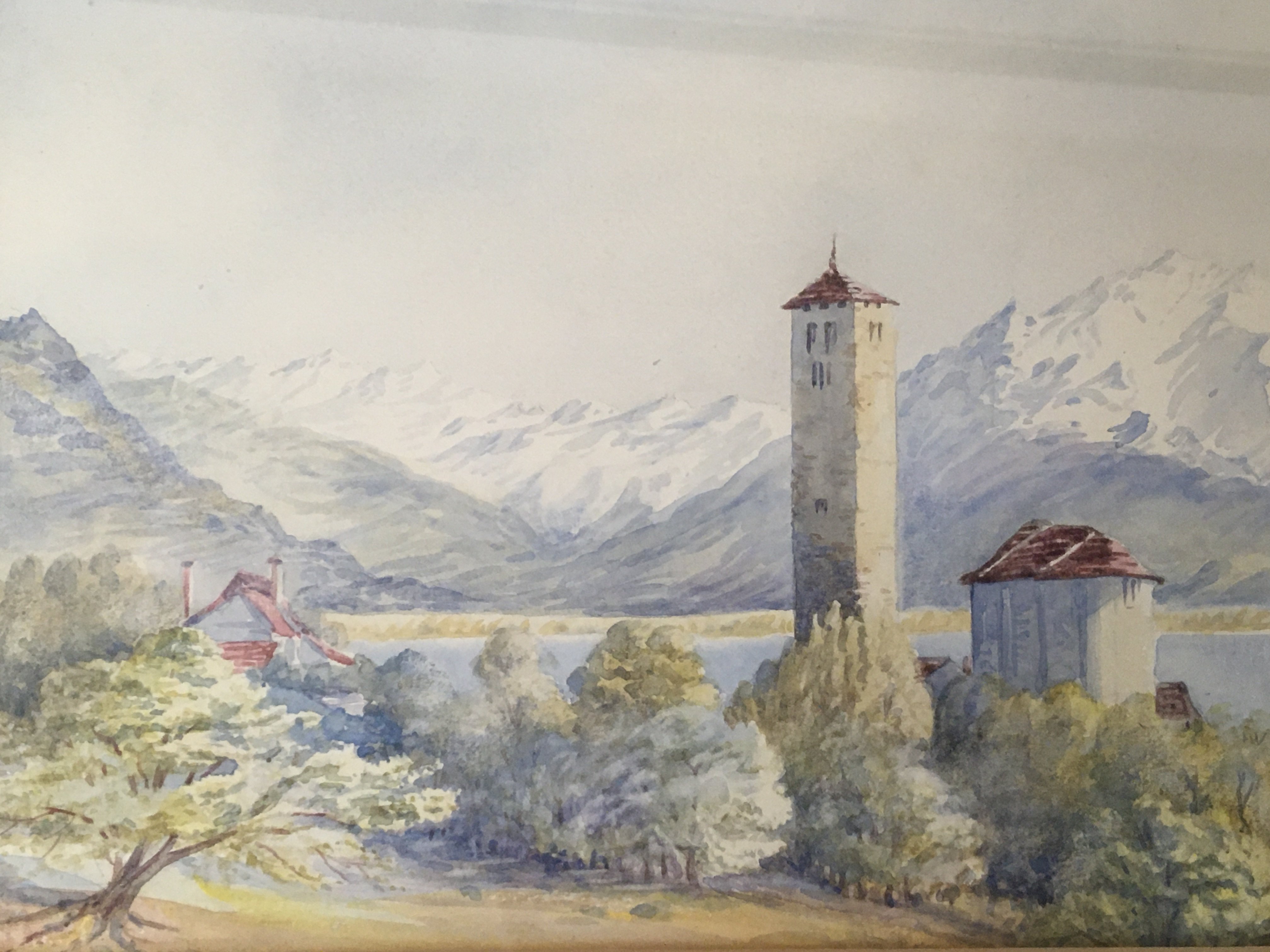 A small Continental watercolour a view over lake Aorta Italy with mountains over a lake. 42x33cm