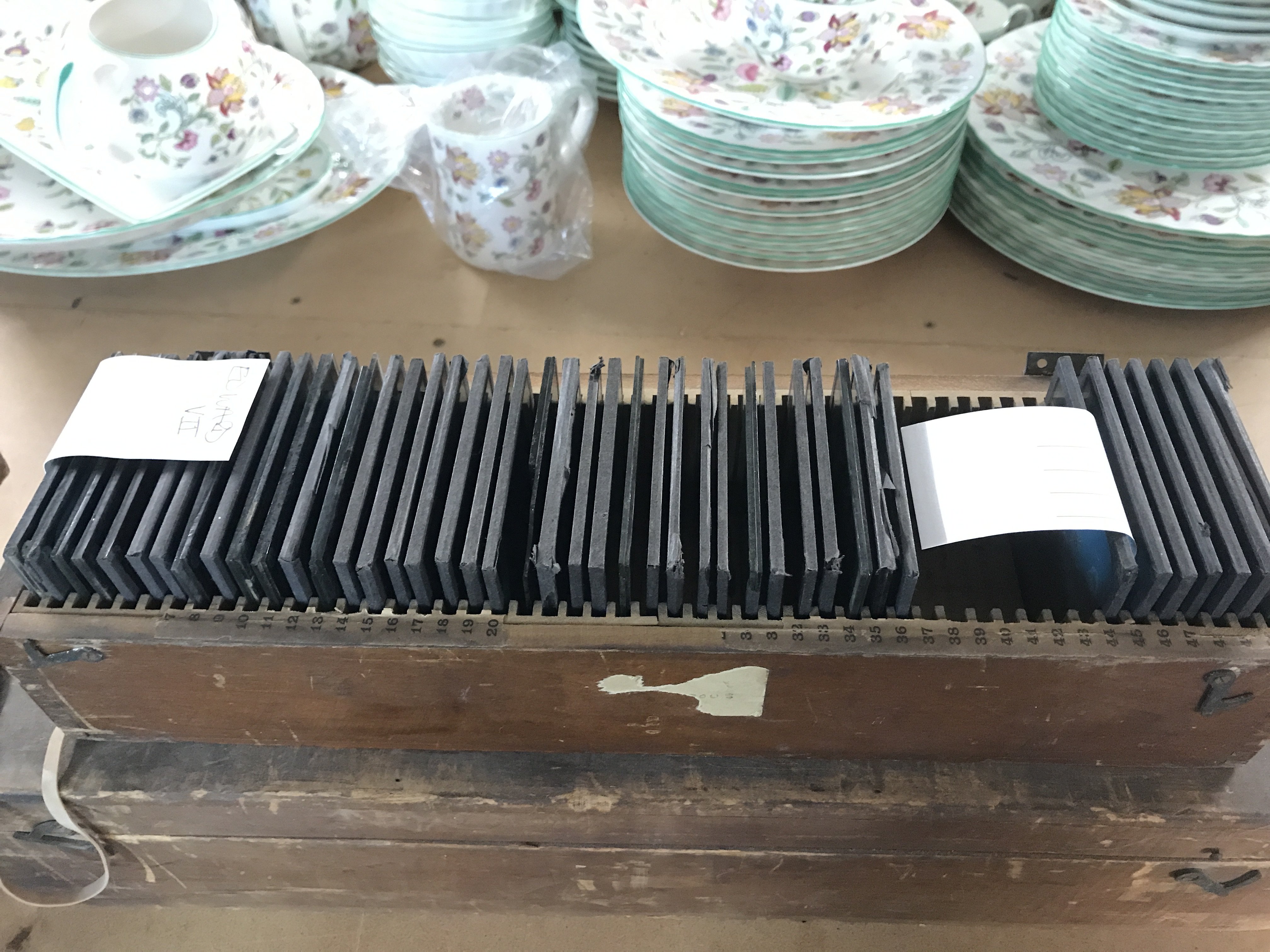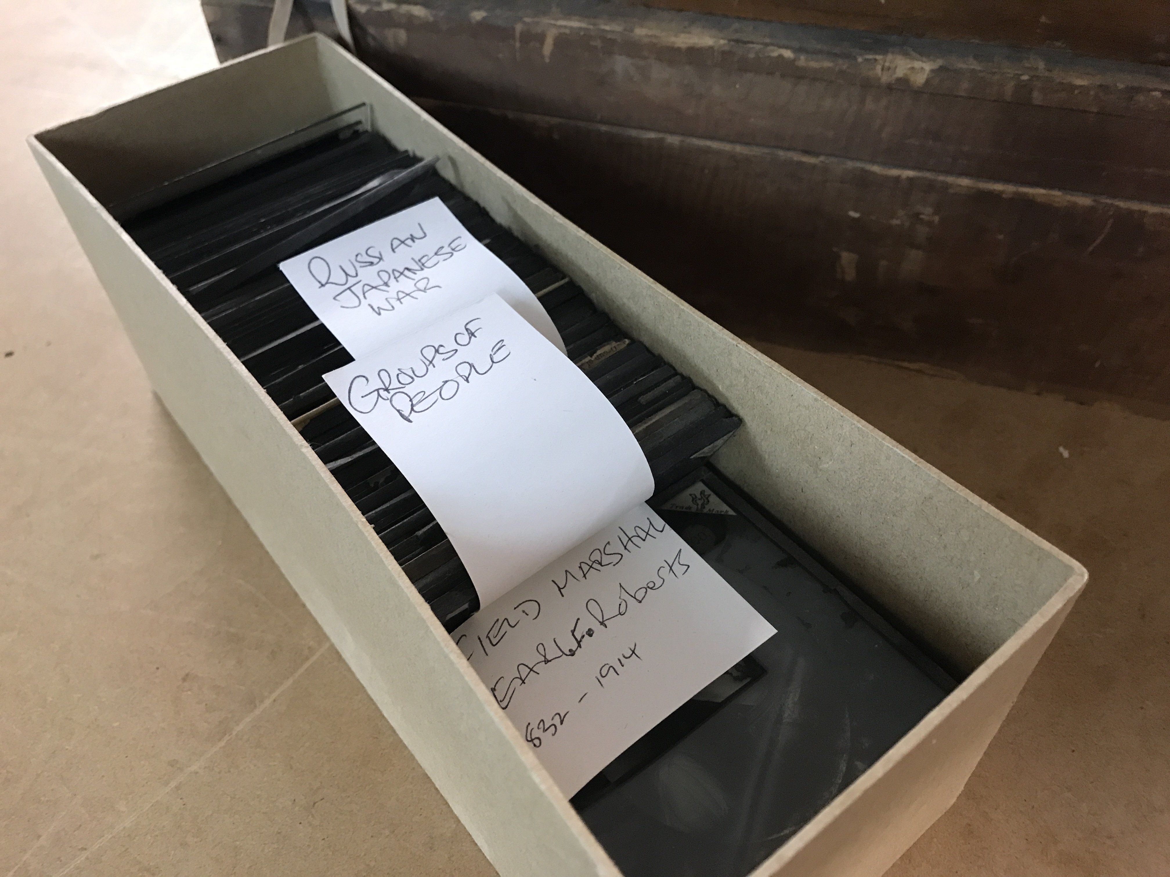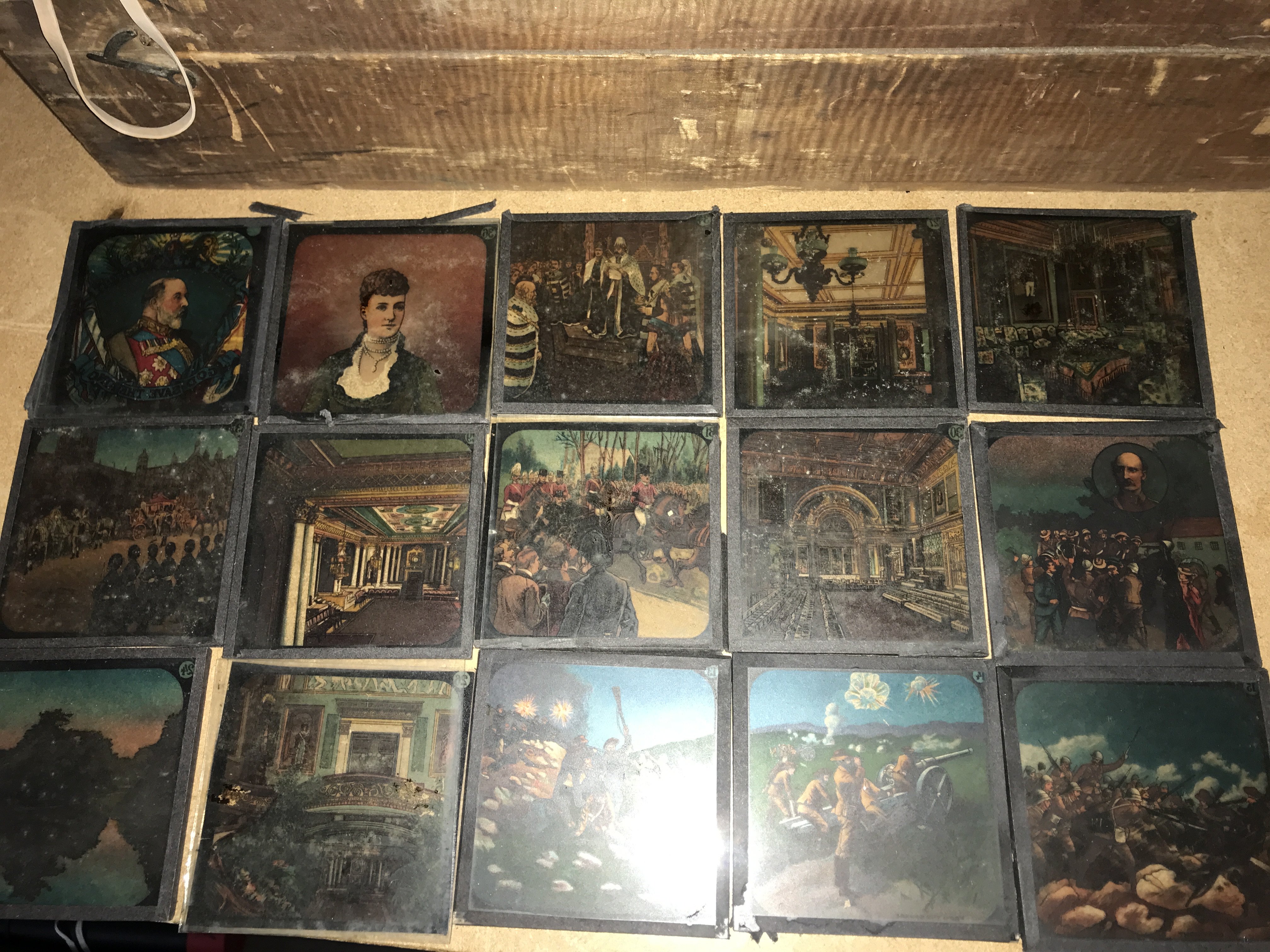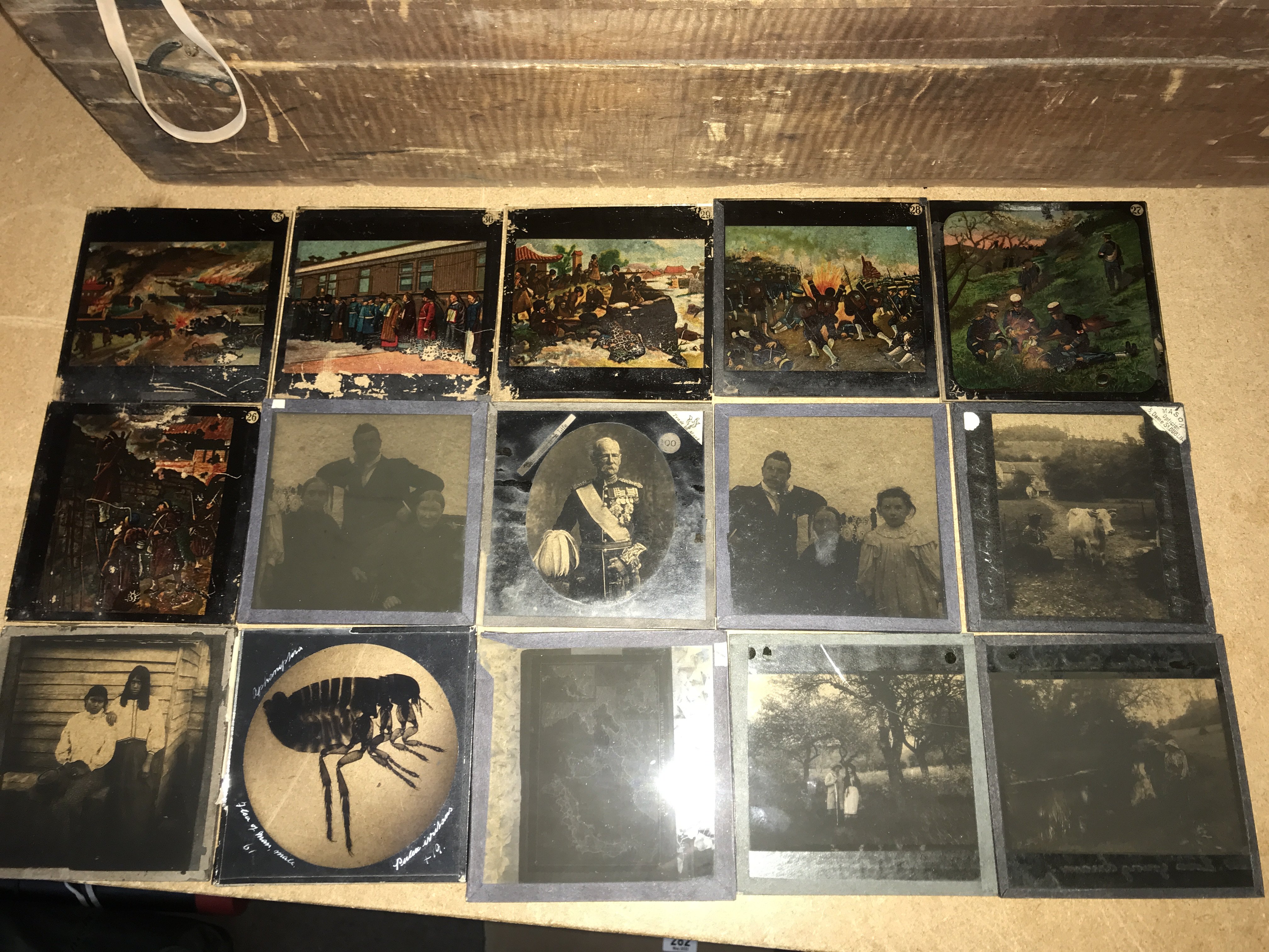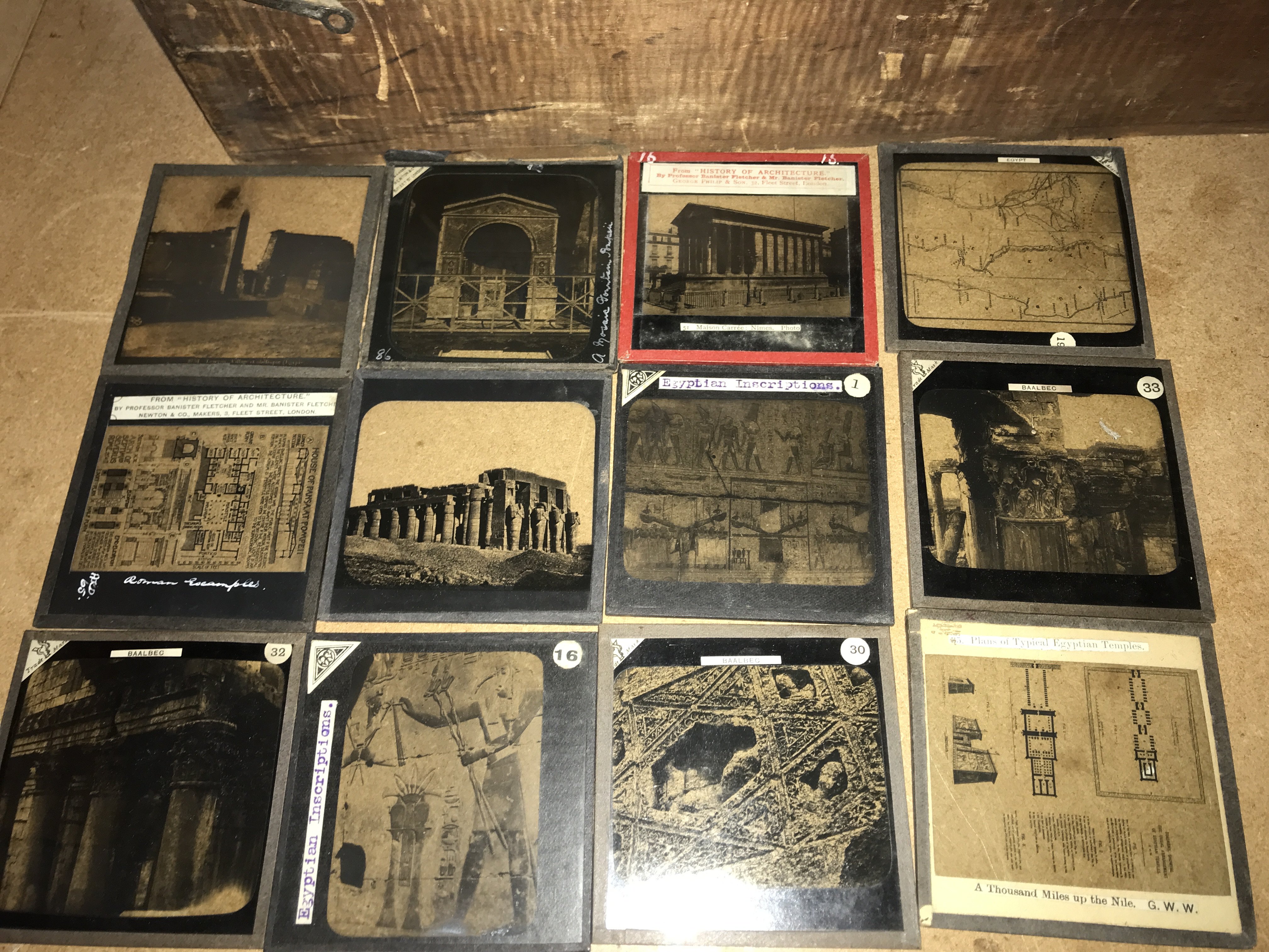 Cases of vintage magic lantern slides of various subjects including Russo Japanese war, Transvaal war, pictures of Egypt, France, Baalbek.