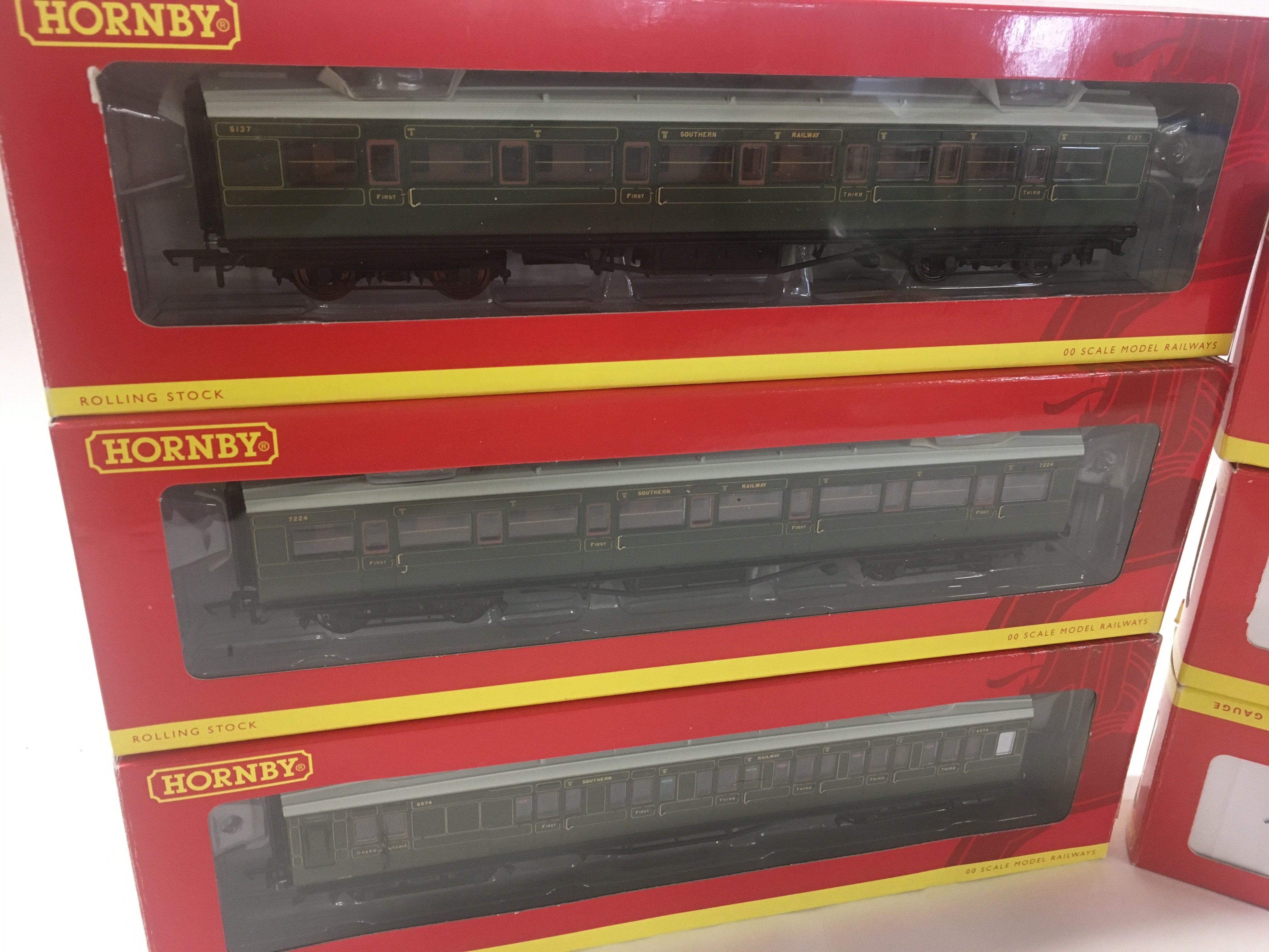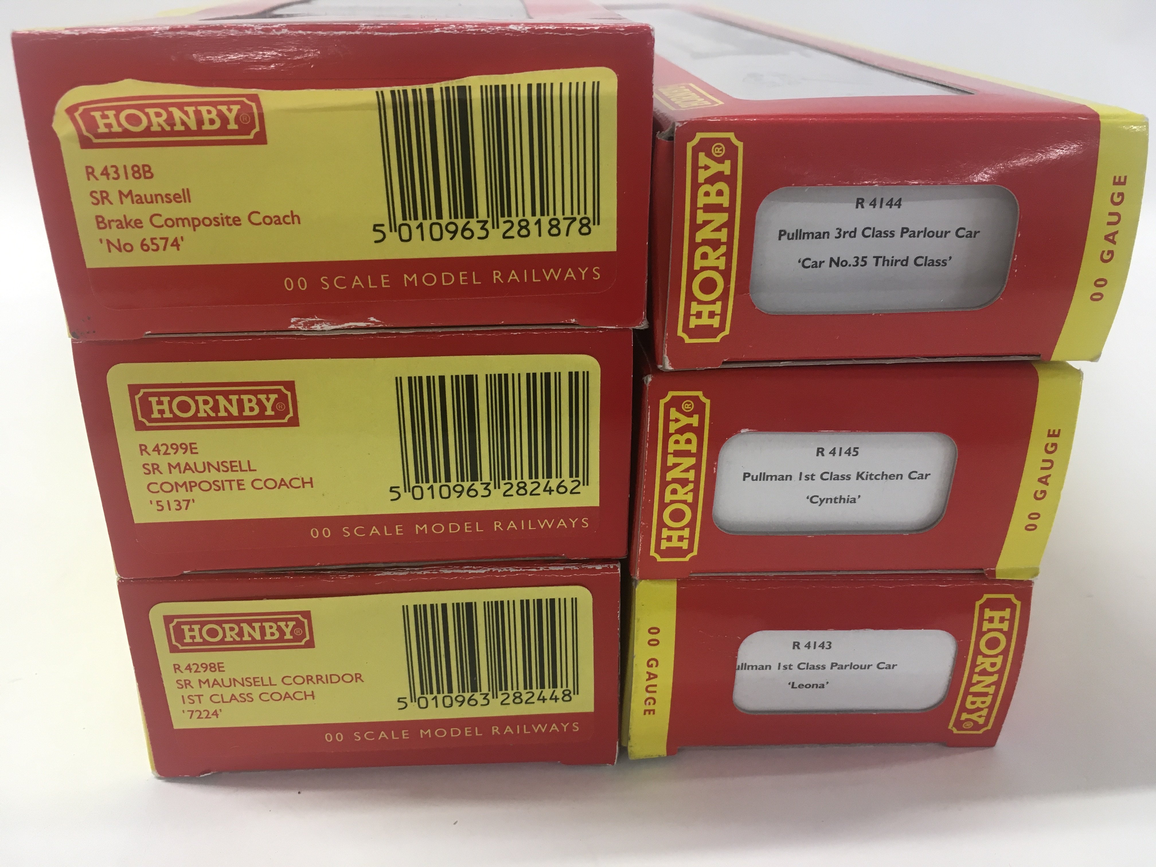 6 x boxed Hornby 00 gauge coaches. R43188..R4299E..R4298E..R4144..R4145..R4143. No reserve